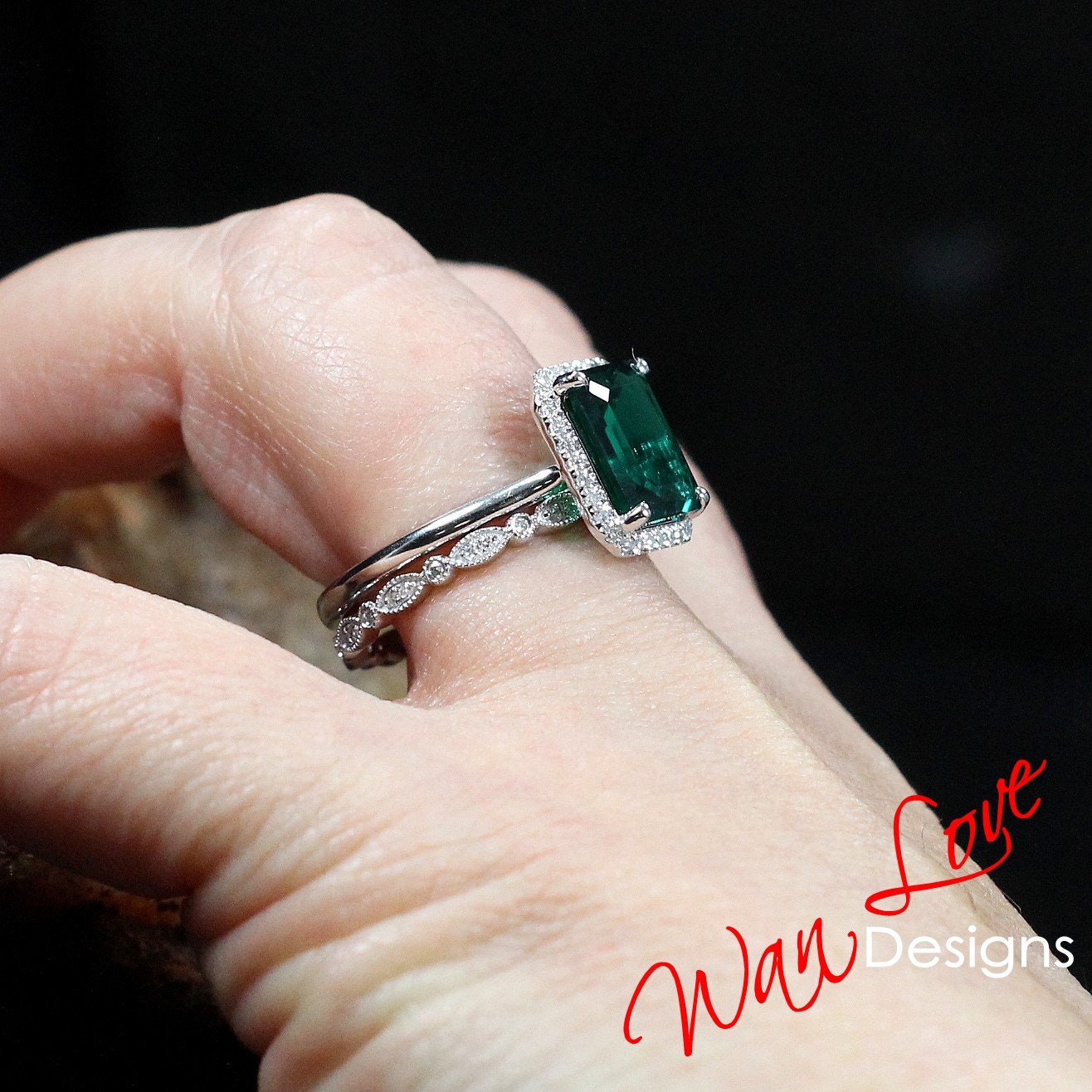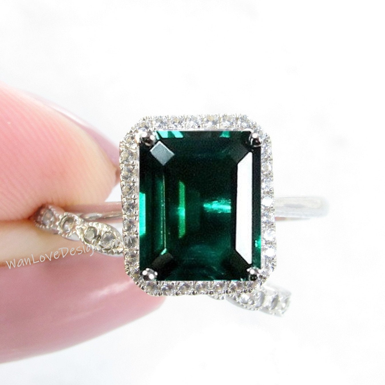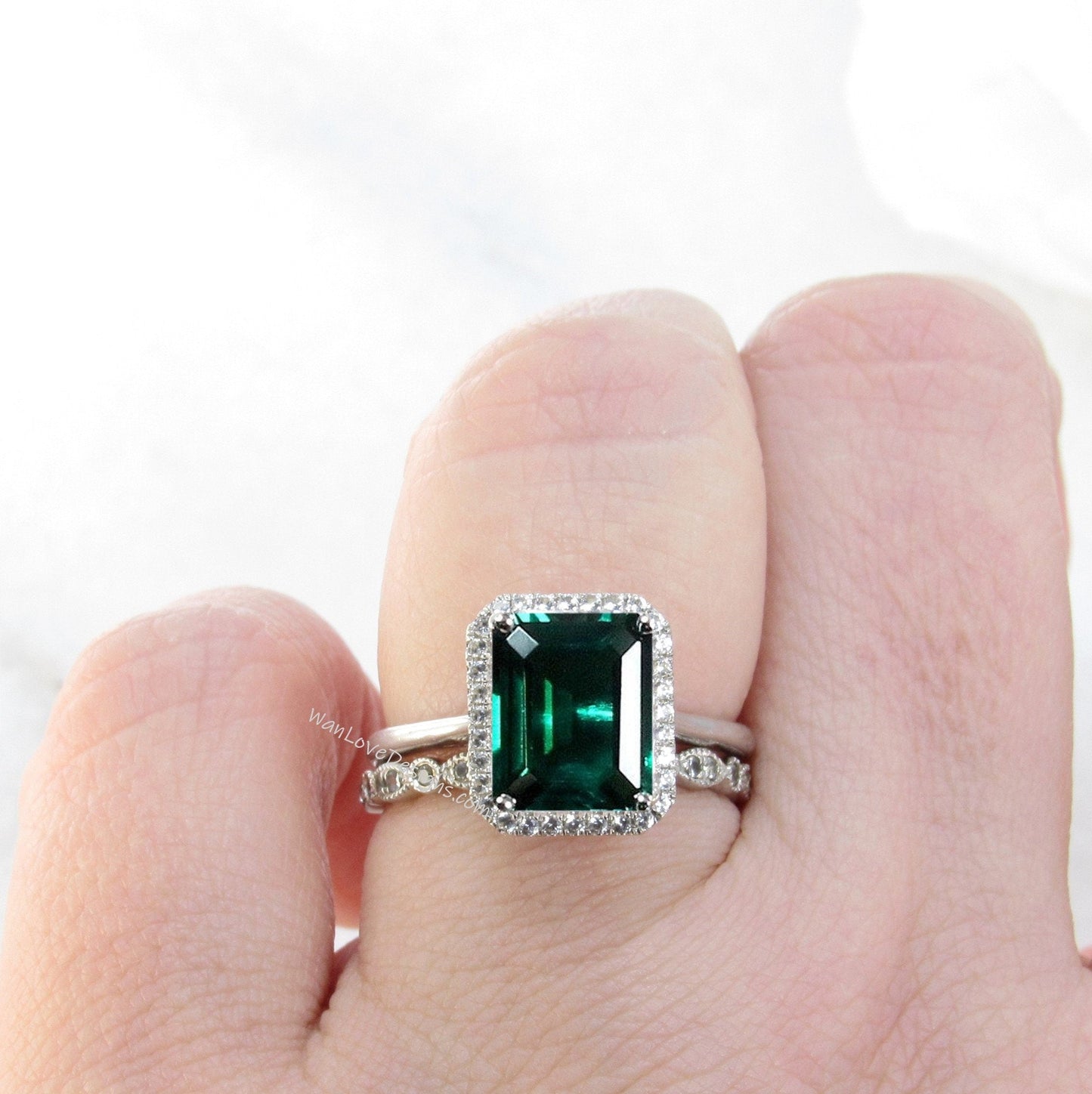 Set di anelli di fidanzamento con smeraldo e diamanti Halo, Milgrain, foglia, fede nuziale per l'eternità completa, personalizzato, oro rosa giallo bianco 14k-platino