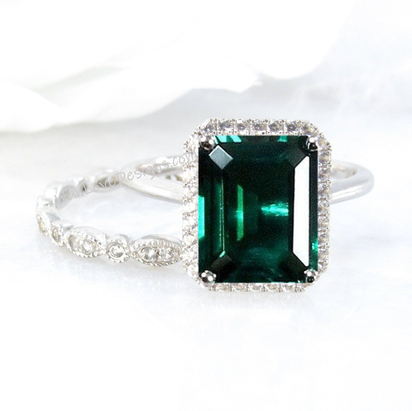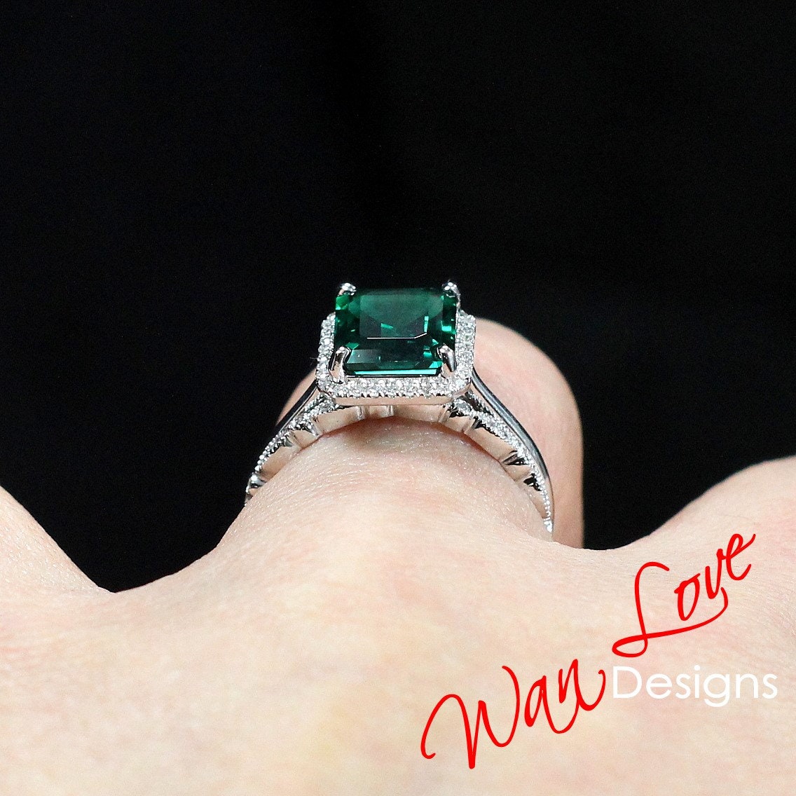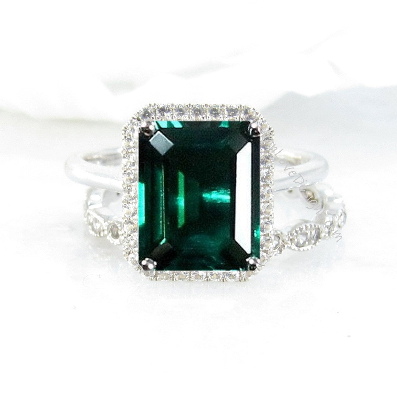 Set di anelli di fidanzamento con smeraldo e diamanti Halo, Milgrain, foglia, fede nuziale per l'eternità completa, personalizzato, oro rosa giallo bianco 14k-platino