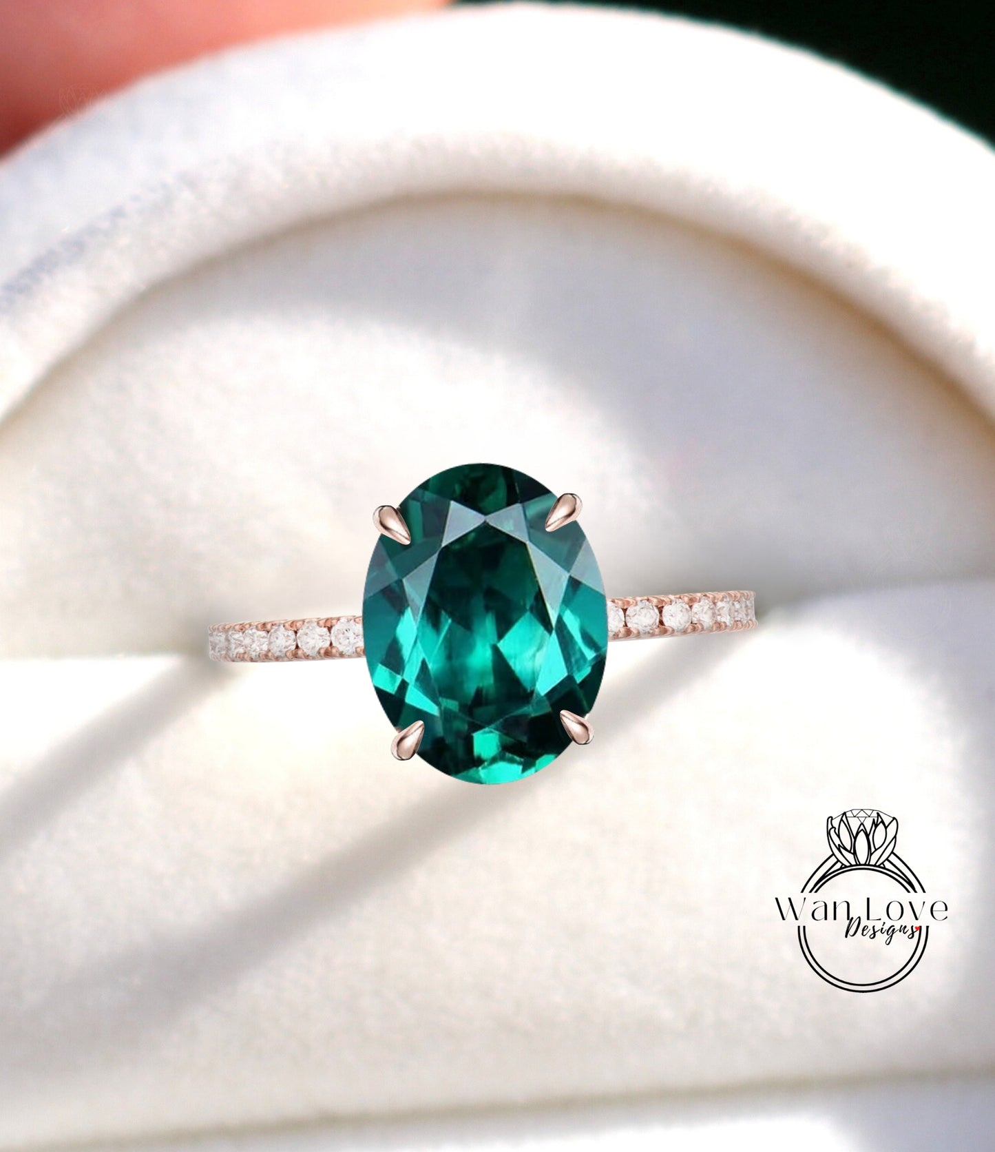 Anello di fidanzamento con smeraldo unico Anello vintage con diamante a taglio ovale laterale in oro bianco, pietra portafortuna nuziale, anello di promessa per anniversario