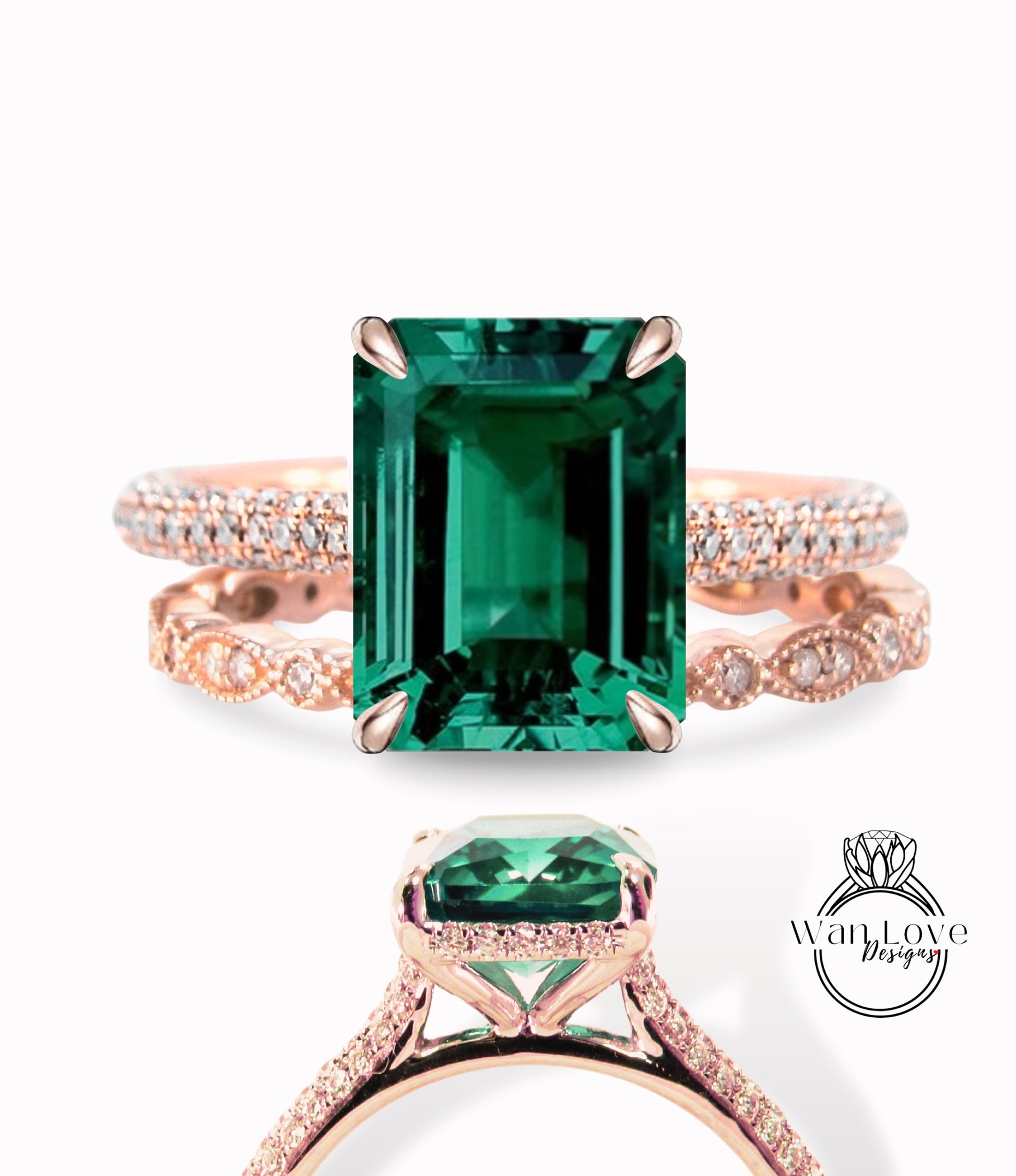 Set di anelli di fidanzamento radianti con smeraldo e diamante, fede nuziale Milgrain Leaf Eternity, stile celebrità, su misura, regalo di anniversario