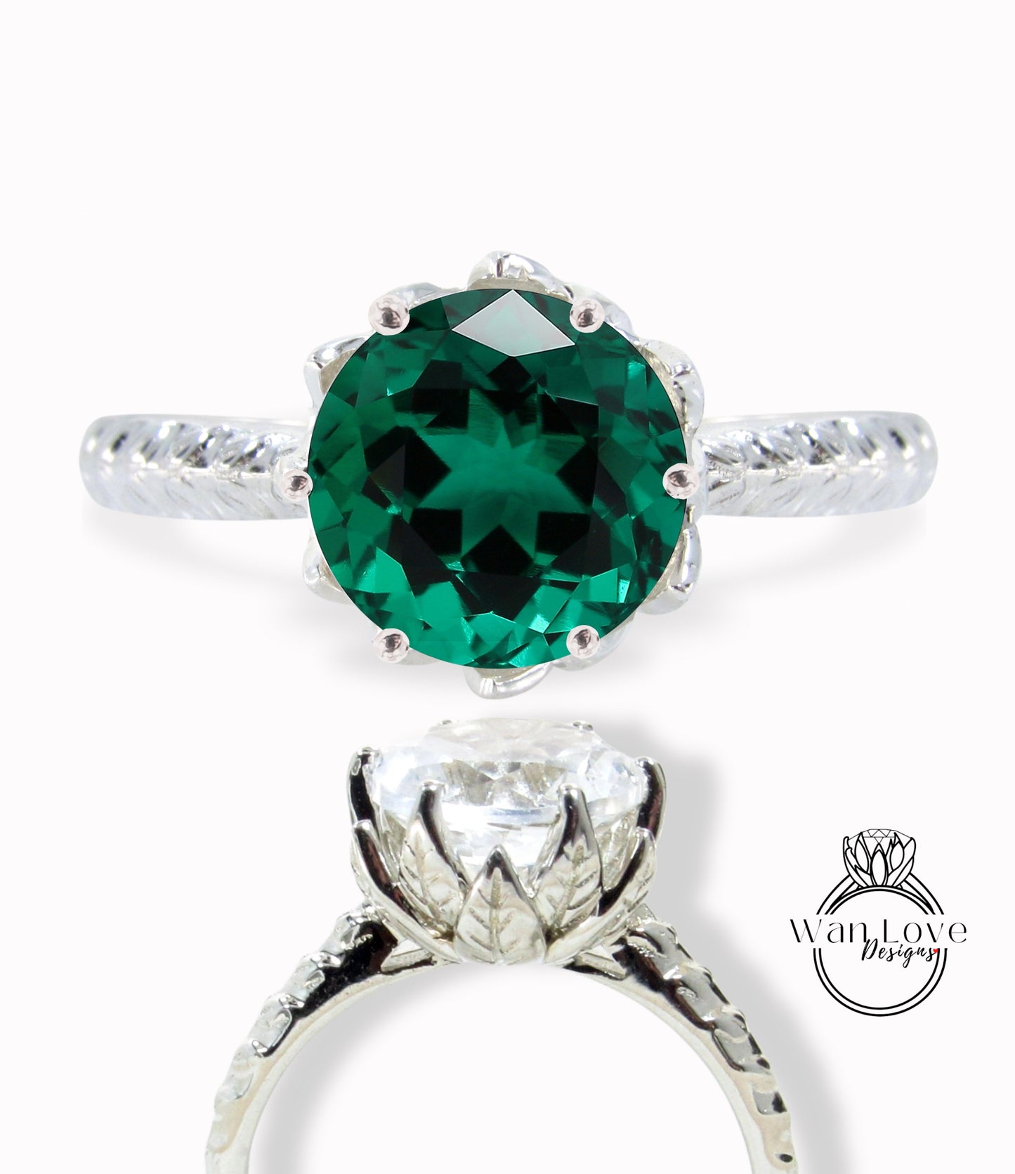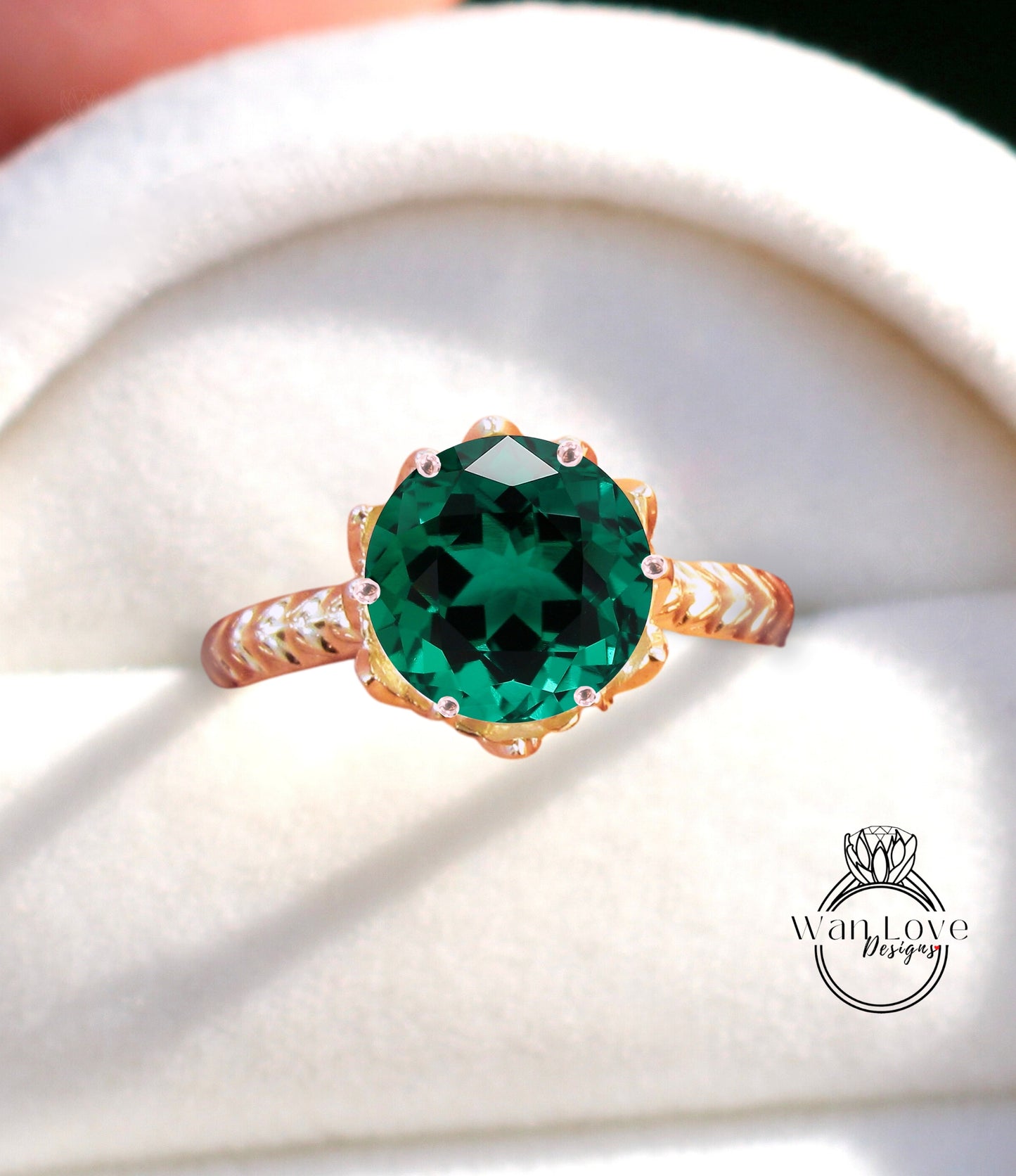 Anello di fidanzamento con smeraldo a taglio rotondo, anello di fidanzamento vintage con fiore di loto, anello con foglia naturale, anello da sposa unico, regalo di anniversario