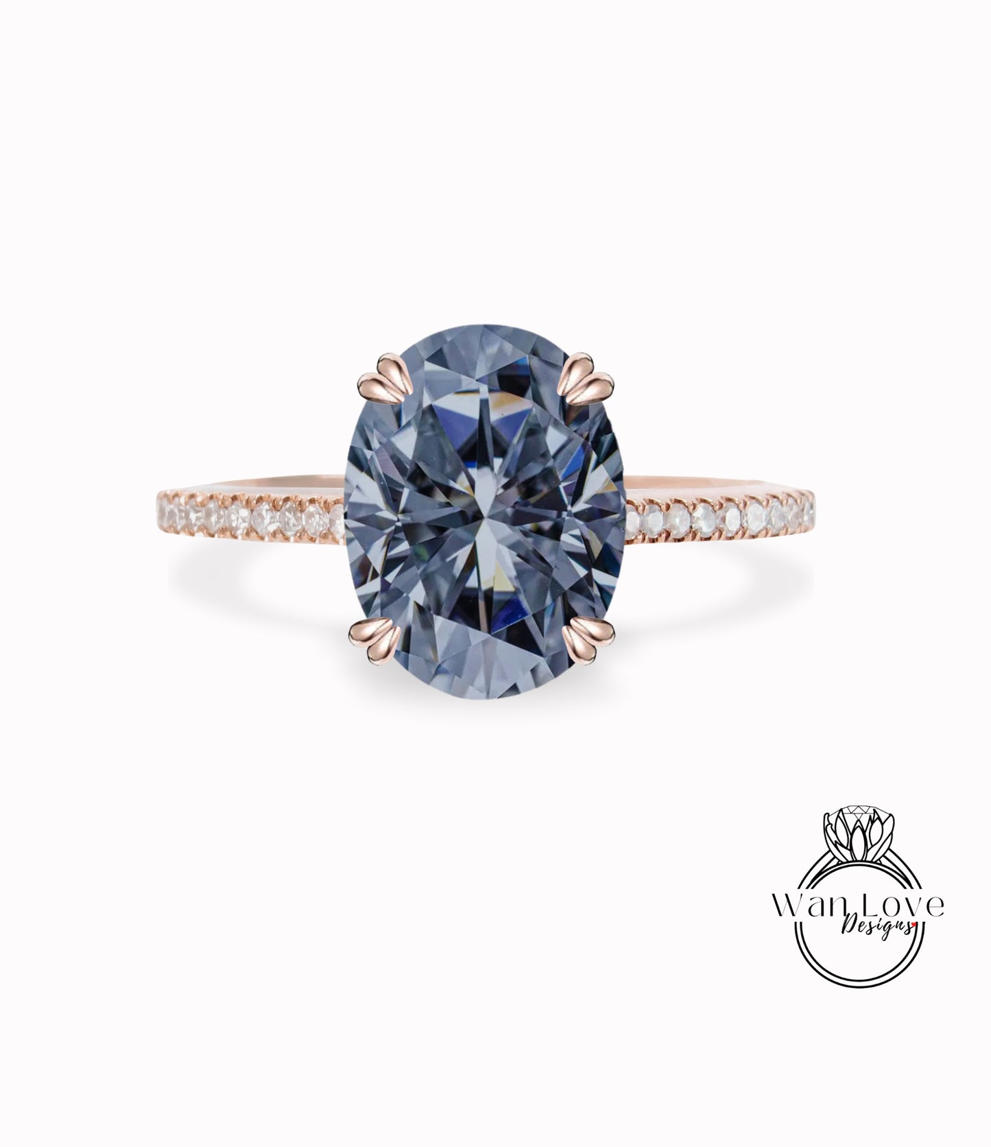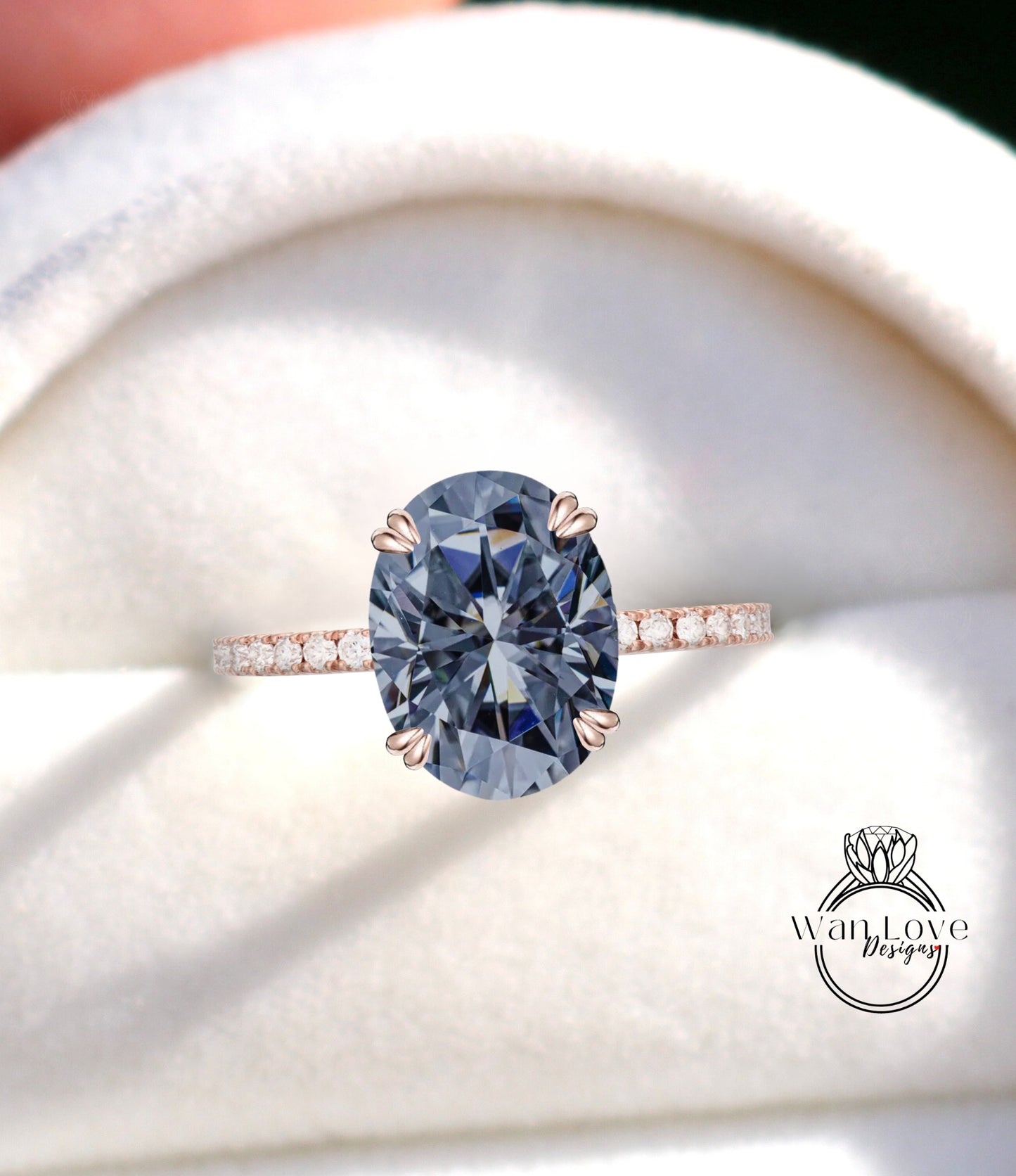 Anello di fidanzamento ovale grigio Moissanite Anello di fidanzamento minimal in oro rosa antico Fascia di diamanti Art Deco Delicato anello nuziale Anello di promessa di anniversario