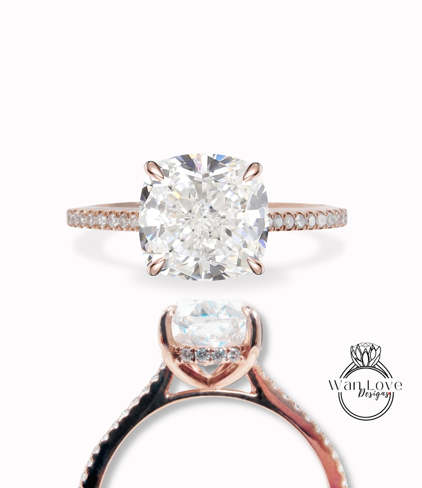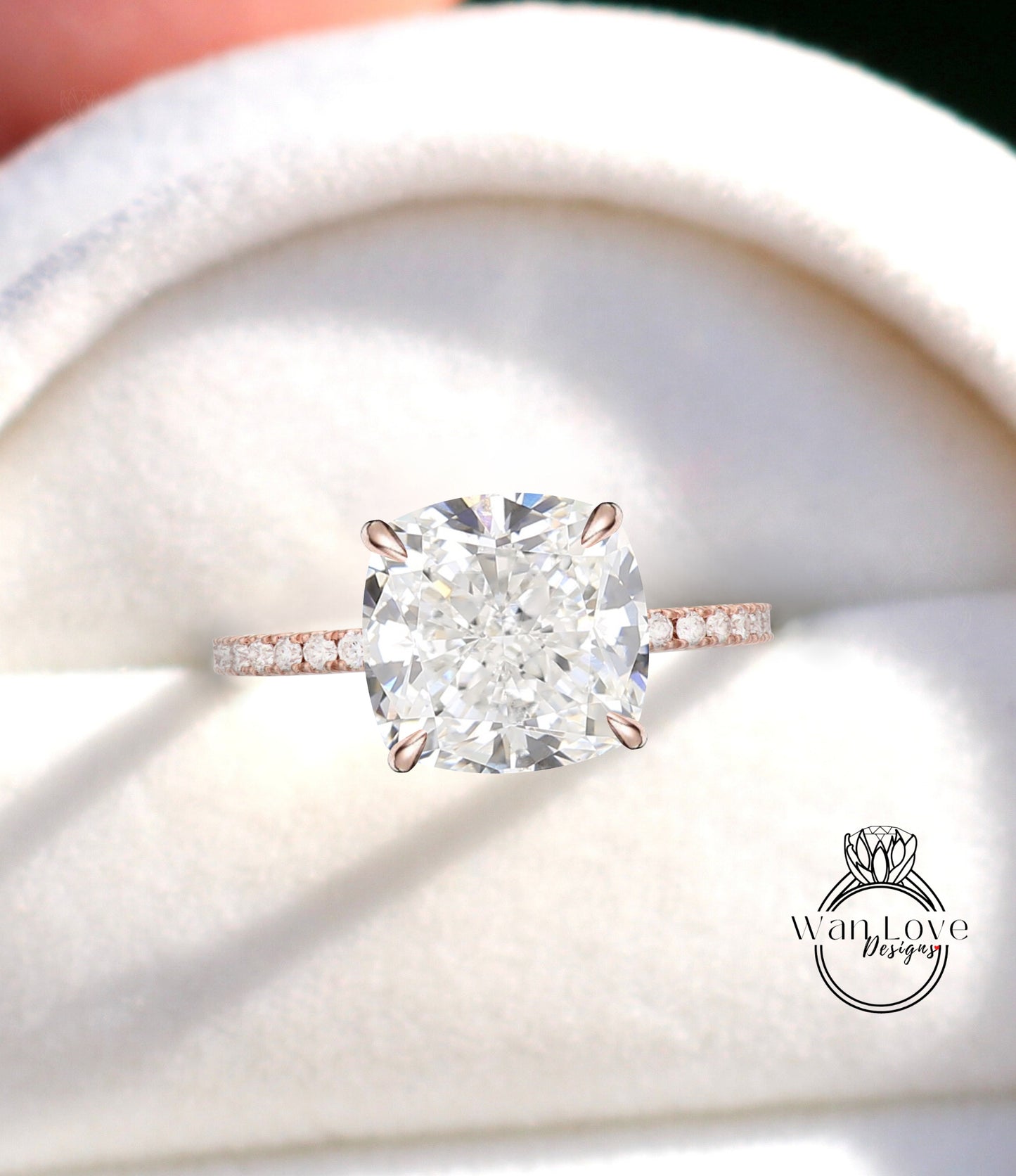 Anello di fidanzamento con alone laterale con diamante taglio cuscino Anello di fidanzamento vintage in oro bianco Lab Diamond autentico Mezza eternità Regalo per l'anniversario nuziale