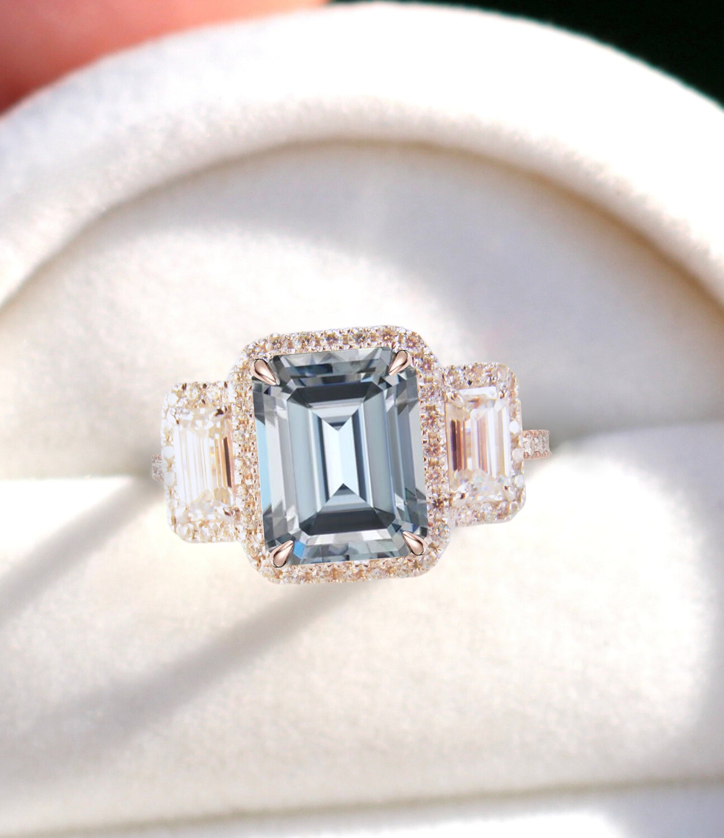 Anello Baguette con Moissanite Grigio Smeraldo Halo e Diamanti, Anello di fidanzamento Art Déco, Anello con pietra laterale con diamante, Anello con tre pietre Halo con diamante.
