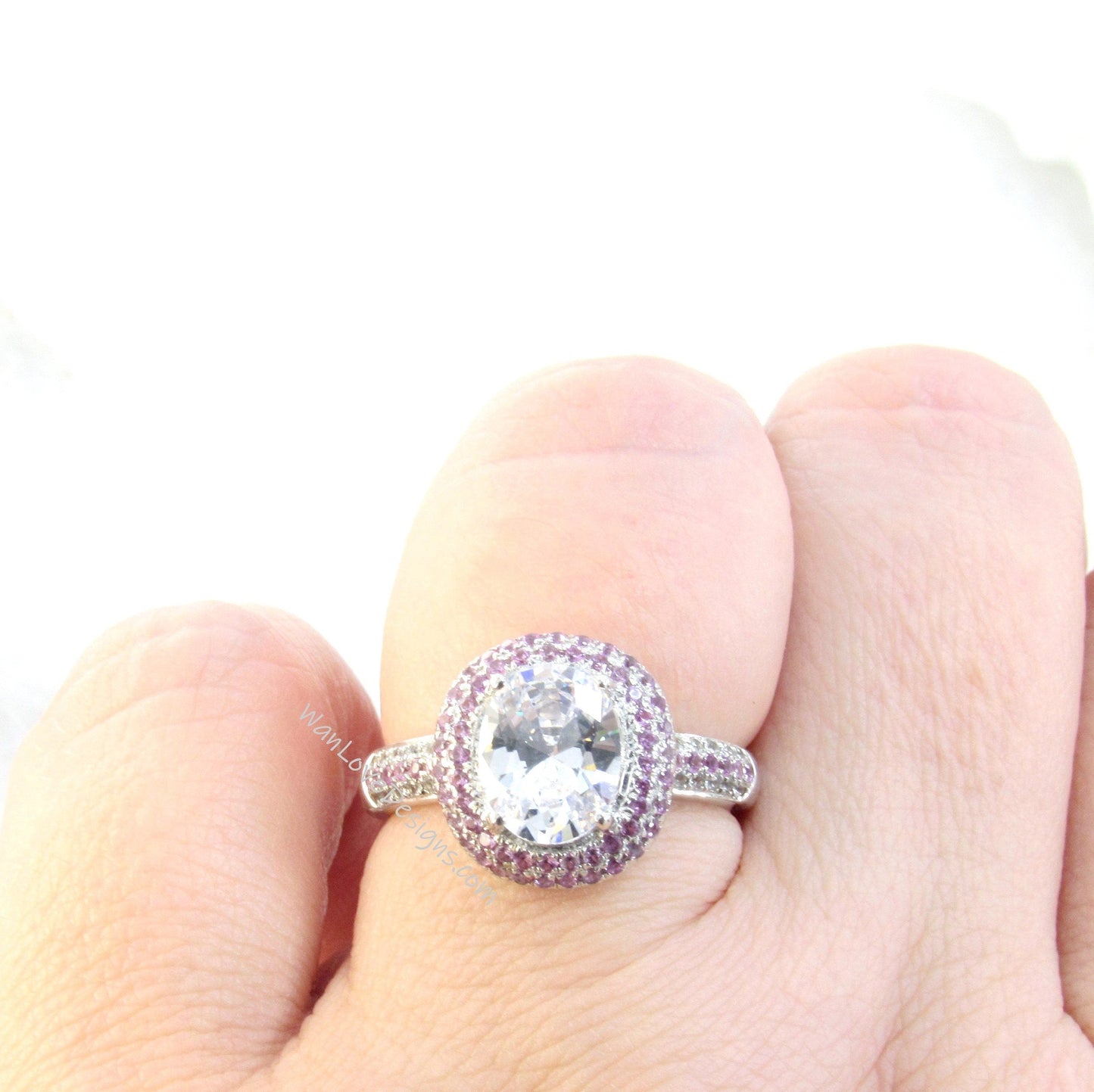 Lab Diamond White & Pink Sapphire Pave 2 Double Halo 3 Row Anello di fidanzamento a fascia 3ct Ovale pave bianco zaffiro rosa Anniversario Regalo-Pronto