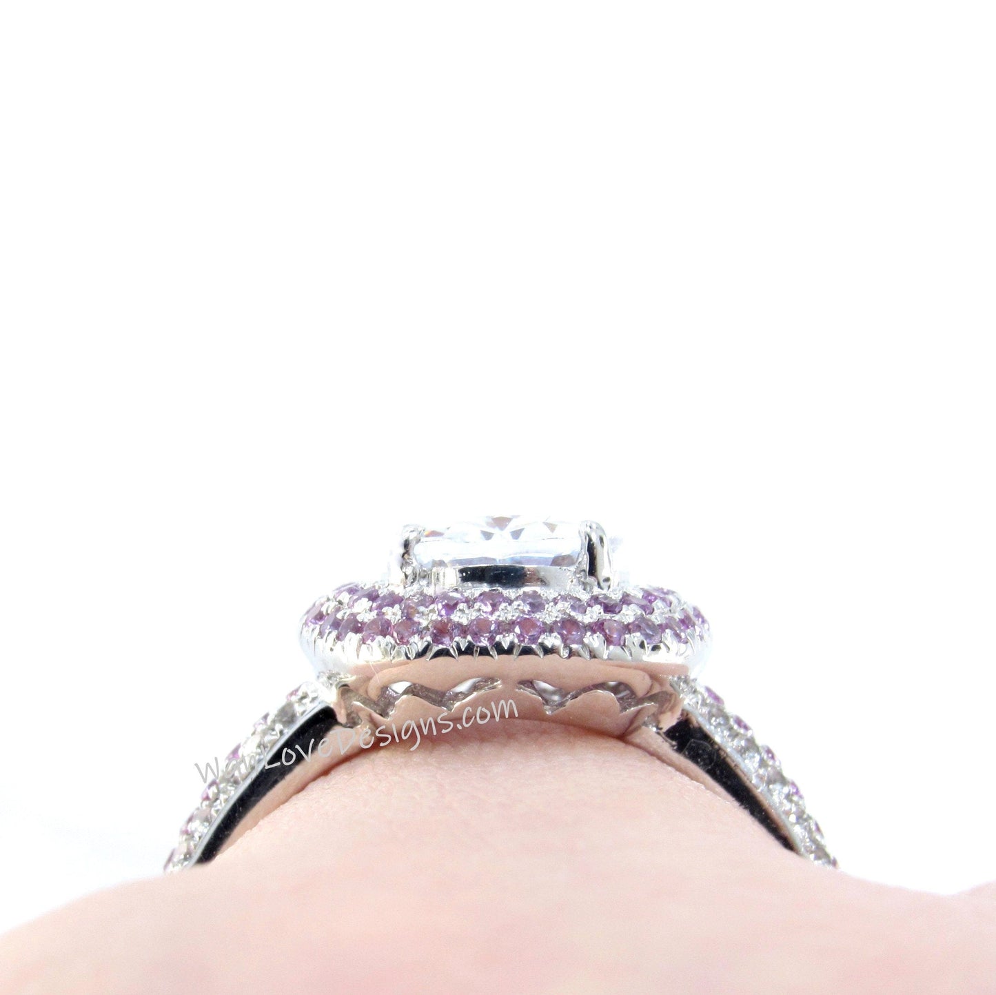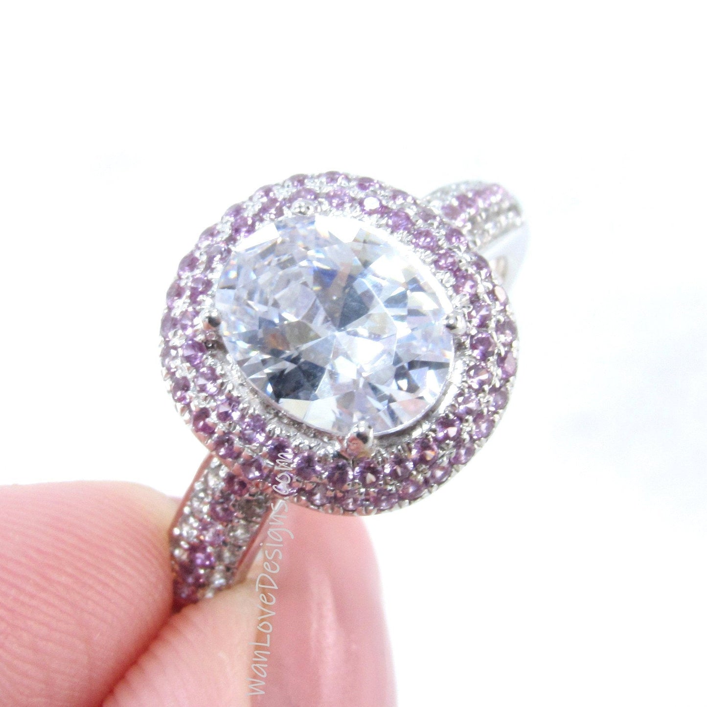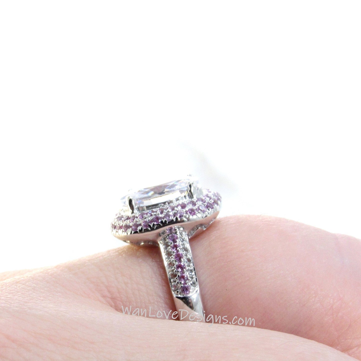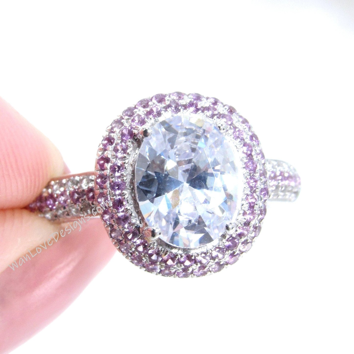 Anello di fidanzamento a fascia con diamanti bianchi e zaffiri rosa Lab con pavé di 2 doppi cerchi a 3 file, 3 ct, 9x7 mm, argento rodiato, regalo di anniversario, pronto per la spedizione. Cerchi qualcosa di particolare/personalizzato? Si prega di chiedere dettagli e prezzi.