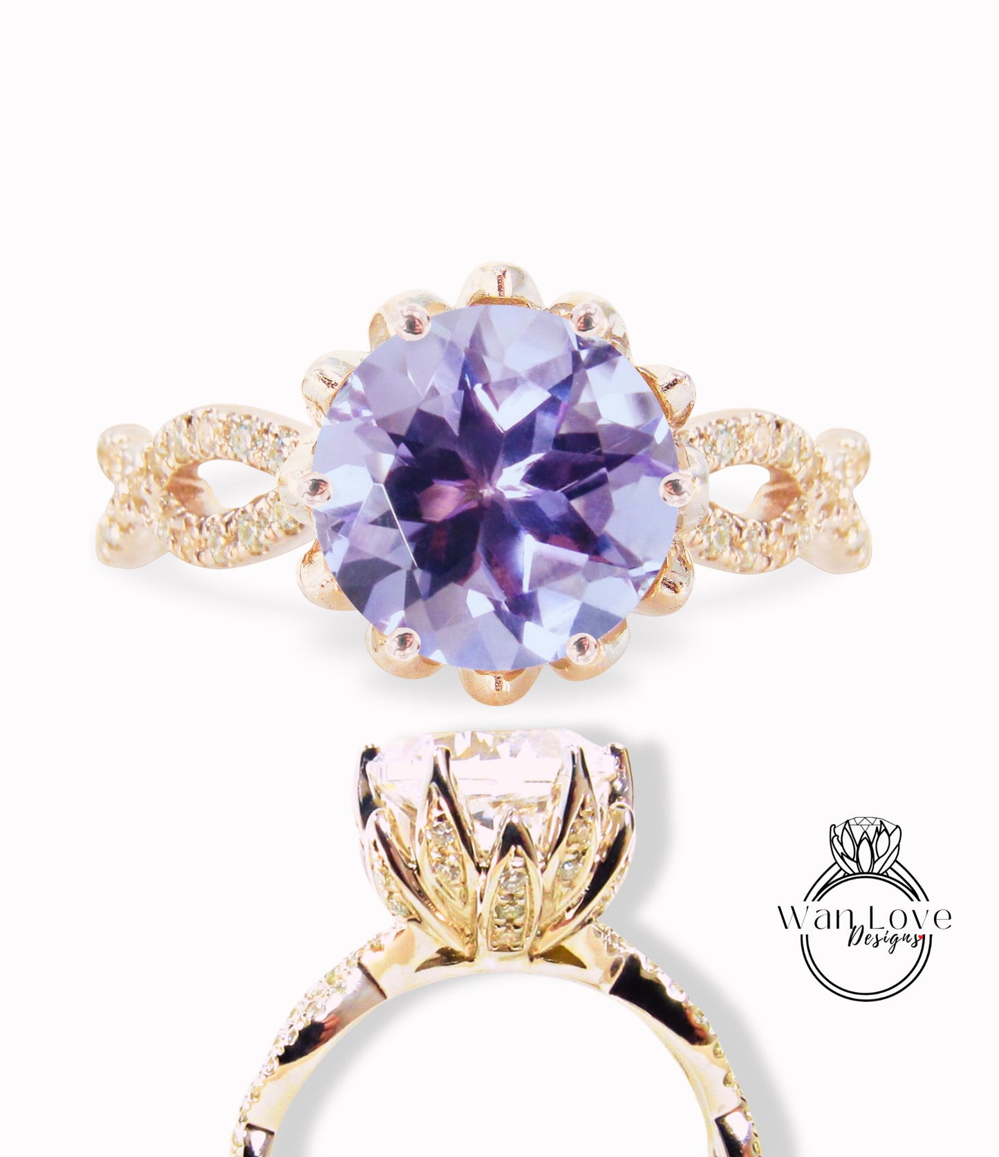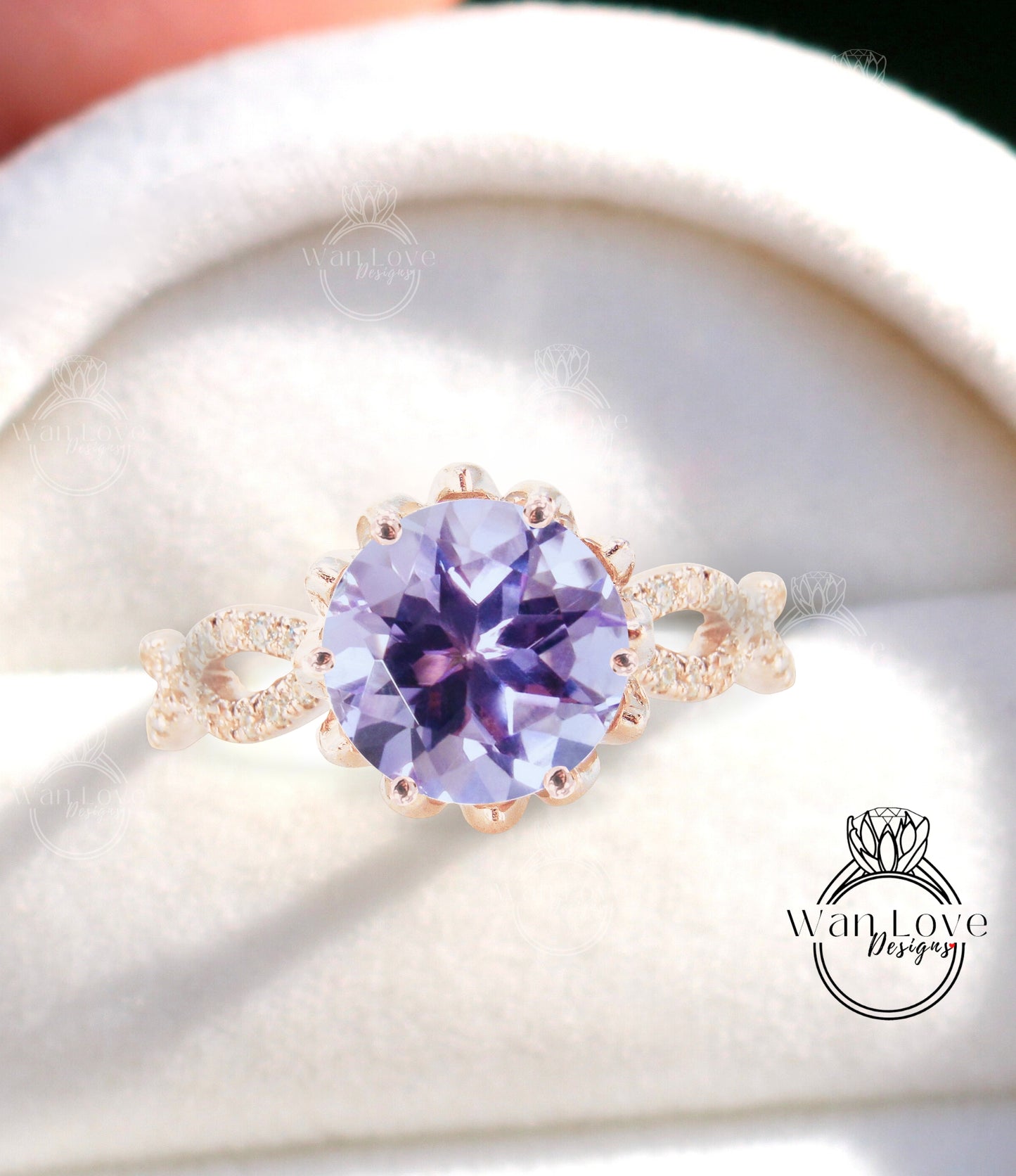 Anello di fidanzamento rotondo intrecciato con ametista lavanda e diamante, fiore di loto, oro 14kt 18kt, platino, anniversario di matrimonio personalizzato