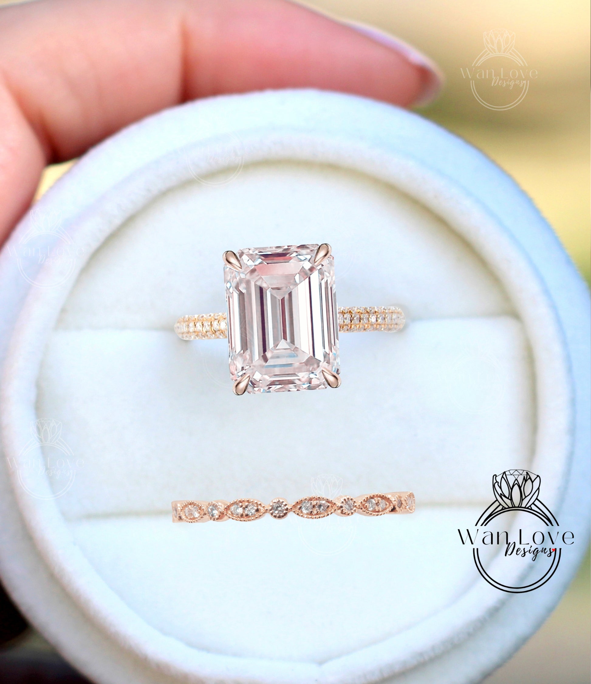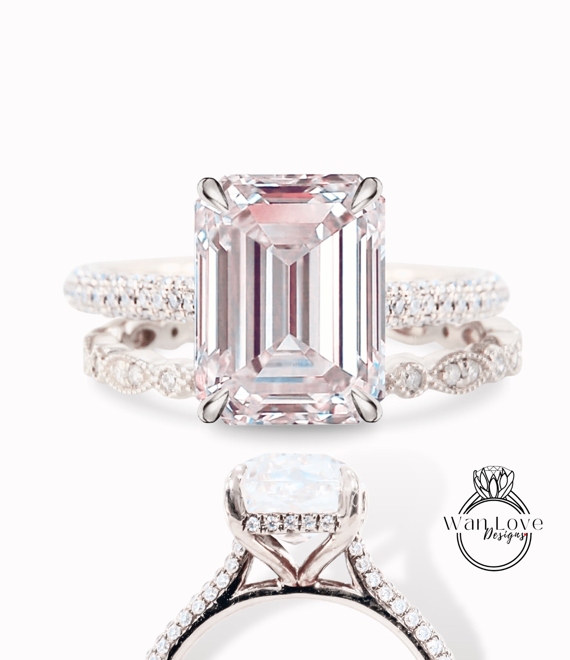 Anello di fidanzamento con diamante rosa chiaro con zaffiro taglio smeraldo, set da sposa in stile art deco, anello con alone nascosto sul lato con diamante antico, fascia per anniversario di matrimonio