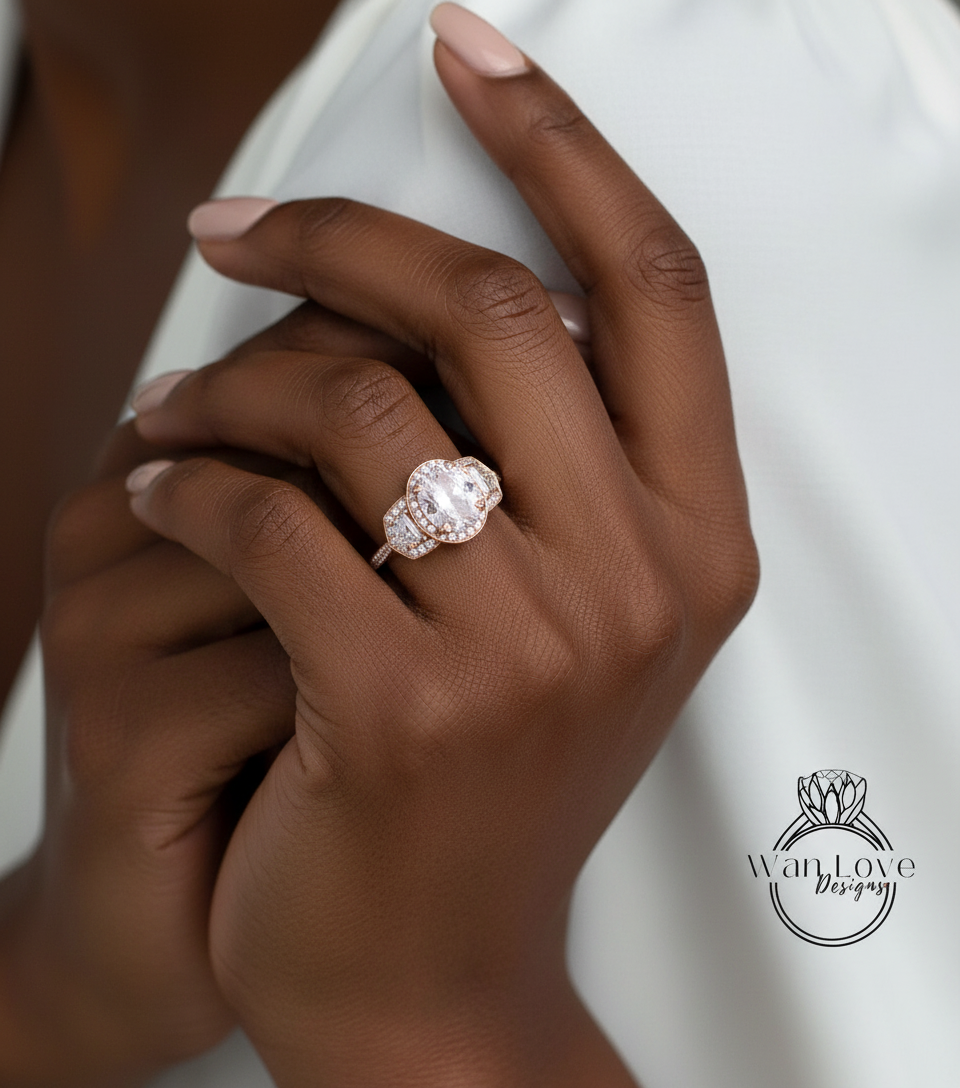 Anello di fidanzamento ovale con zaffiro rosa chiaro e diamanti, trapezio a mezzaluna, 3 ct, 9x7 mm, personalizzato, oro rosa giallo bianco 14k 18k, platino, matrimonio
