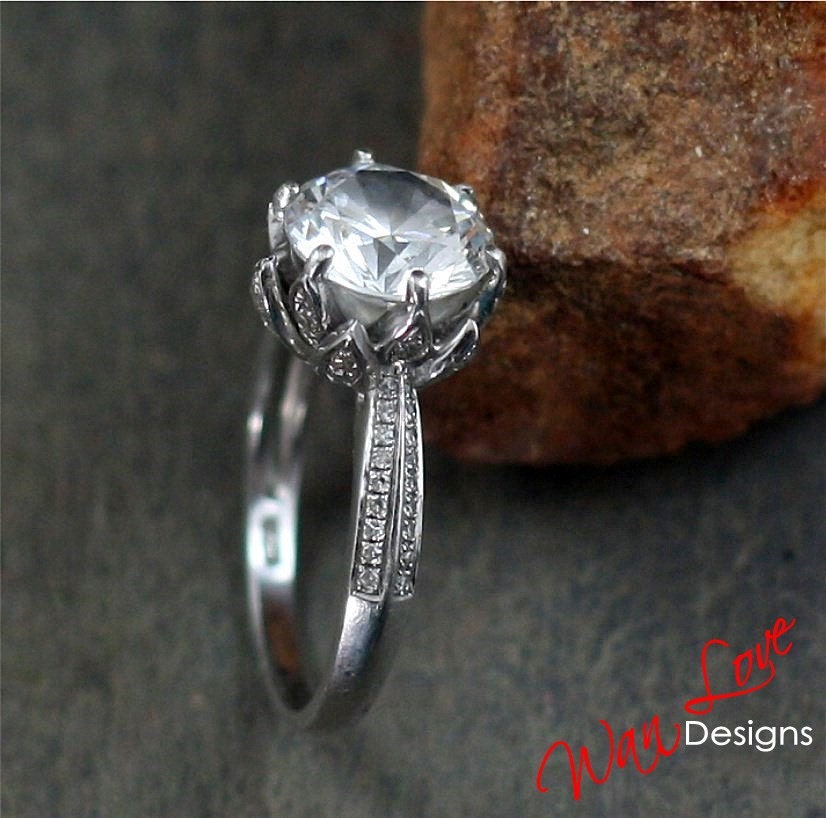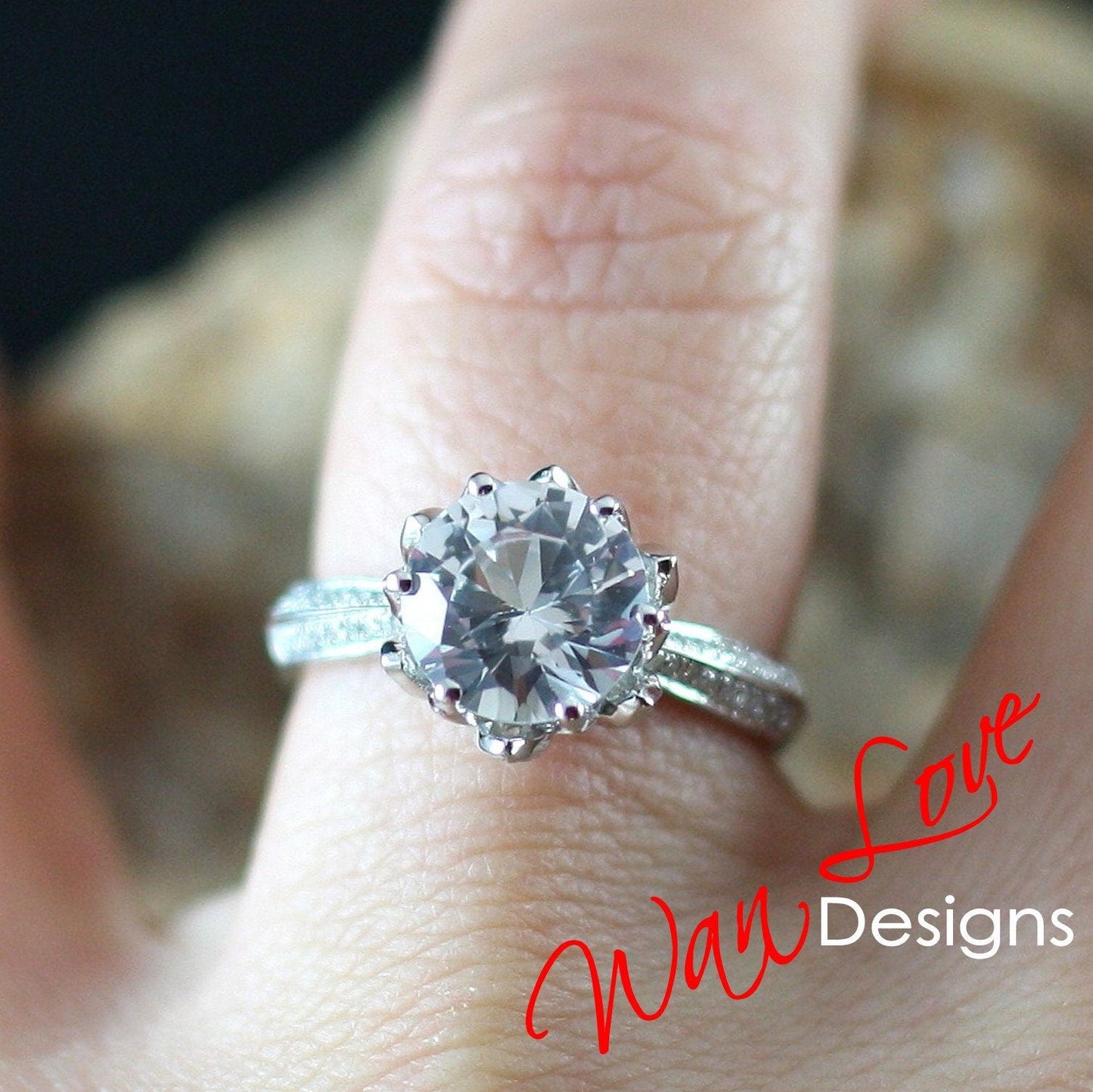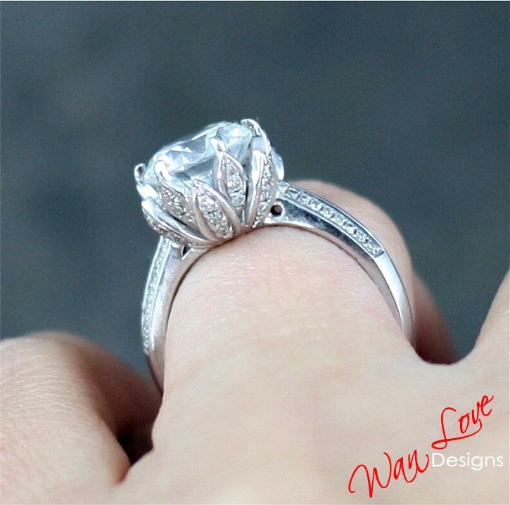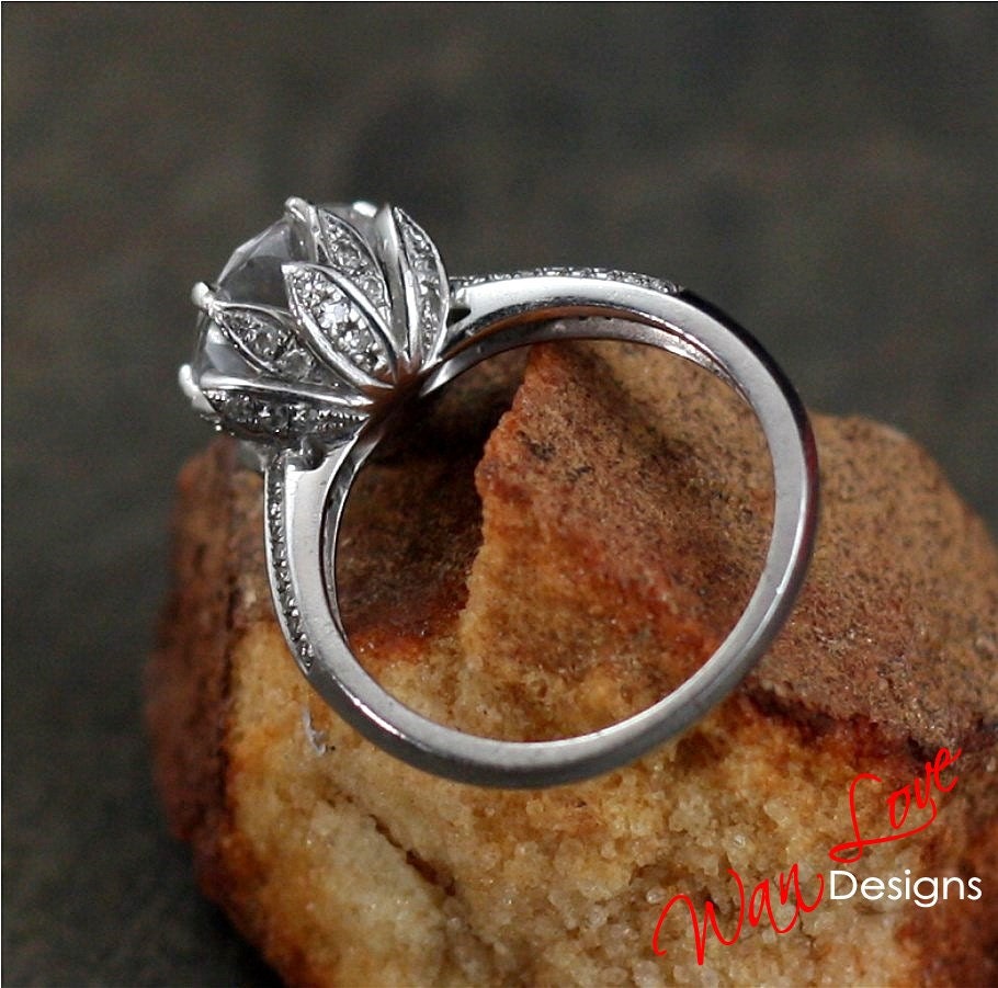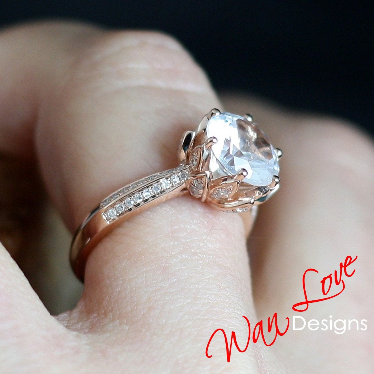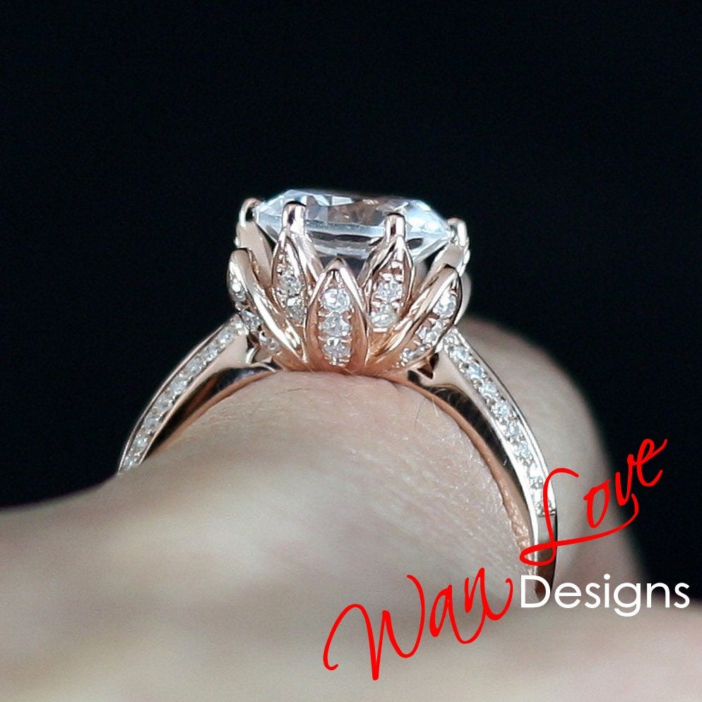 Anello di fidanzamento con diamante fiore di loto e zaffiro bianco, 2 ct-8 mm, oro rosa giallo bianco 14 kt 18 kt-platino-dimensione personalizzata-anniversario di matrimonio