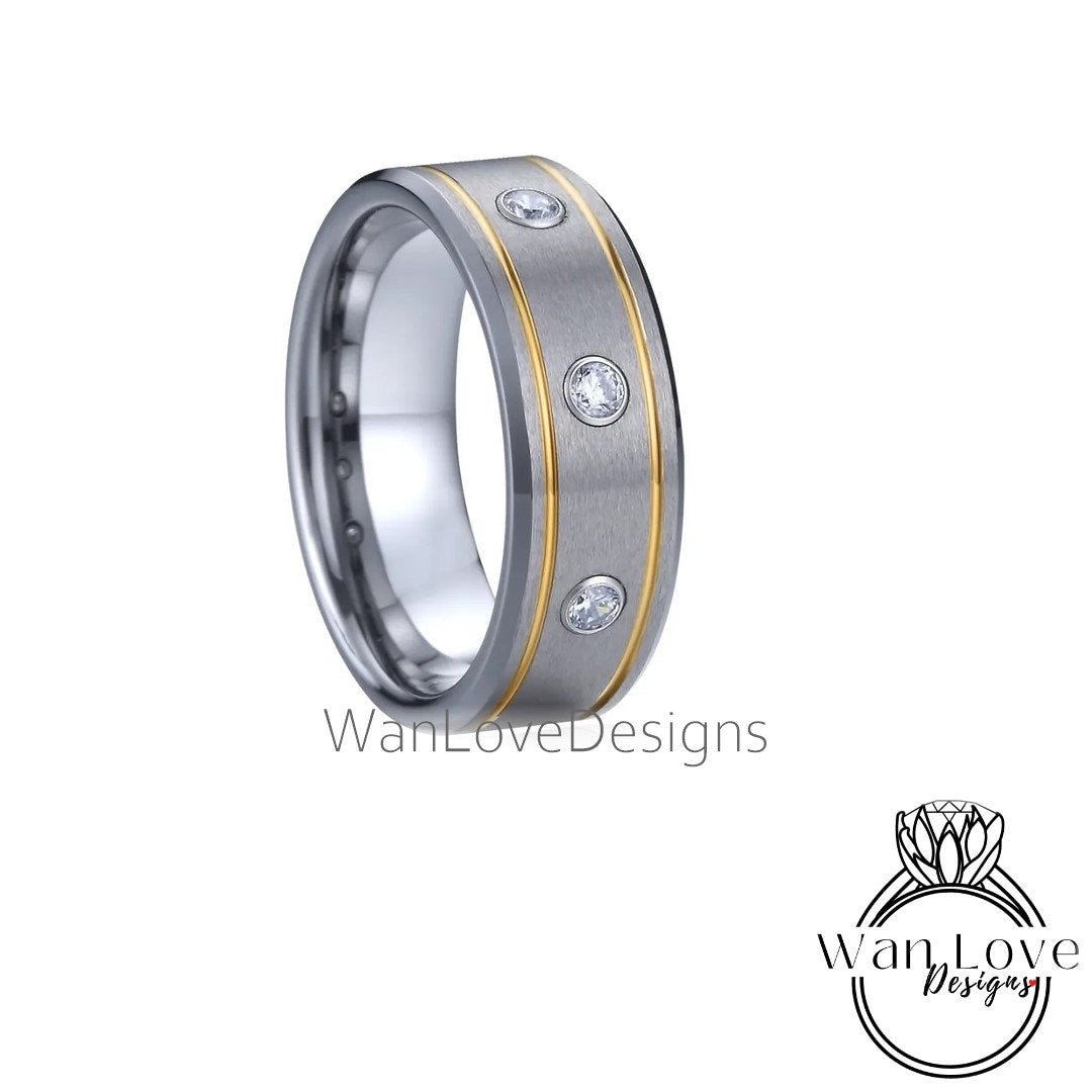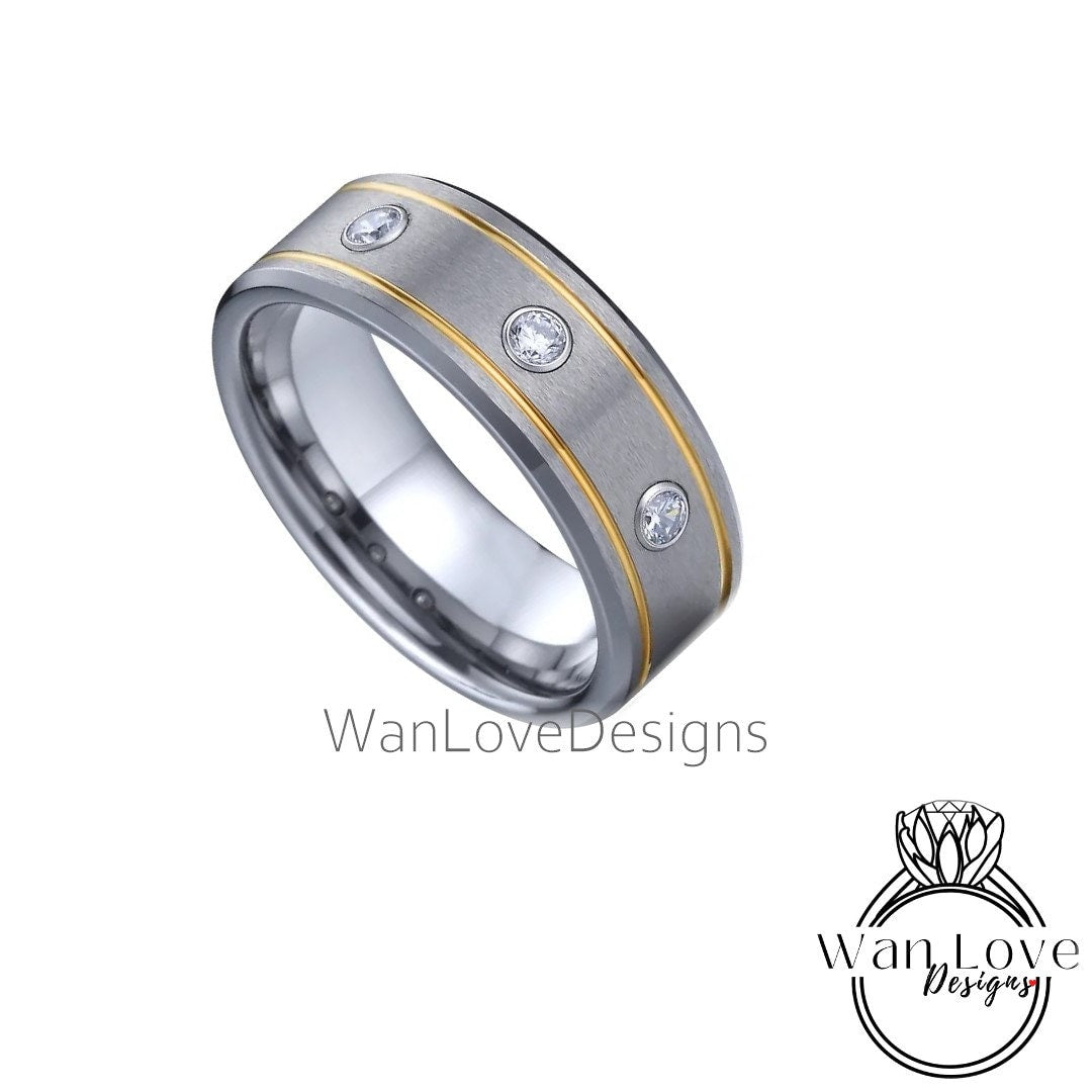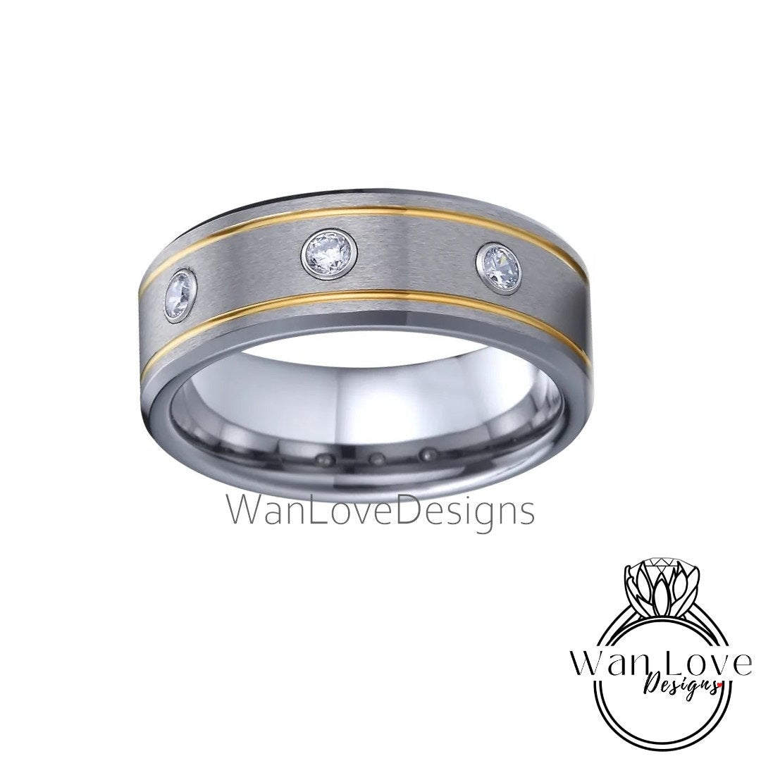 Men's 3 Gem Stone Moissanite Sapphire Wedding Band, 2 tone Gold Grooved Tungsten Wedding Ring, Mens Engagement Ring Wedding, Man Anniversary