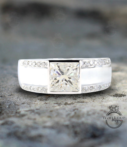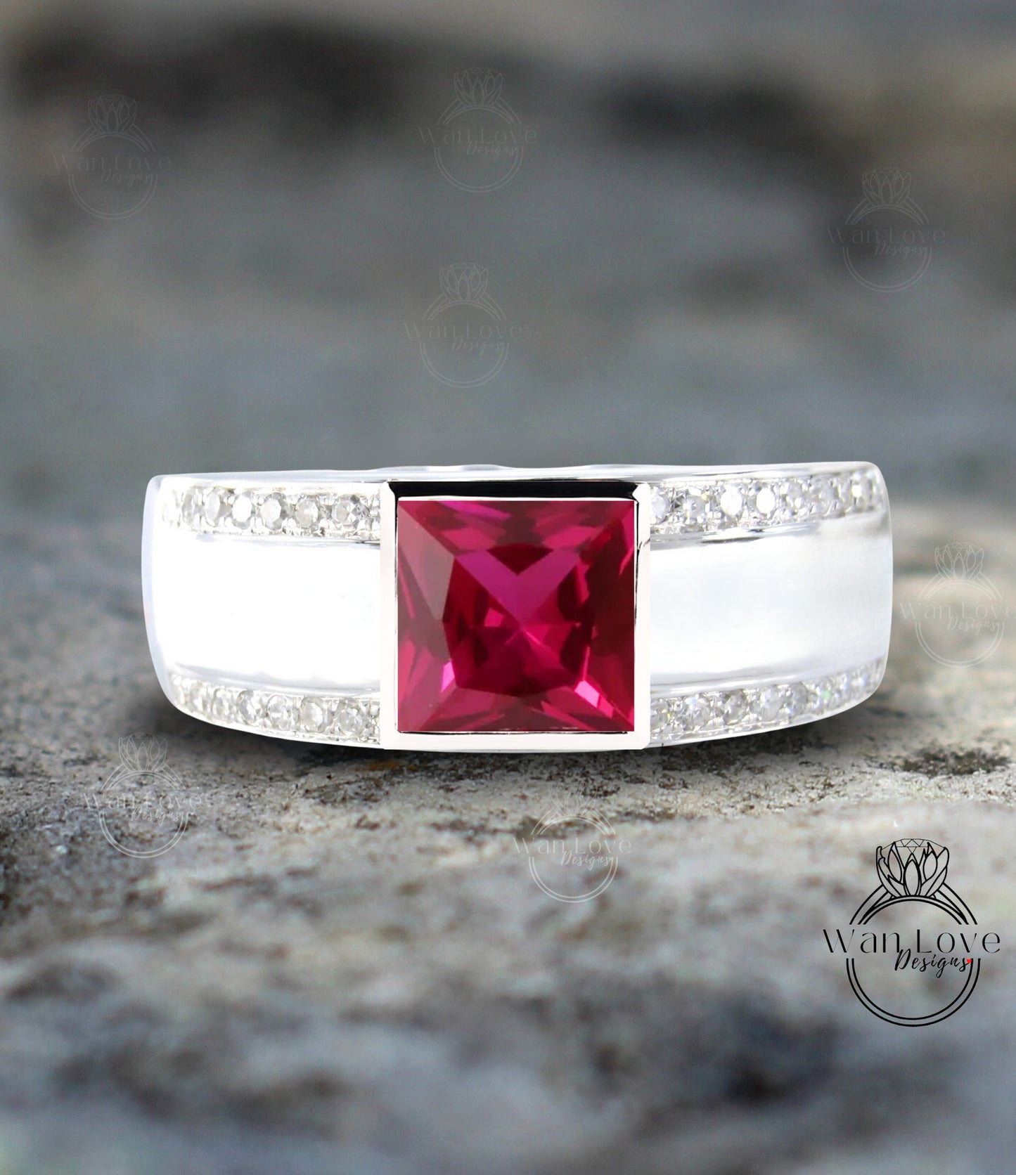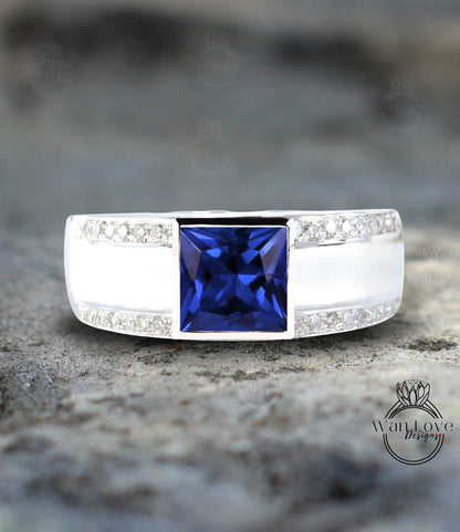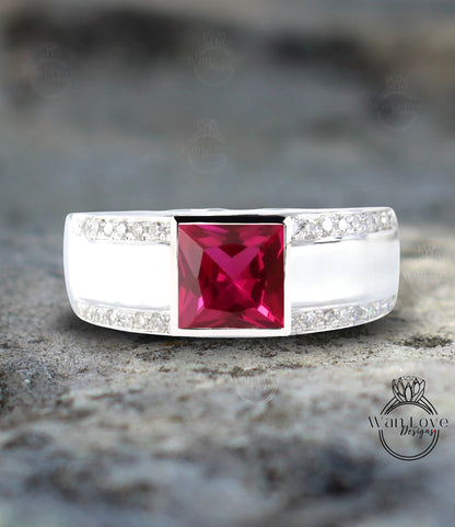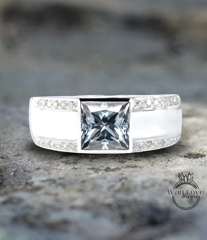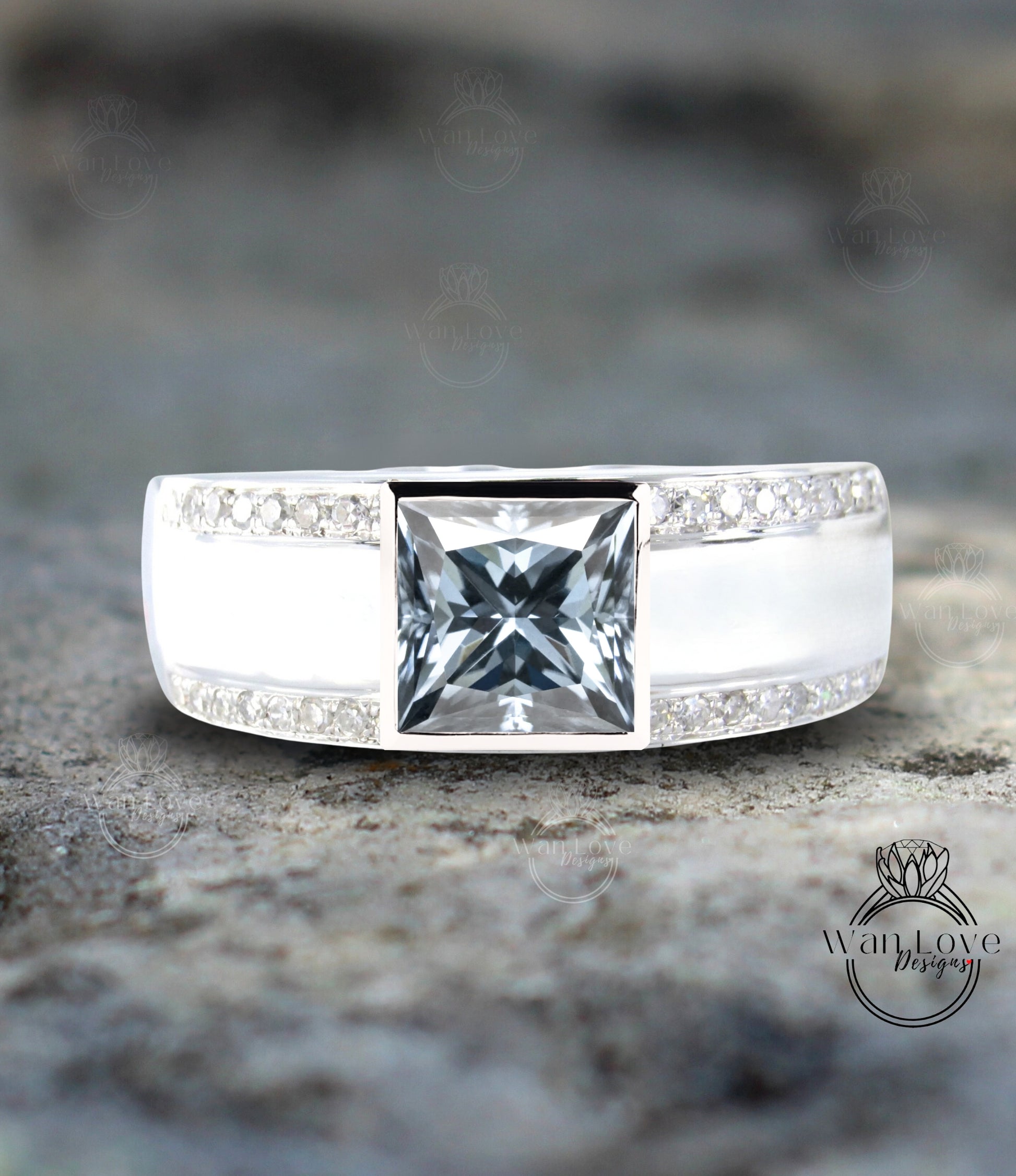 Men's Black Spinel Wedding Band | Square White Gold Men Band | Princess Cut Black Diamond Wedding Ring | Unique Men's Wedding Band