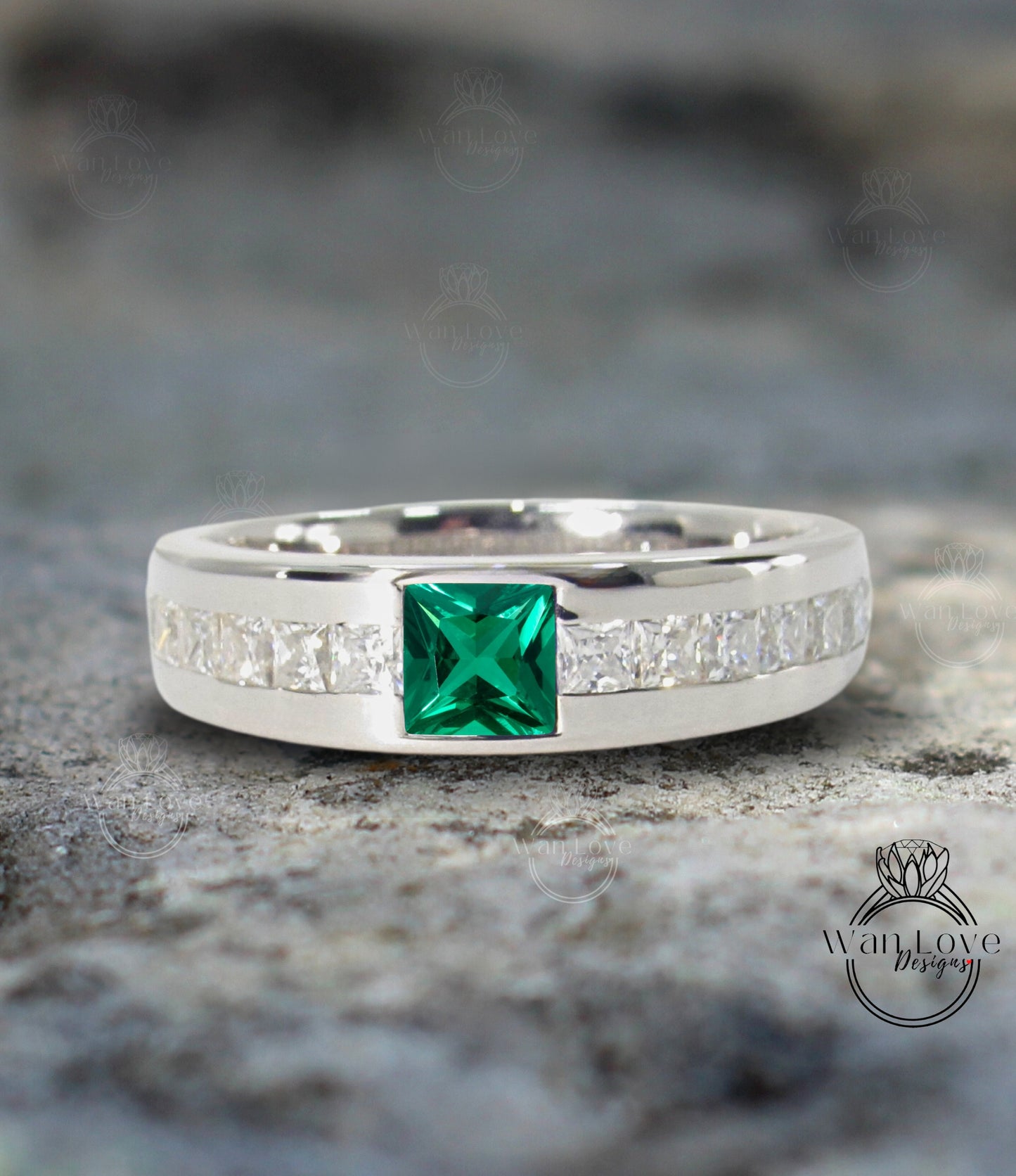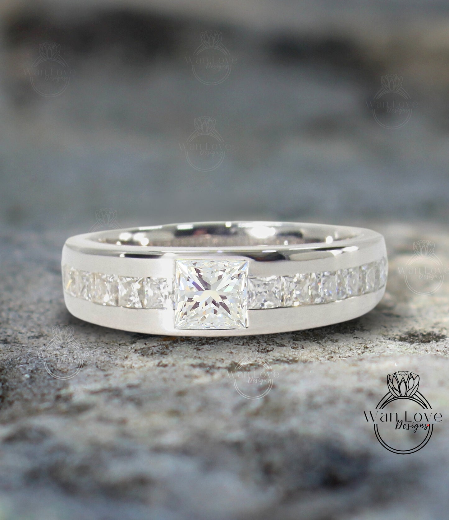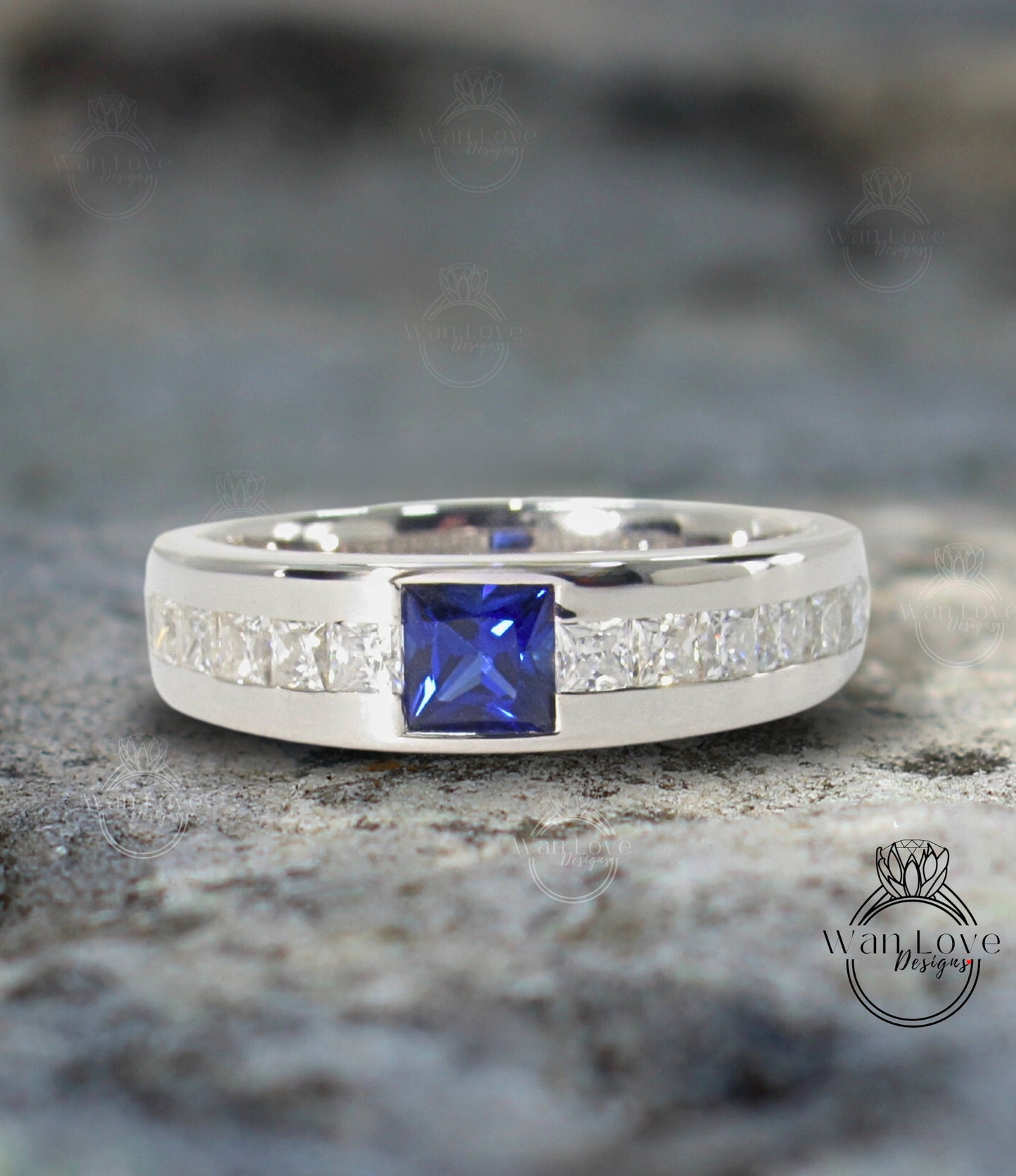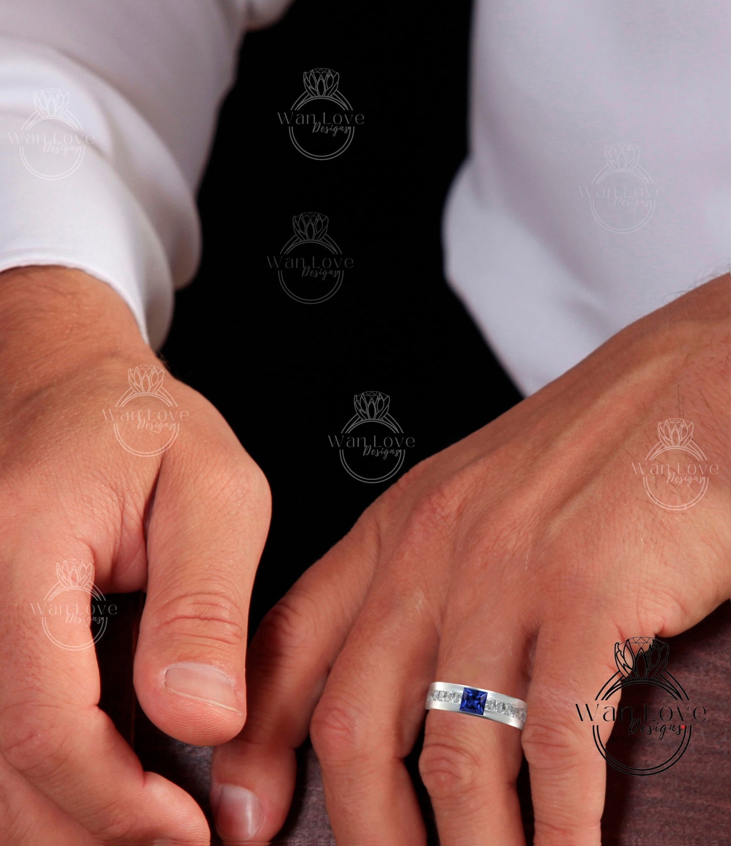 Fede nuziale da uomo con taglio principessa in zaffiro blu da uomo, fede nuziale in oro massiccio 10/14k/18k, fede nuziale Moissanite, fede nuziale