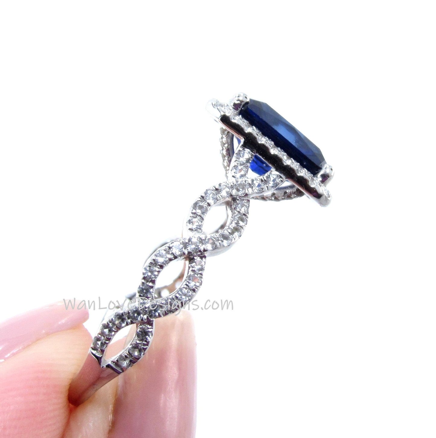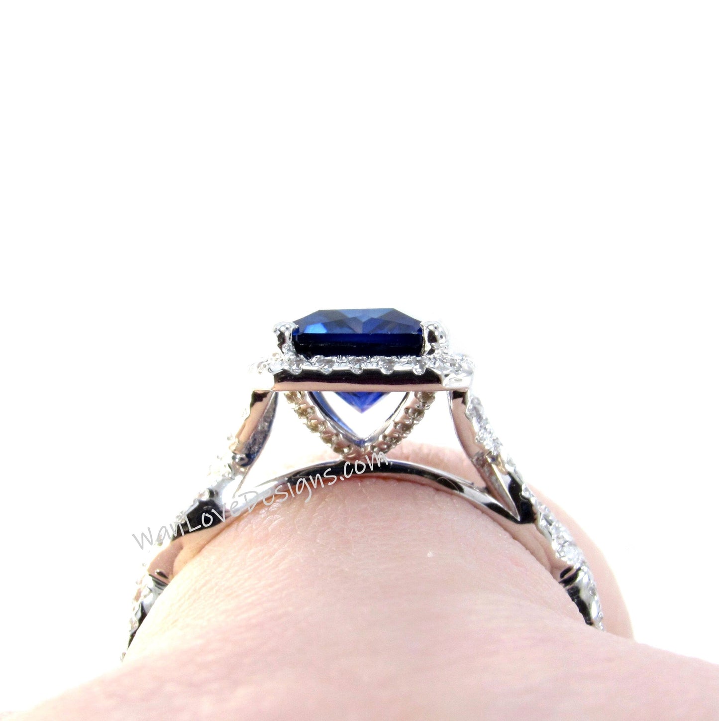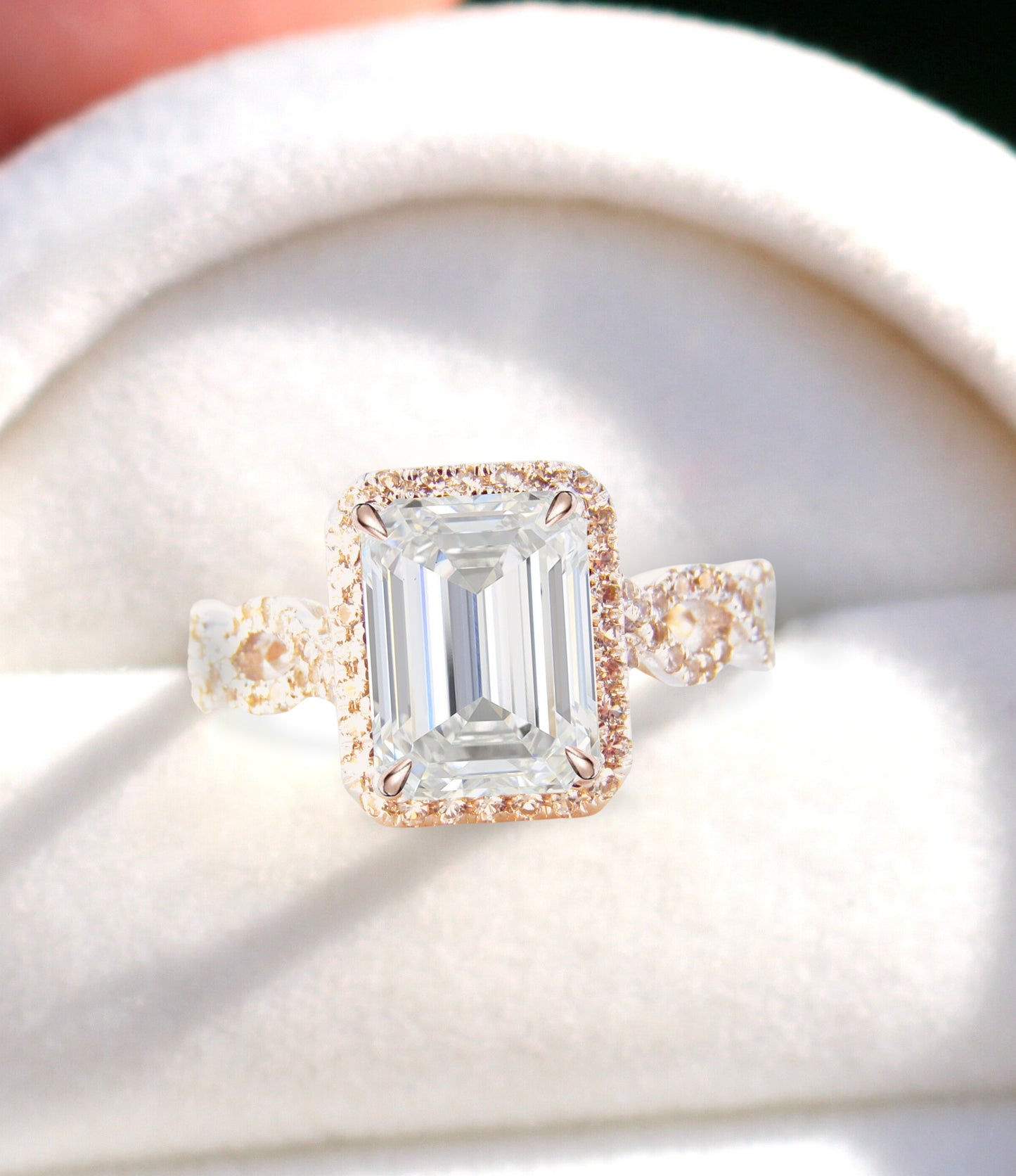 Anello di fidanzamento unico con diamante Moissanite radiante, vite attorcigliata, smeraldo, Halo, WanLoveDesigns.