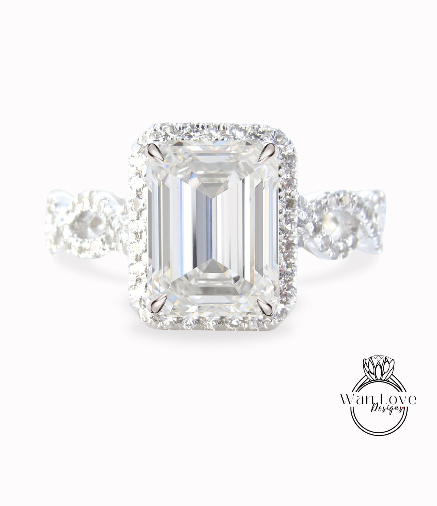 Anello di fidanzamento unico con diamante Moissanite radiante, vite attorcigliata, smeraldo, Halo, WanLoveDesigns