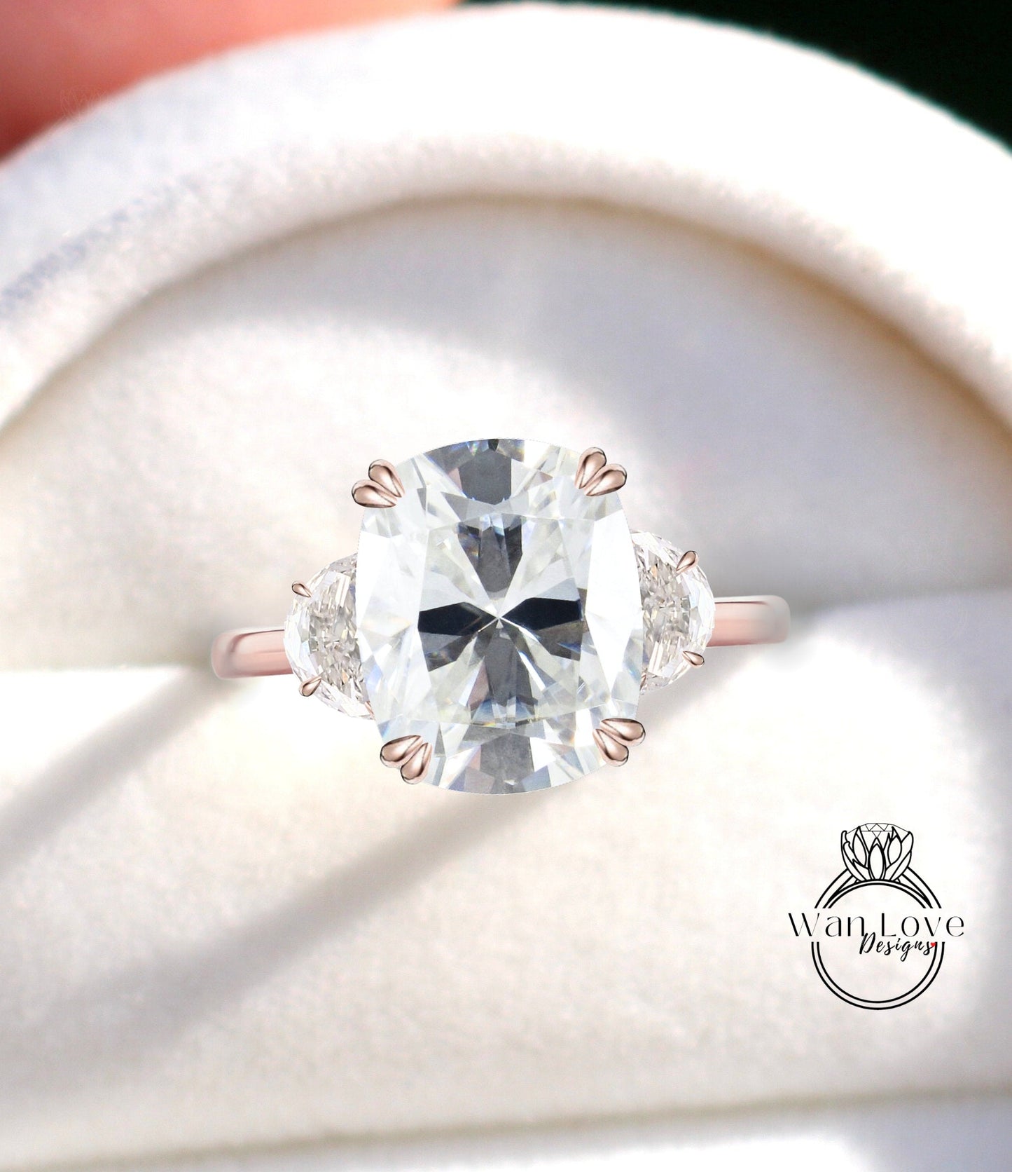 Moissanite & diamond half moon elongated cushion 3 gemstone engagement ring plain band Moissanite diamond rose gold art deco diamond three gem stone ring wedding Bridal Anniversary gift