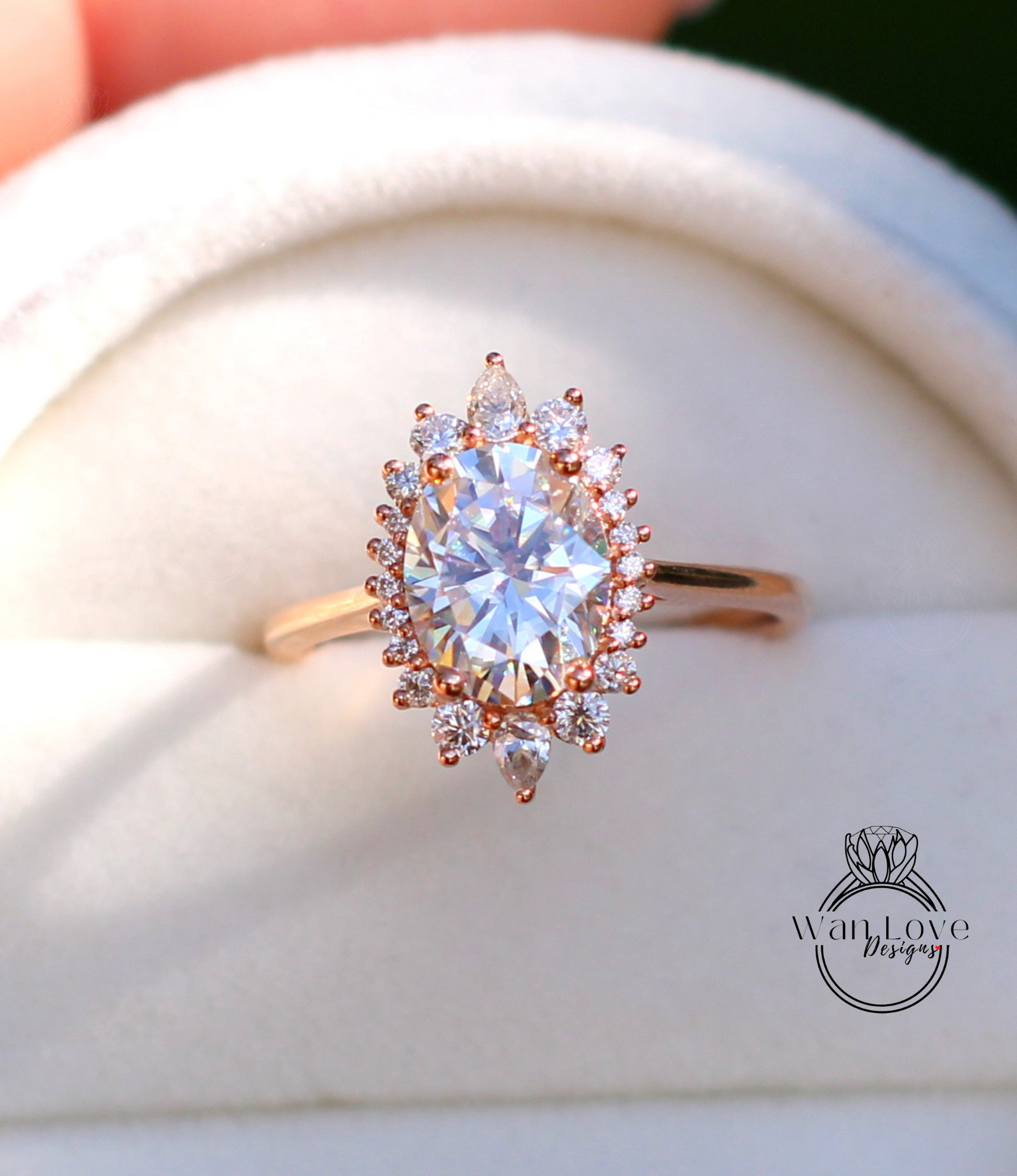 Anello di fidanzamento ovale con moissanite champagne, oro rosa vintage Anello di fidanzamento a grappolo unico da donna, matrimonio Sunburst, regalo nuziale, pronto per la spedizione.