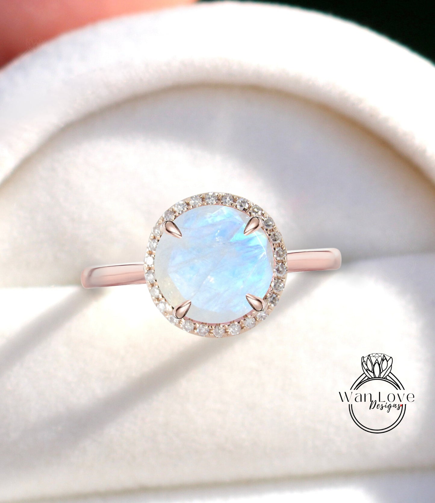 Anello di fidanzamento con pietra di luna e diamante rotondo Halo con gambo semplice Matrimonio personalizzato 14kt Oro 18kt, Platino, WanLoveDesigns