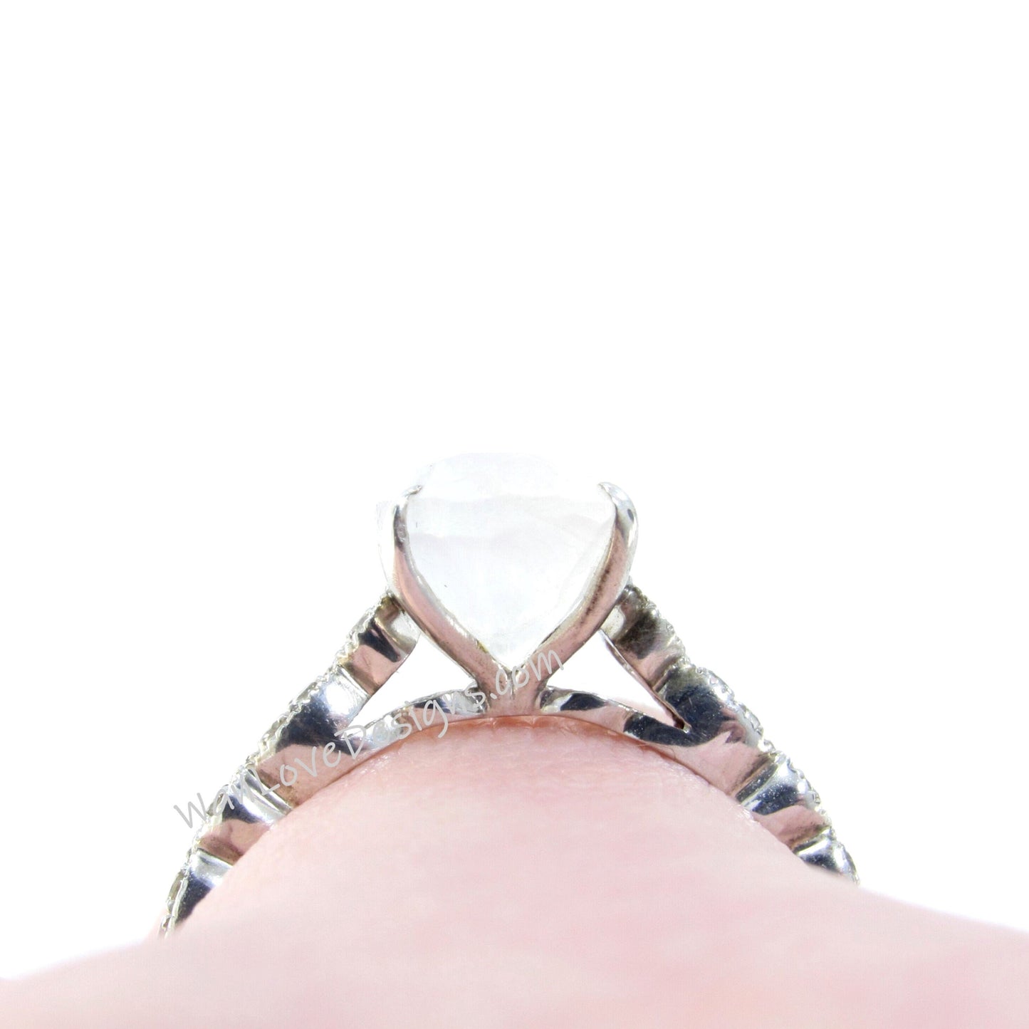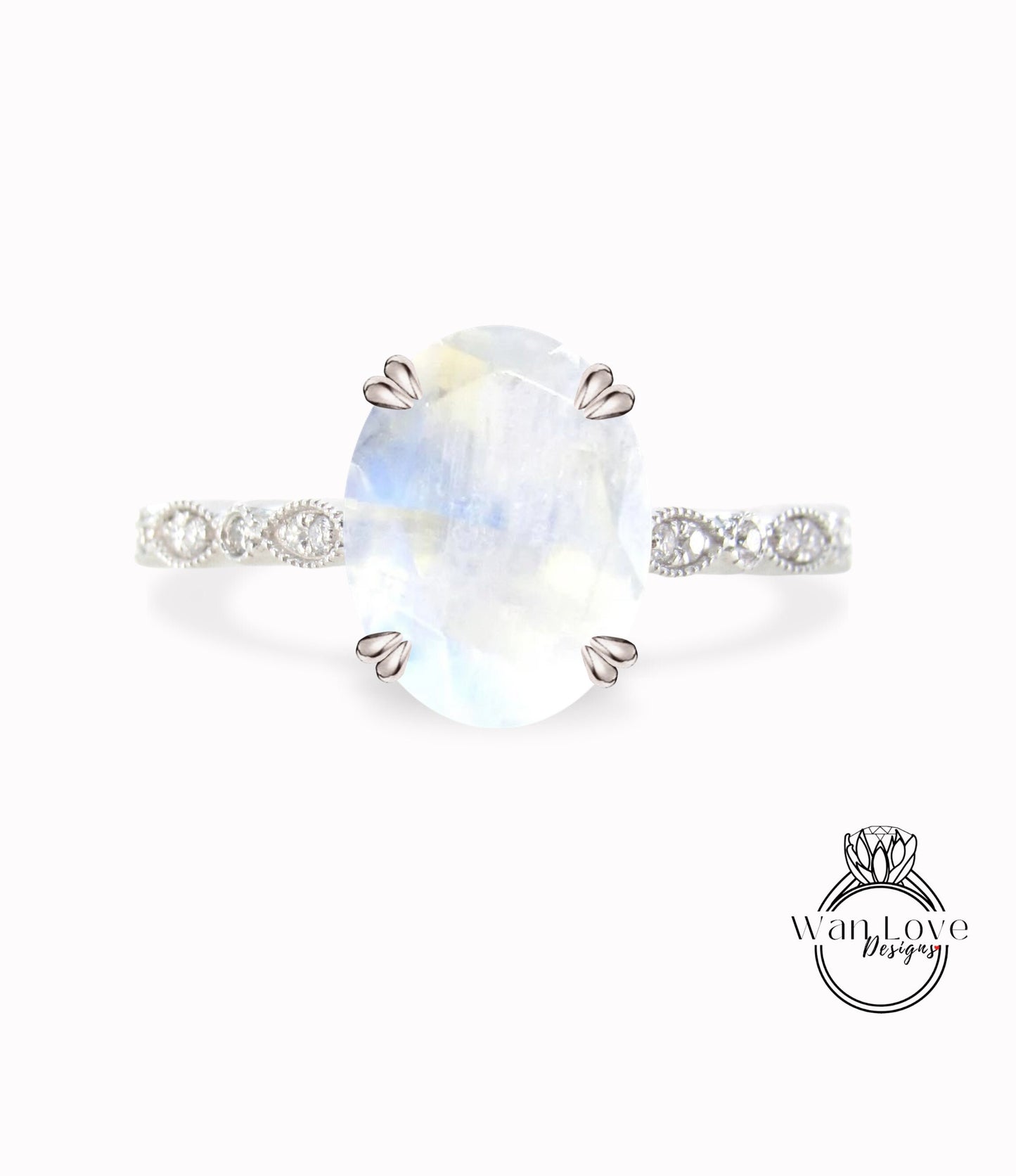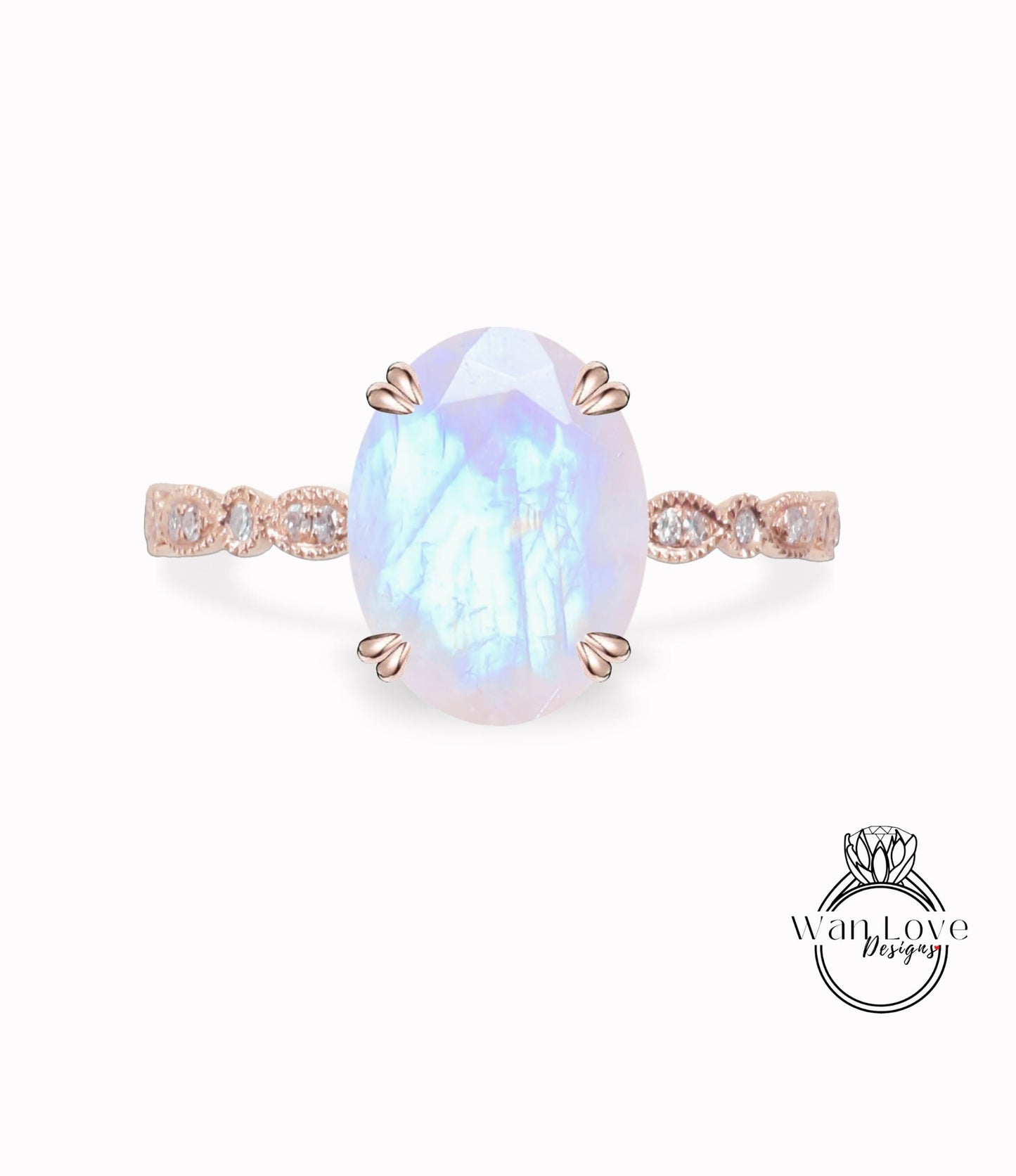 Pietra di luna e diamanti ovali CON o SENZA fedi nuziali di fidanzamento Milgrain, oro rosa bianco giallo massiccio 18kt 14kt, WanLoveDesigns