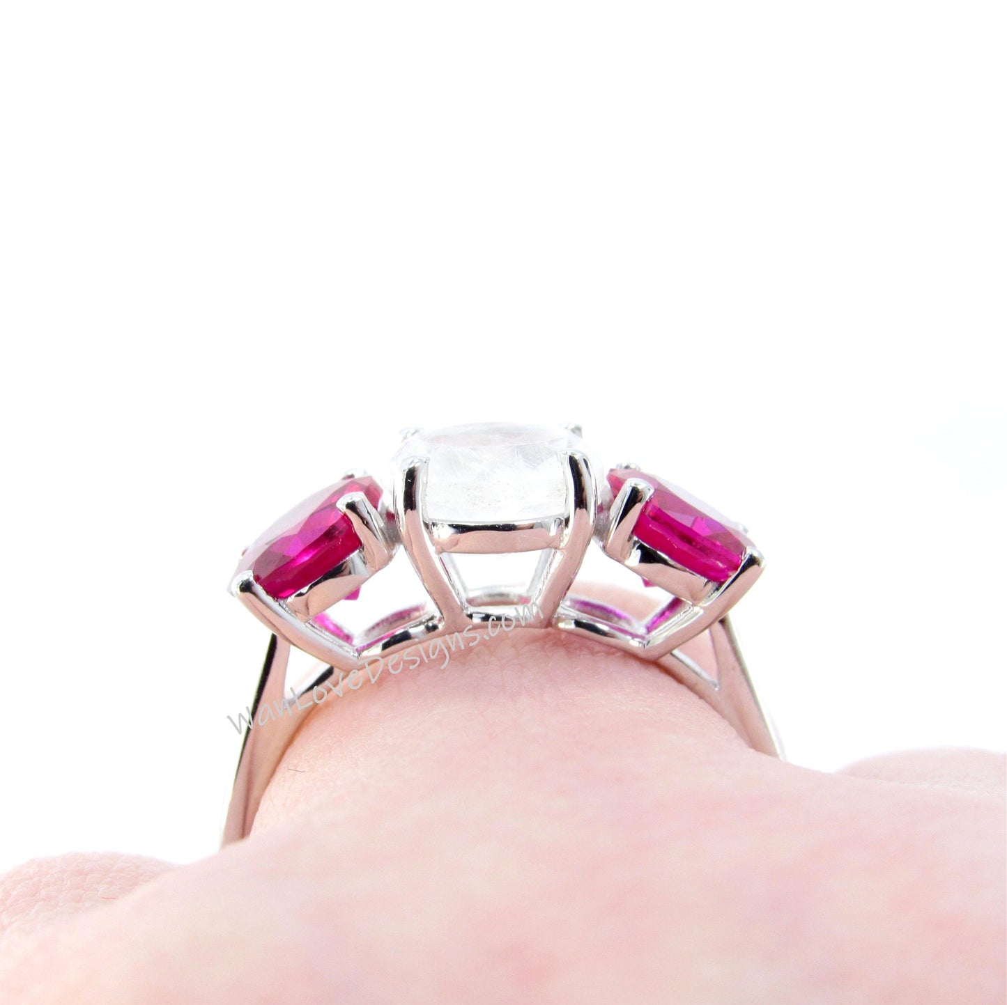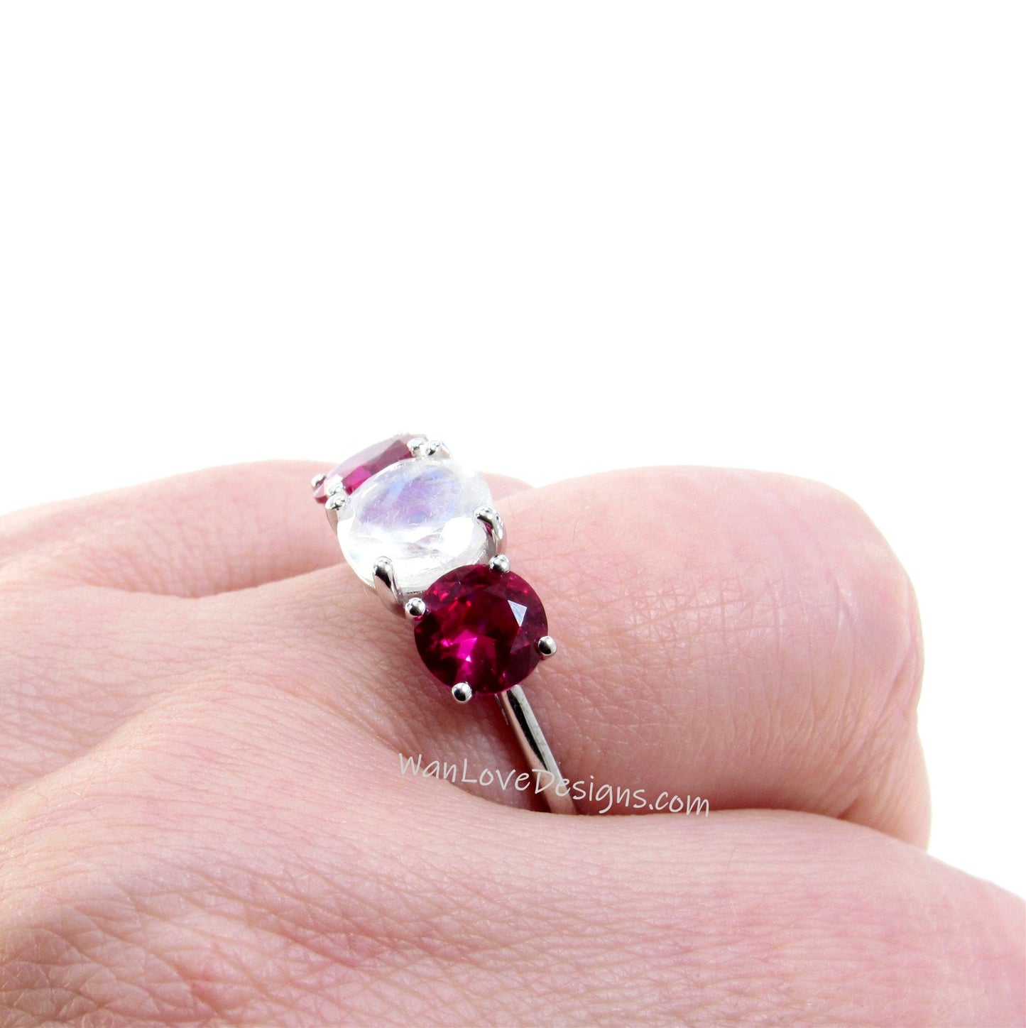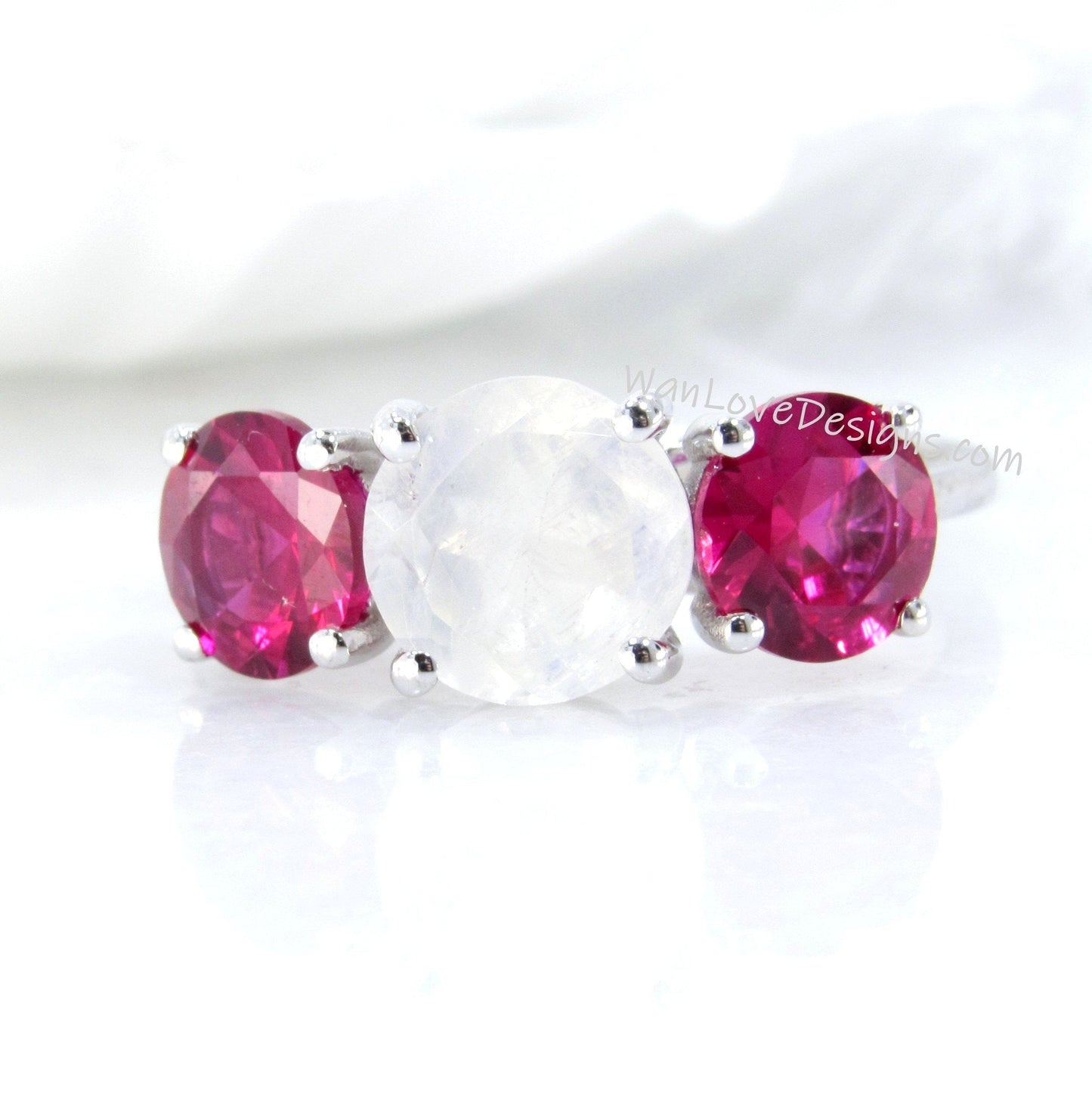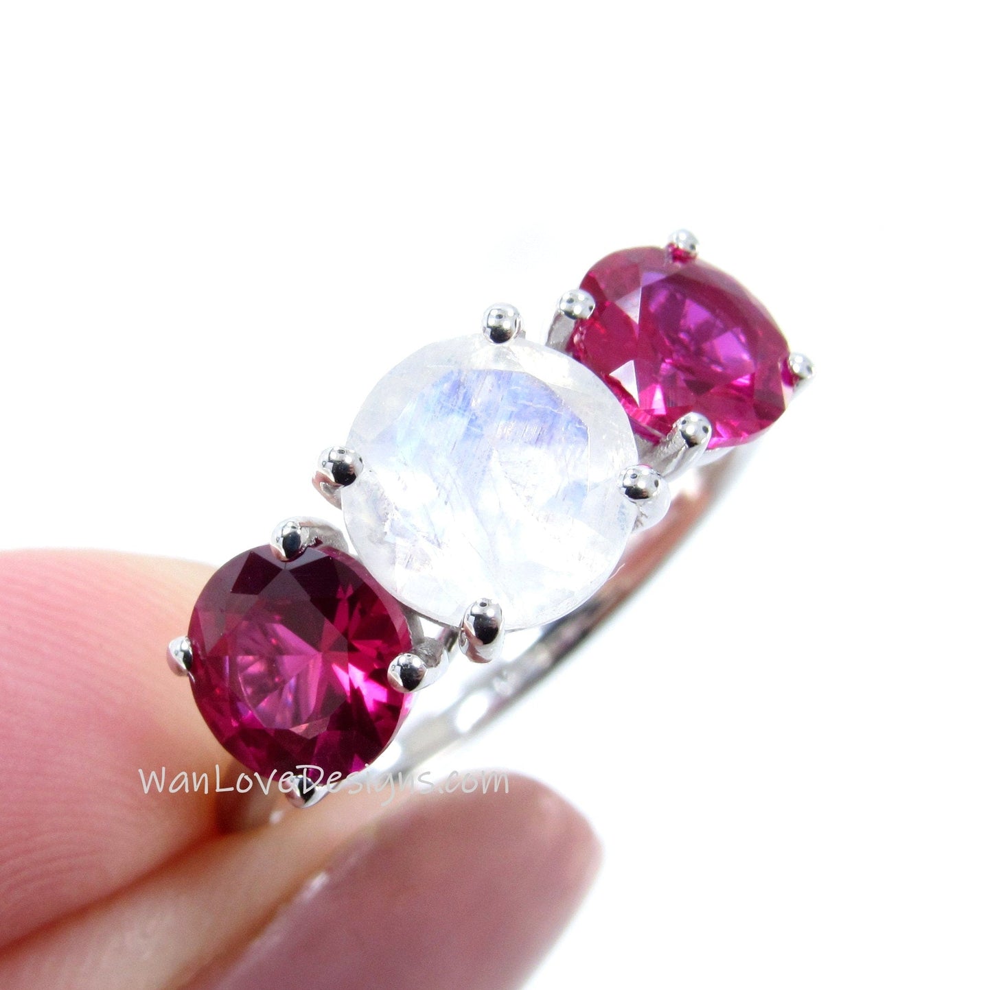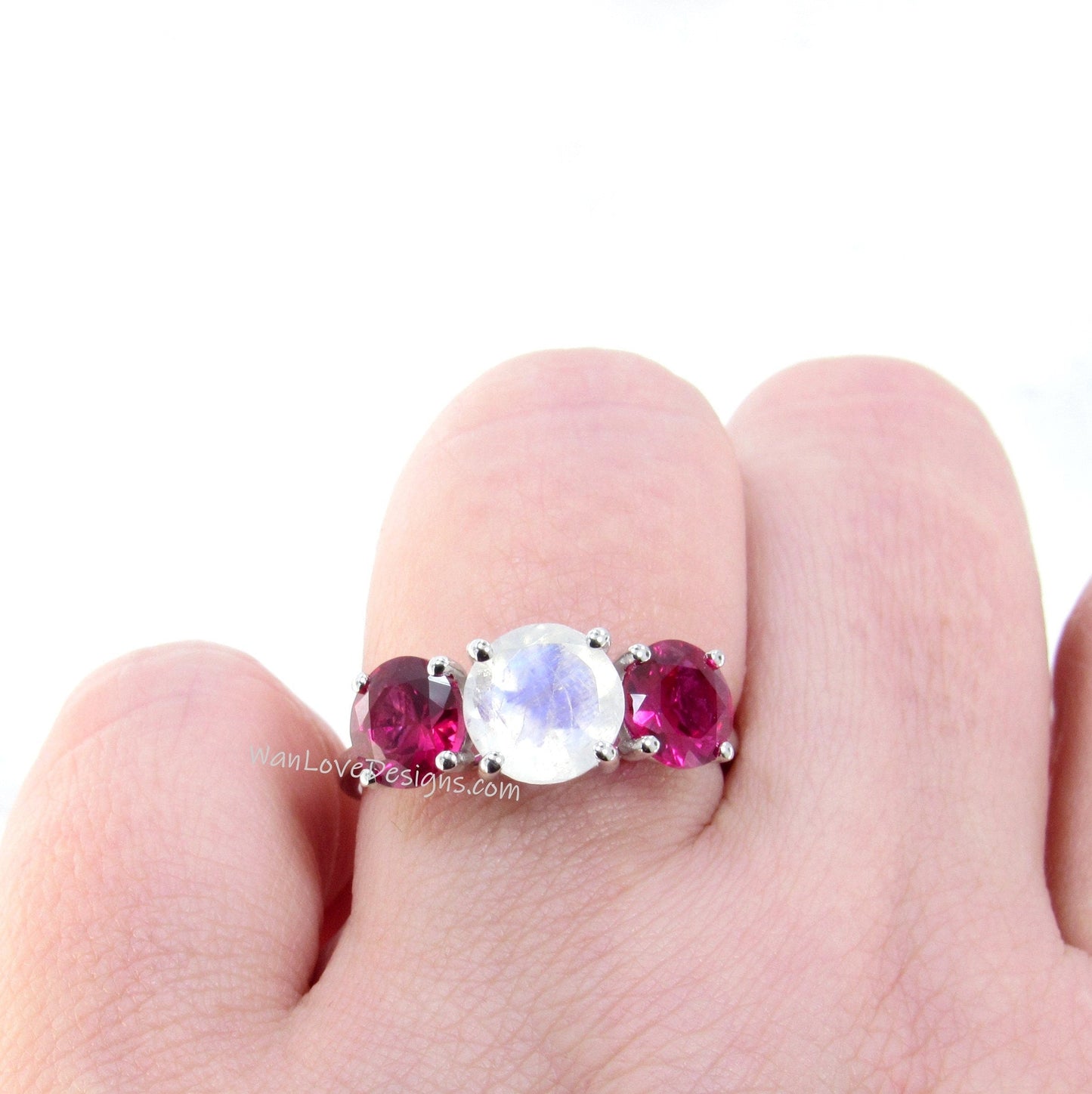 Anello di fidanzamento con 3 gemme di rubino di pietra di luna, taglio rotondo, personalizzato, matrimonio, anniversario, oro giallo rosa bianco 14k 18k, platino