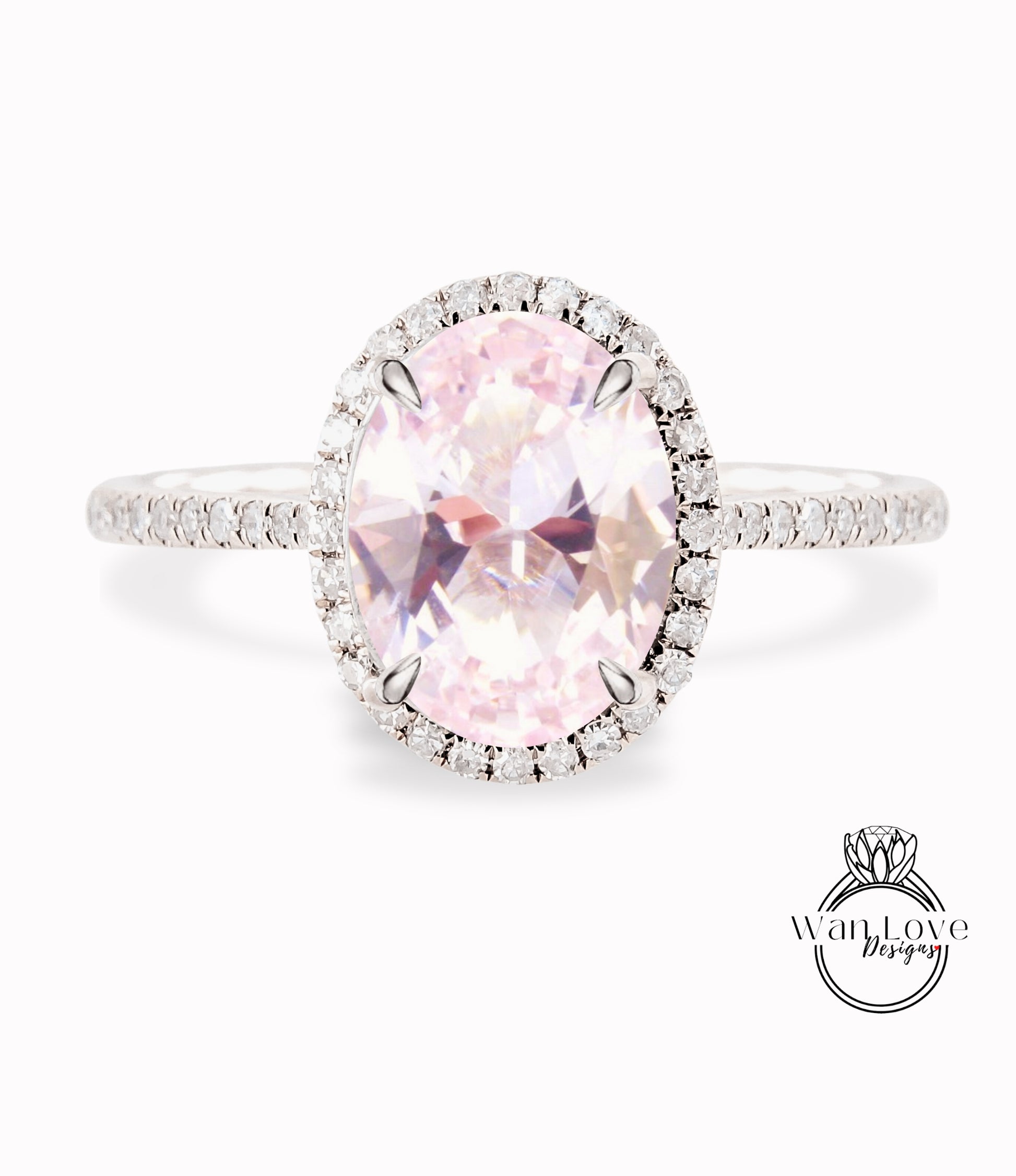 Anello di fidanzamento con zaffiro rosa chiaro e diamante ovale Halo, Cattedrale-14k oro 18k-platino-anniversario di matrimonio personalizzato, WanLoveDesigns