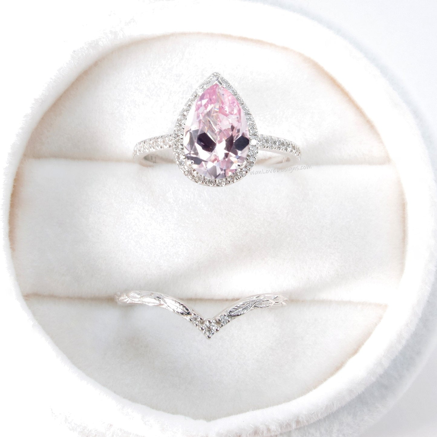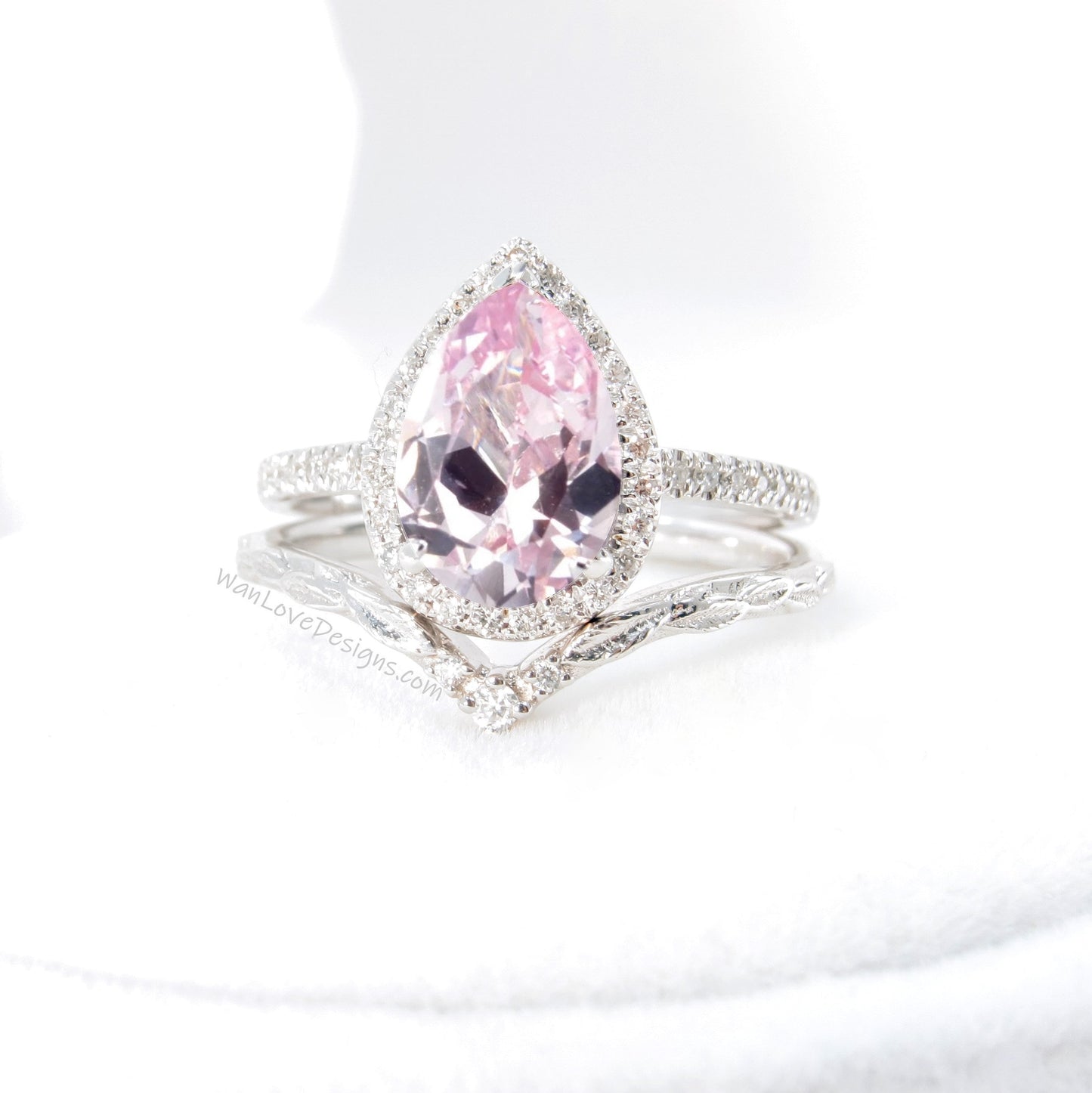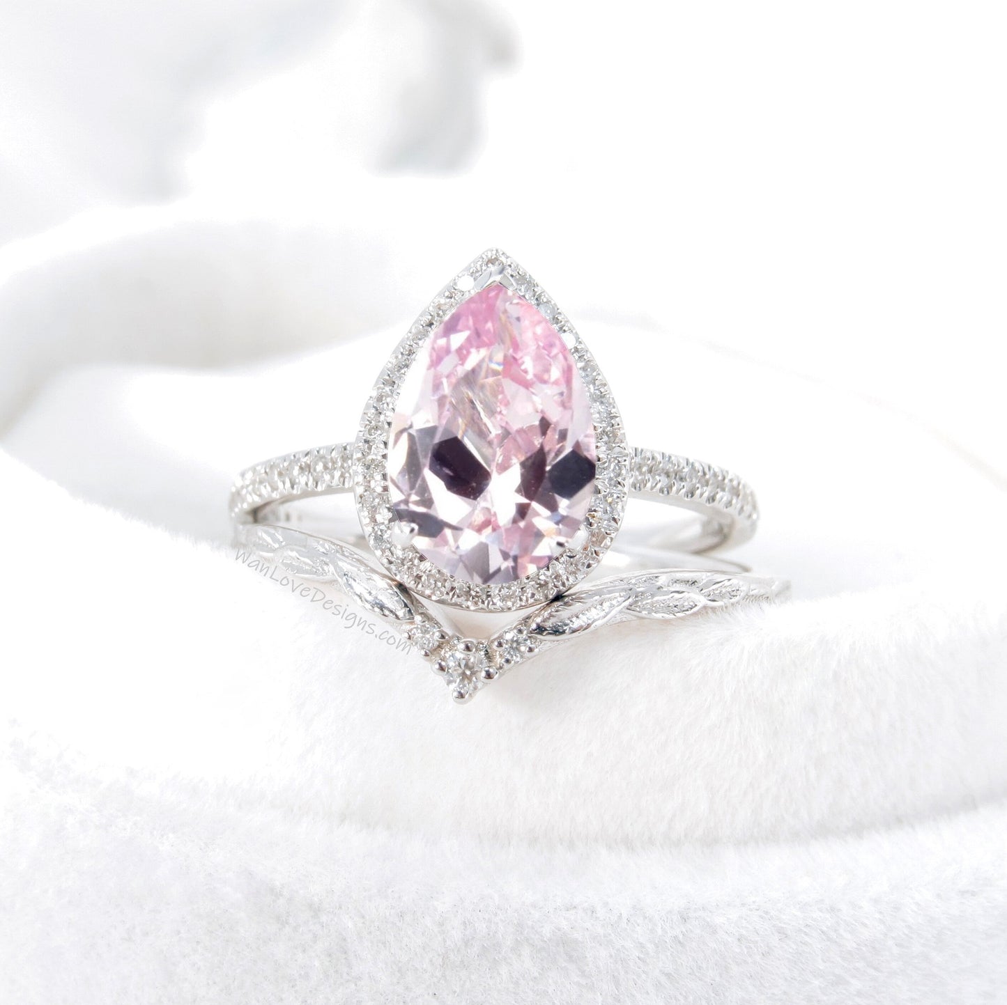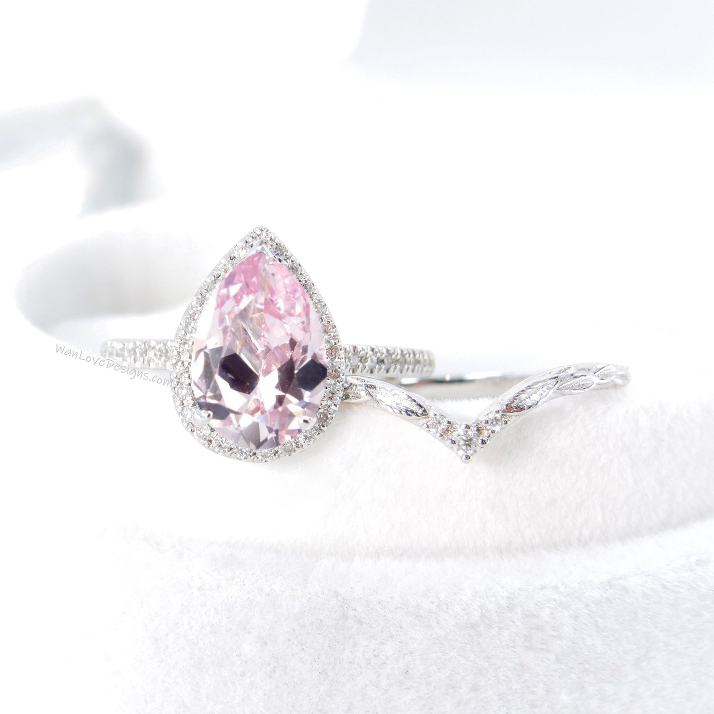 Set di anelli di fidanzamento con fascia curva e Halo con diamanti color pesca, zaffiro e pera | Fascia di nidificazione in oro 14K | Anello nuziale con foglie | Anello ispirato alla natura