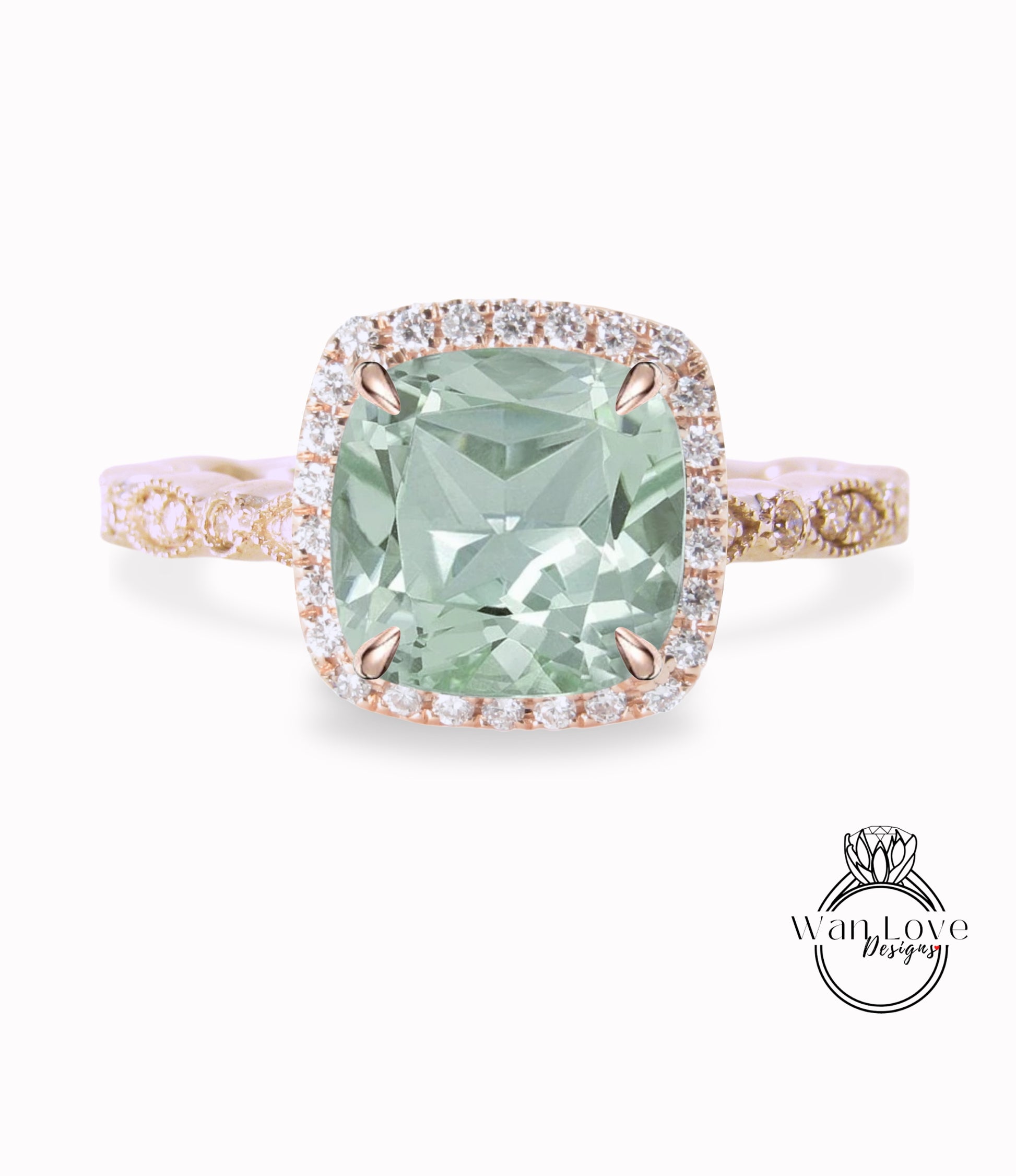 Anello di fidanzamento con ametista verde Prasiolite, Anello con diamante Halo cuscino, Anello con diamante di fidanzamento con ametista verde, Fascia smerlata con foglia Milgrain