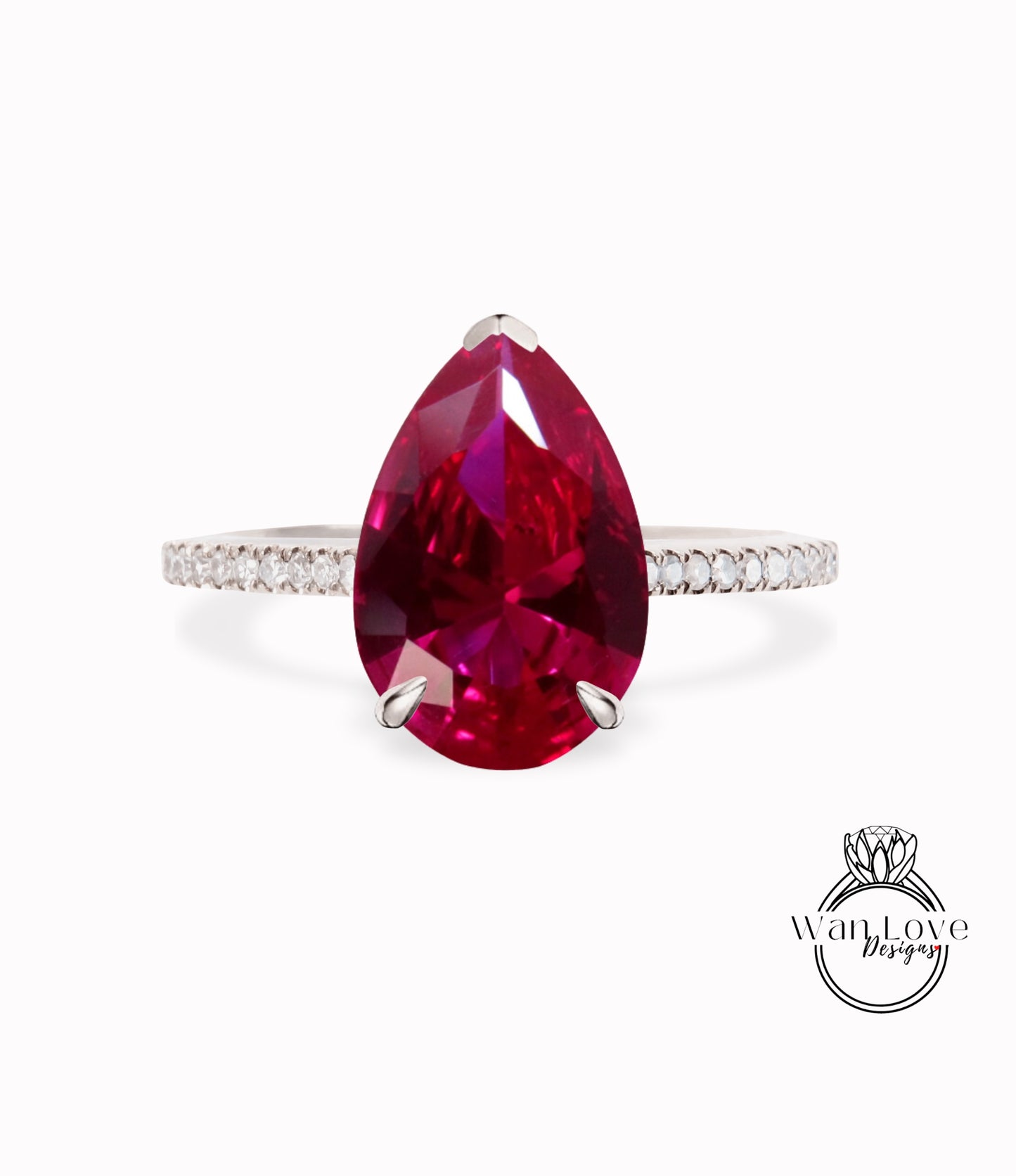 Anello di fidanzamento con rubini e diamanti con taglio a pera, Cattedrale di cesto, 14k 18k bianco giallo oro rosa-platino-anniversario di matrimonio personalizzato,WanLoveDesigns
