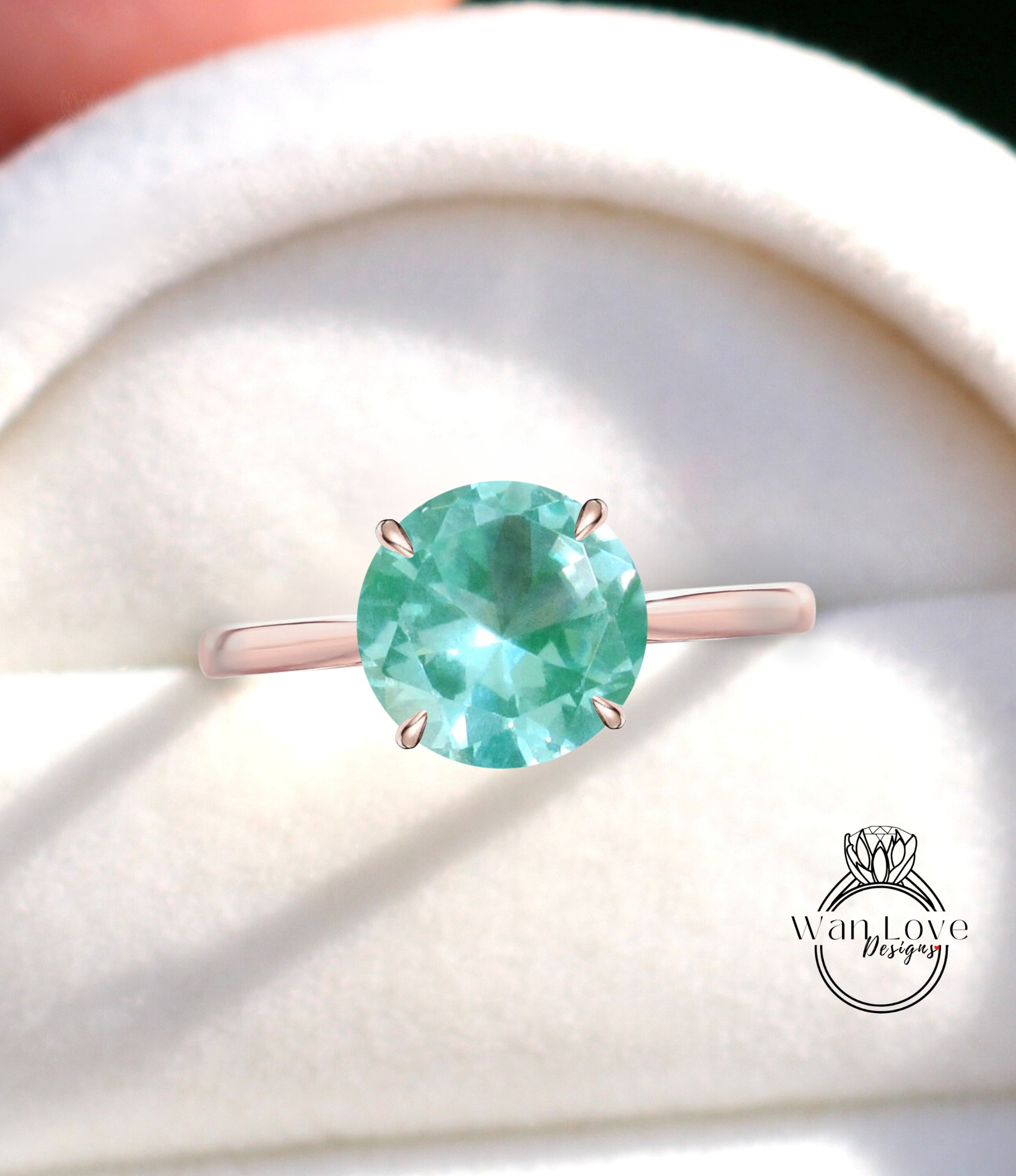 Anello di fidanzamento rotondo con spinello verde acqua e diamanti, alone laterale, quasi eternità, con gambo sottile, regalo personalizzato per anniversario di platino, oro 14kt 18kt.