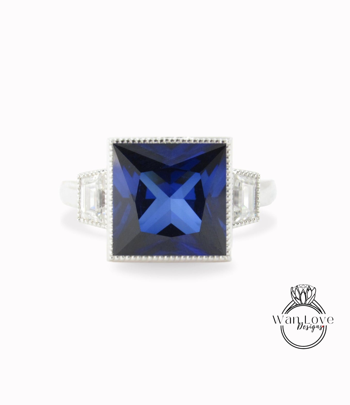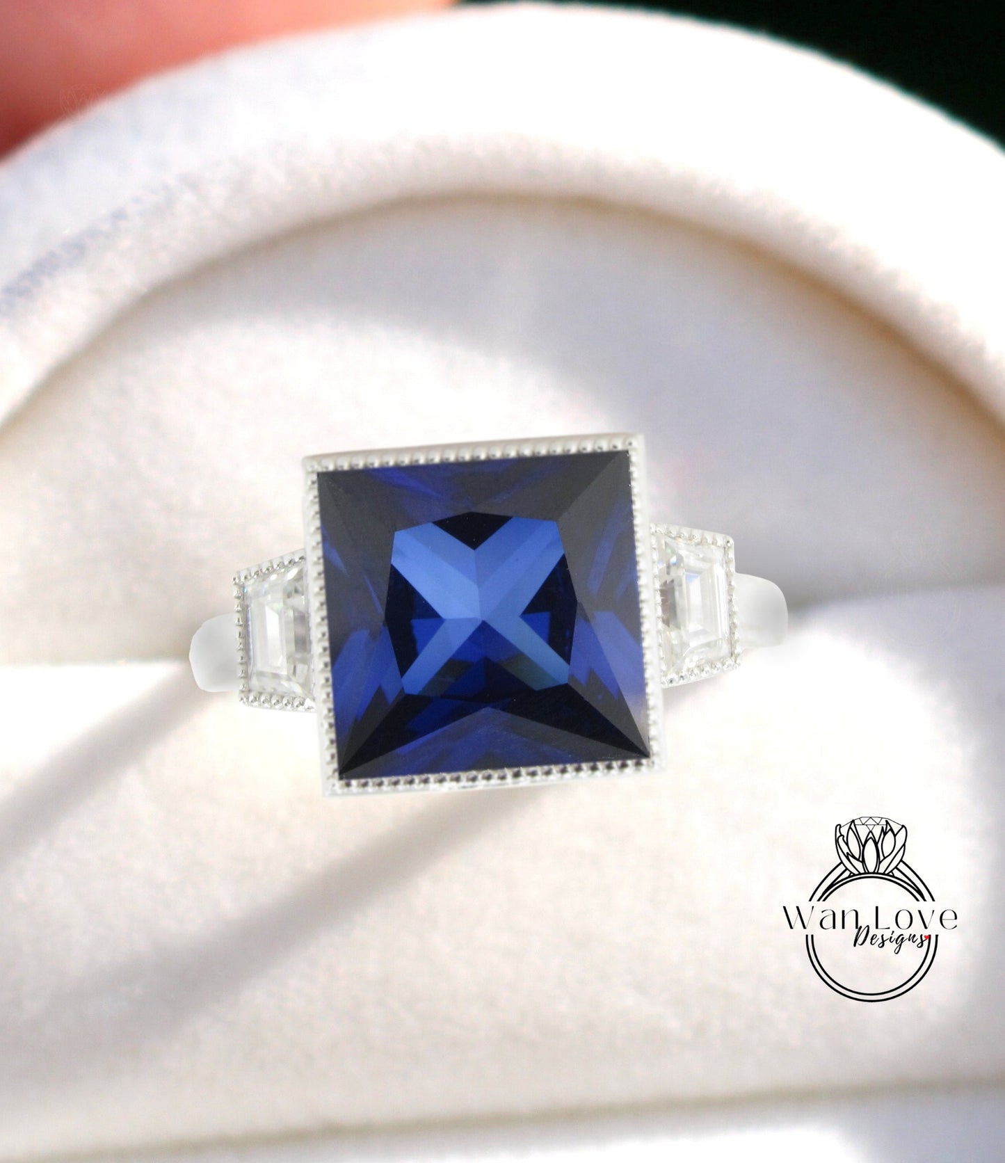 Anello a tre pietre unico, anello a grappolo di zaffiro blu e moissanite, anello di moissanite trapezoidale, anello principessa unico, personalizzato,WanLoveDesign