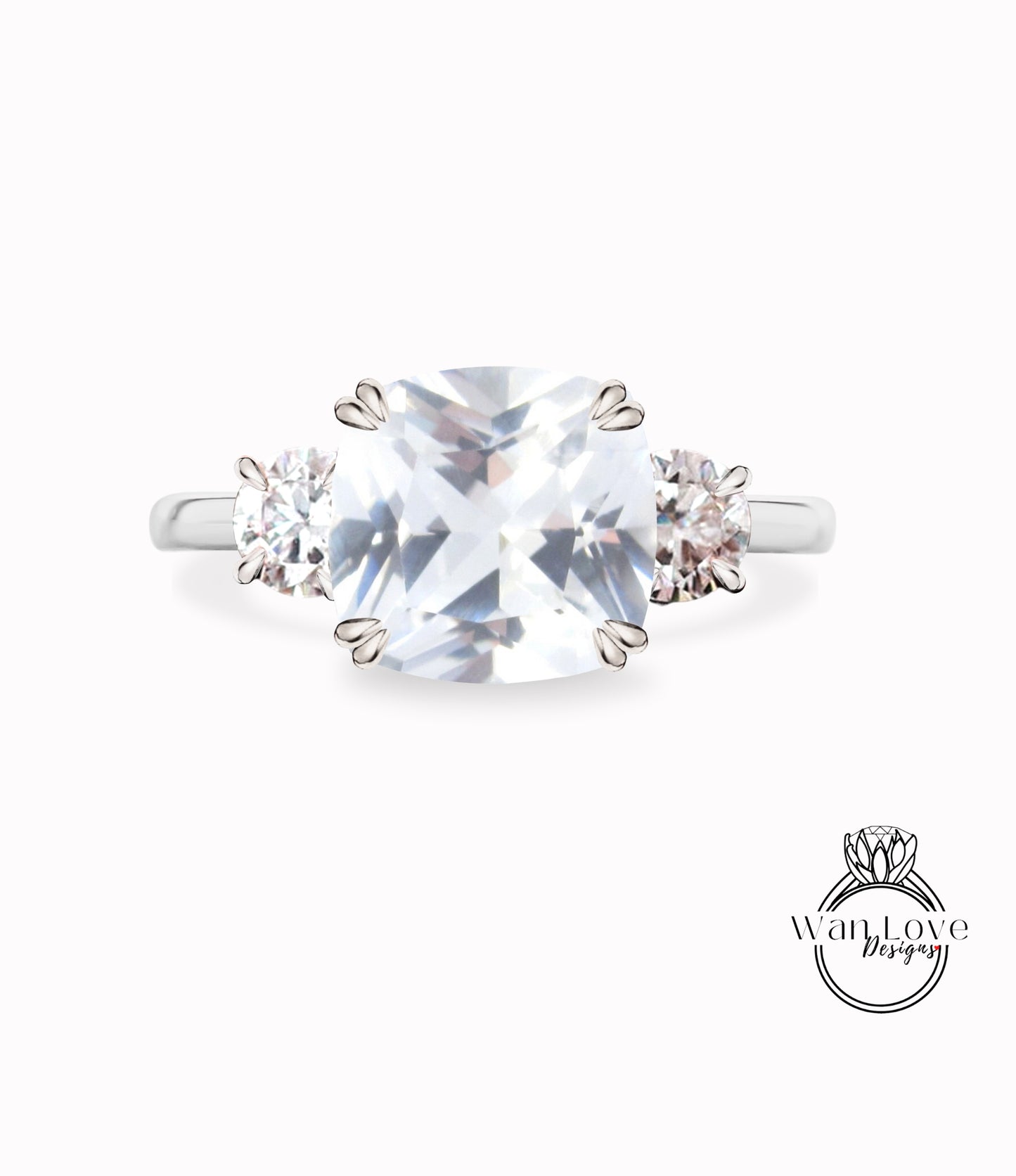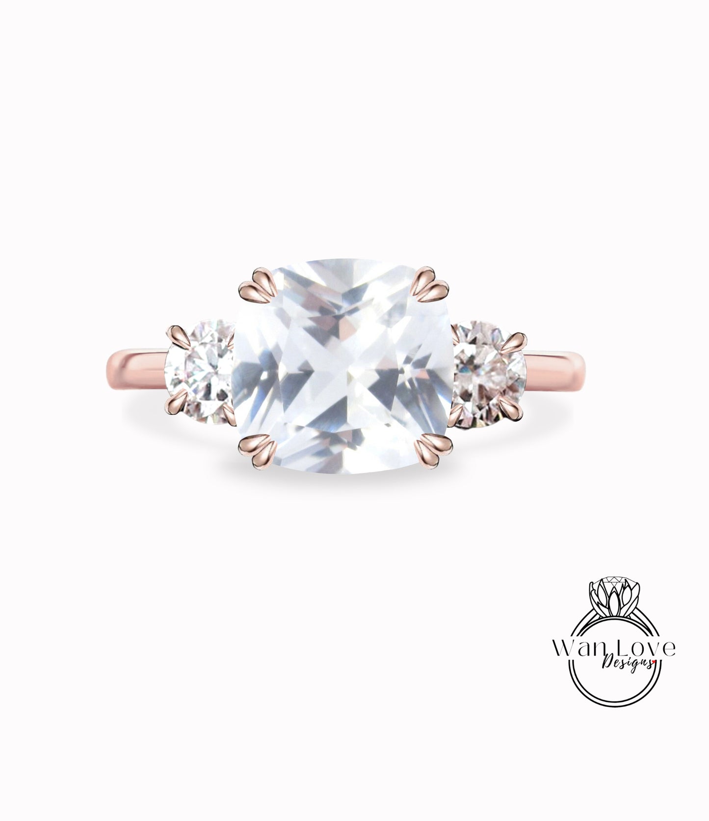 Cuscino con zaffiro bianco e anello di fidanzamento rotondo con 3 pietre-3ct-.75ct-8mm-5mm-14k-18k-bianco giallo oro rosa-platino-anniversario di matrimonio personalizzato