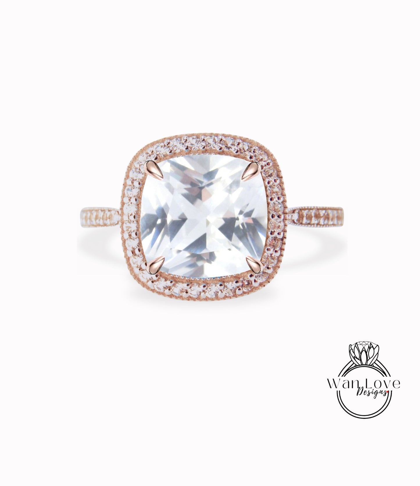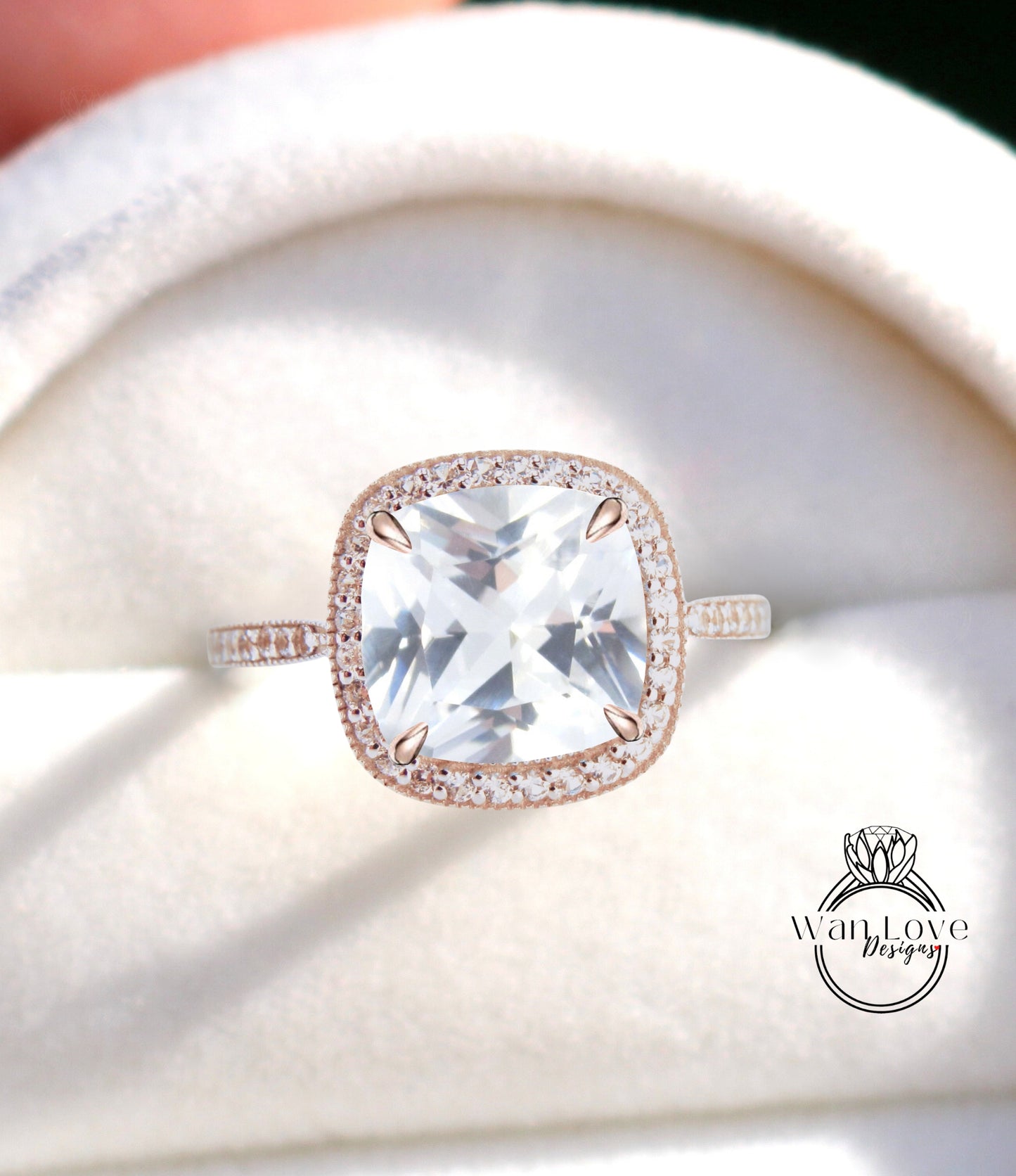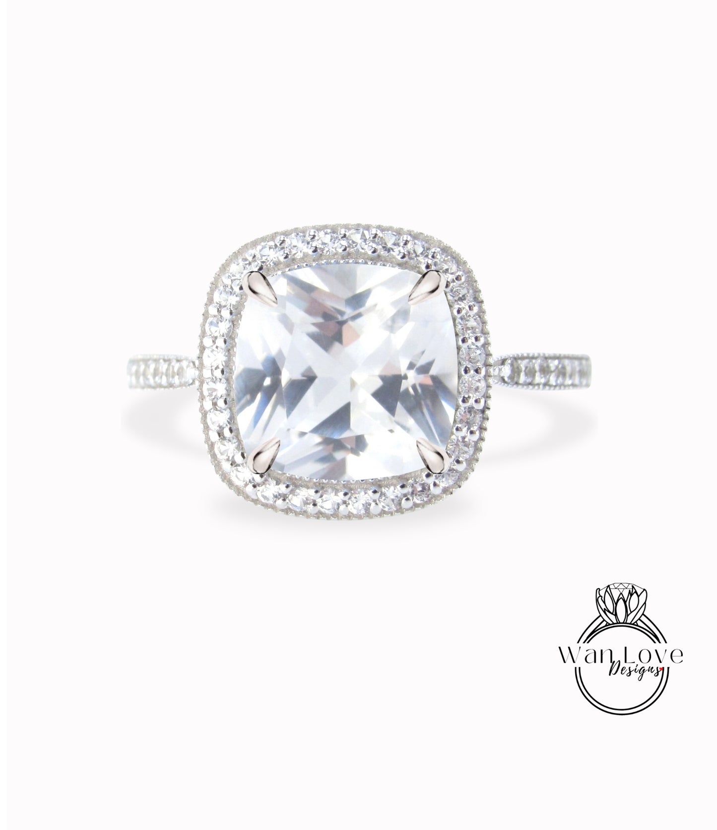 Anello di fidanzamento in filigrana con cuscino antico con zaffiro bianco e diamante, 14k 18k bianco giallo oro rosa-platino-promessa di matrimonio personalizzata-rotondo