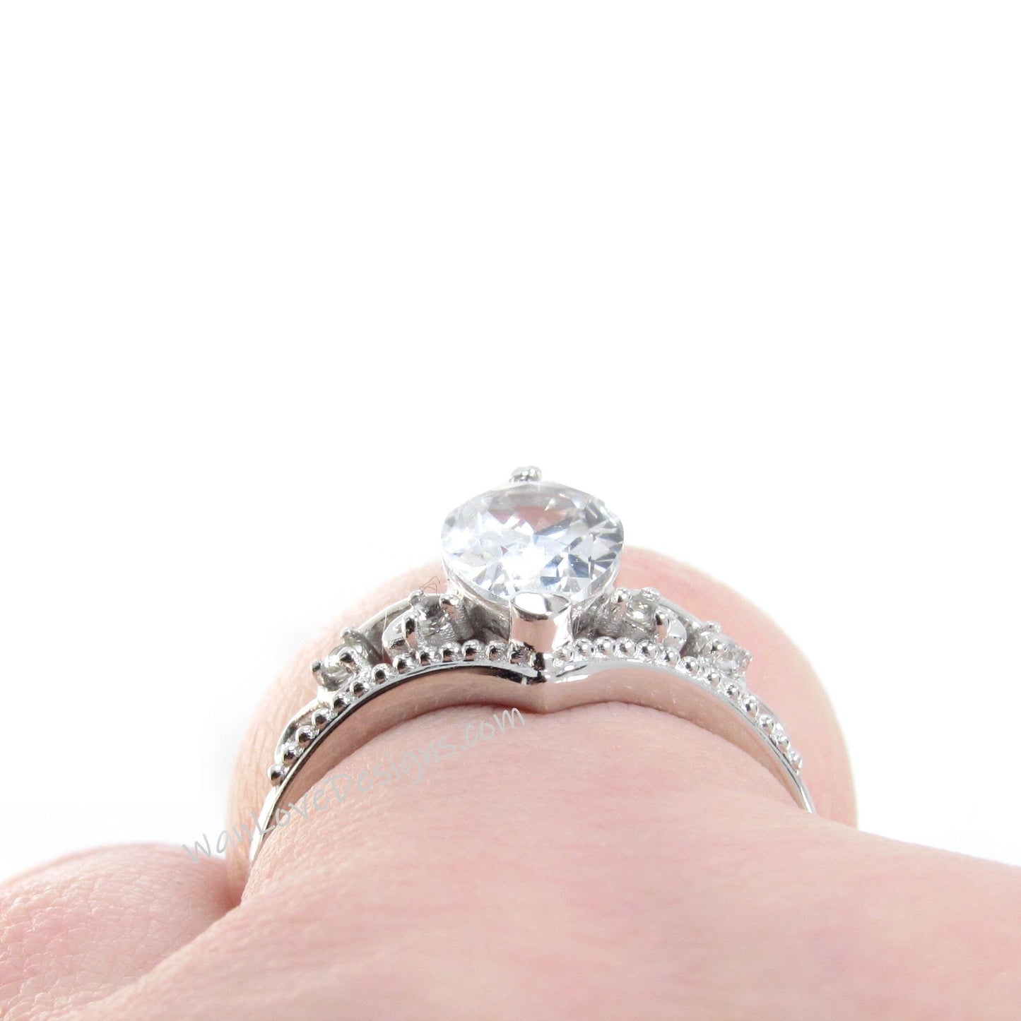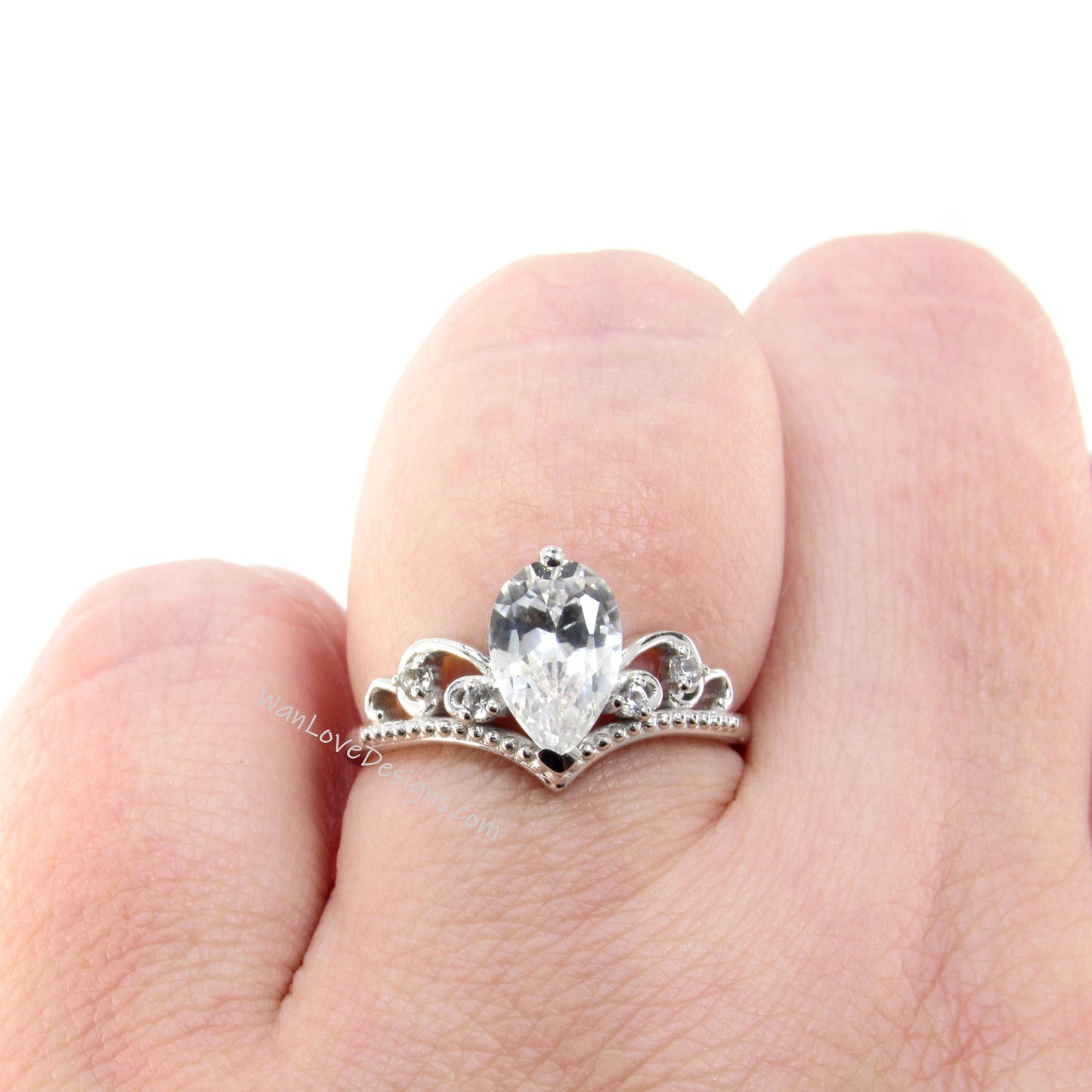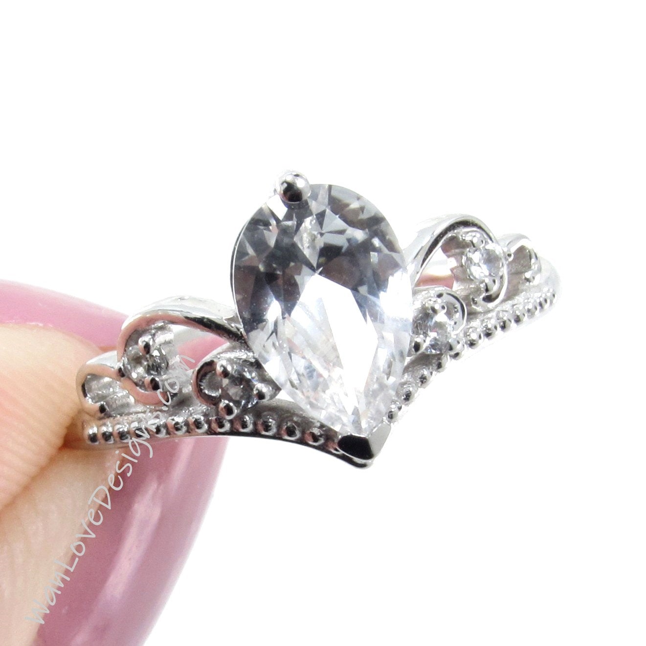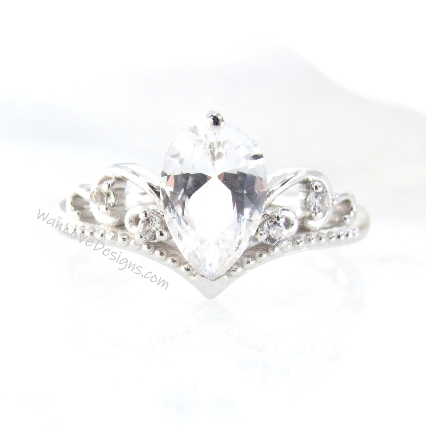 Anello di fidanzamento con diadema con corona di pere e diamanti in zaffiro bianco, fede nuziale sagomata Royal Princess V, anello con zaffiro bianco pera, regalo nuziale per lei