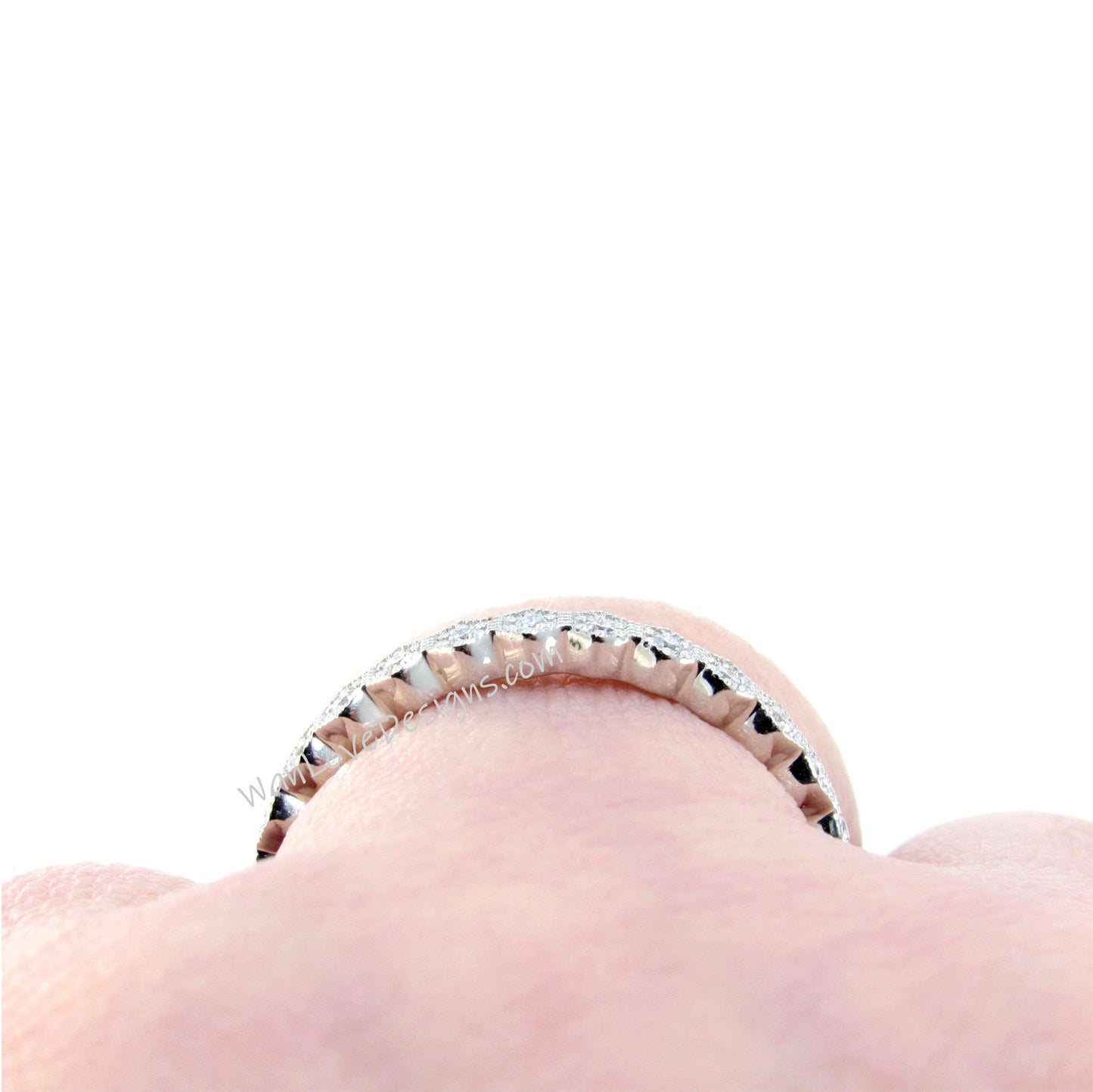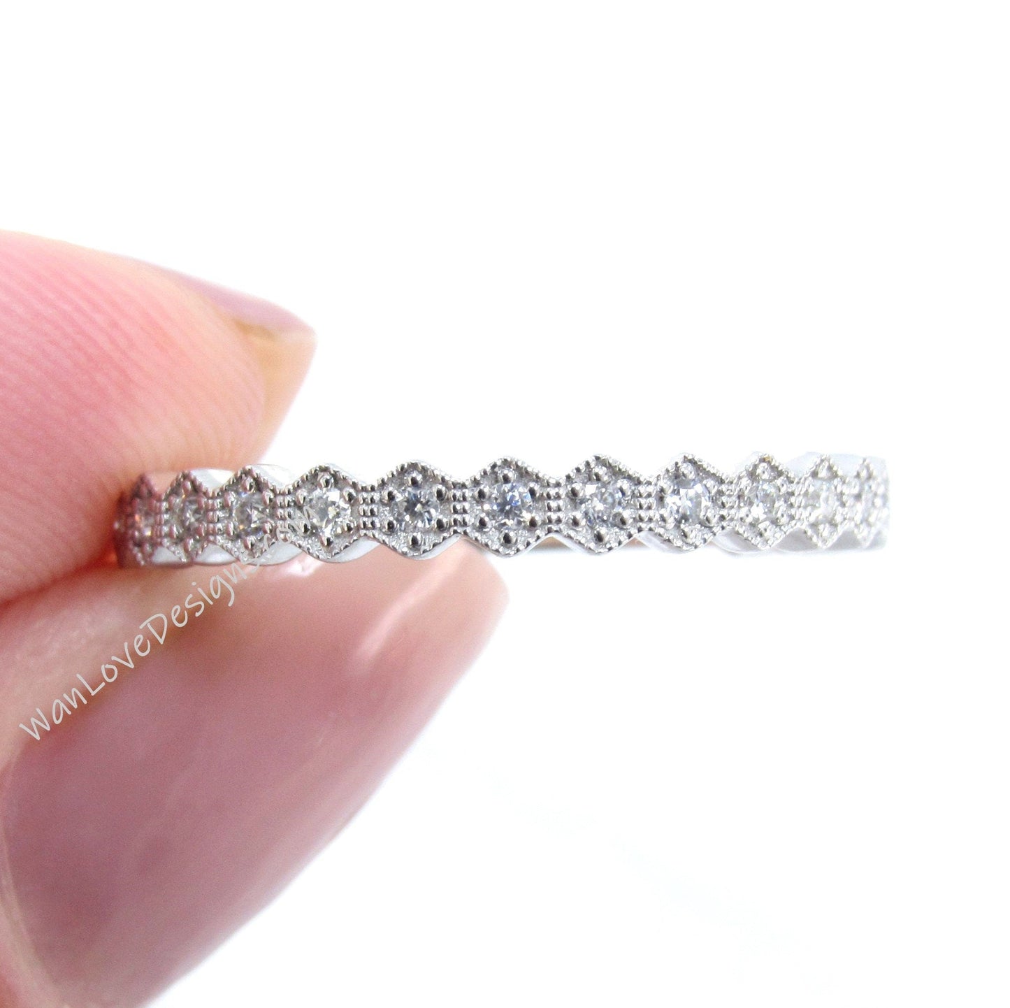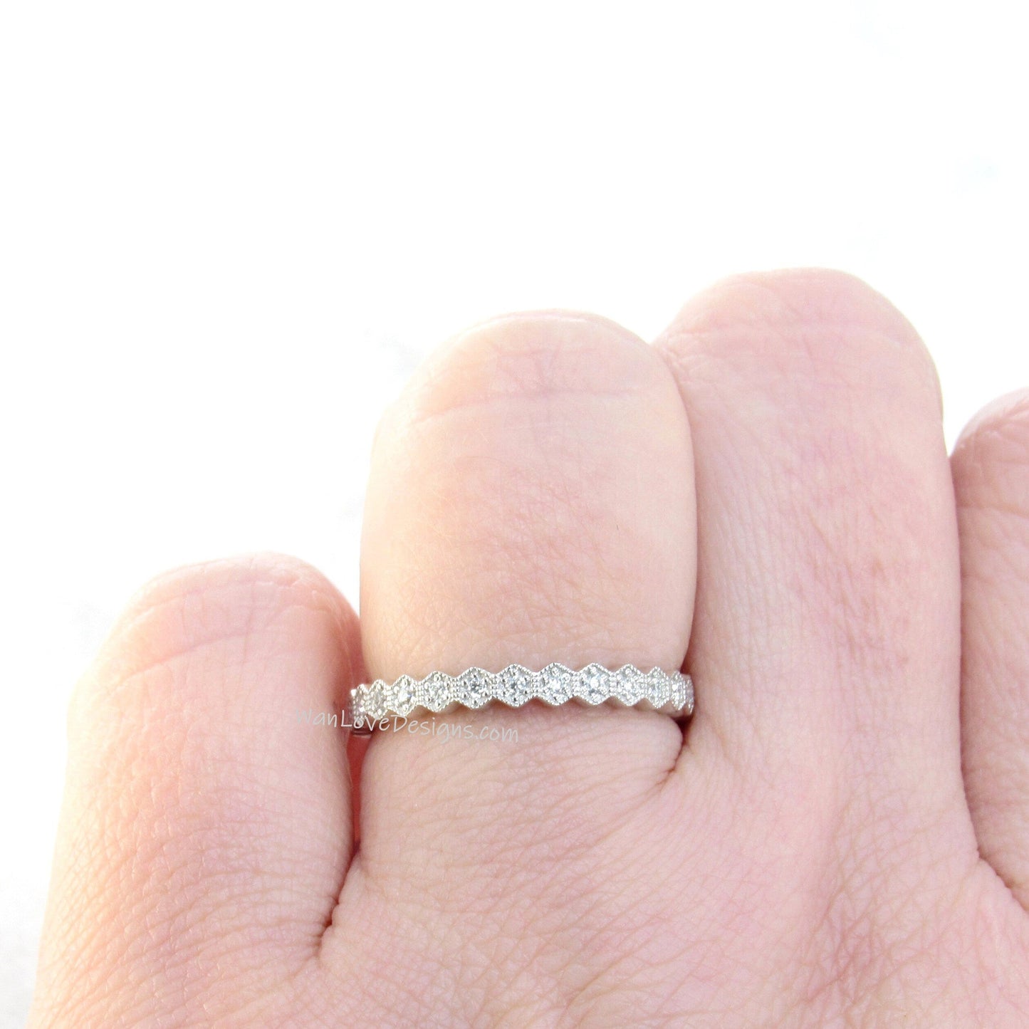 Fascia esagonale Art Déco milgrain, fede nuziale in zaffiro bianco, anello quasi eternità, fascia in oro bianco, anello impilabile in zaffiro, pronto per la spedizione