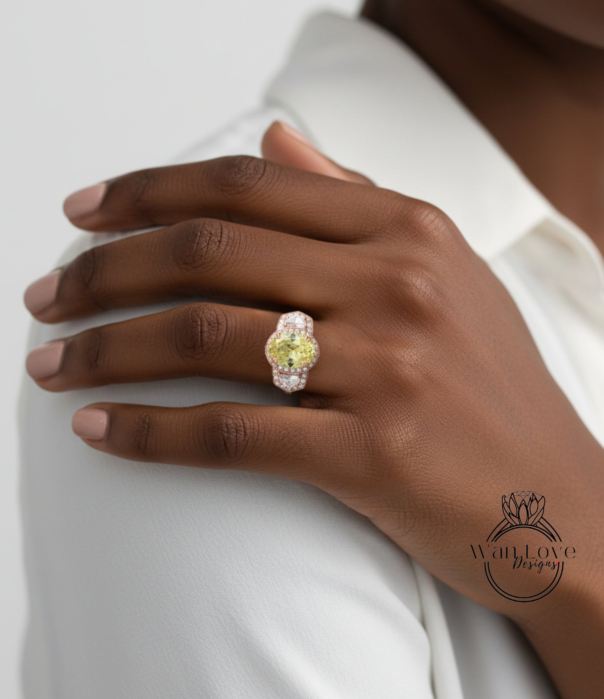 Anello di fidanzamento ovale con zaffiro rosa chiaro e diamanti, trapezio a mezzaluna, 3 ct, 9x7 mm, personalizzato, oro rosa giallo bianco 14k 18k, platino, matrimonio