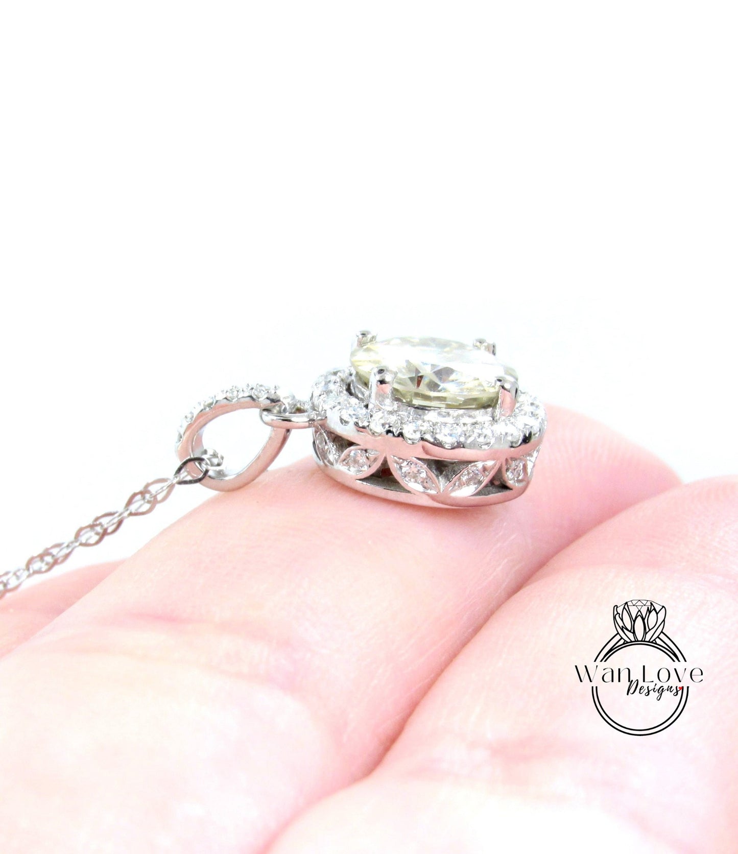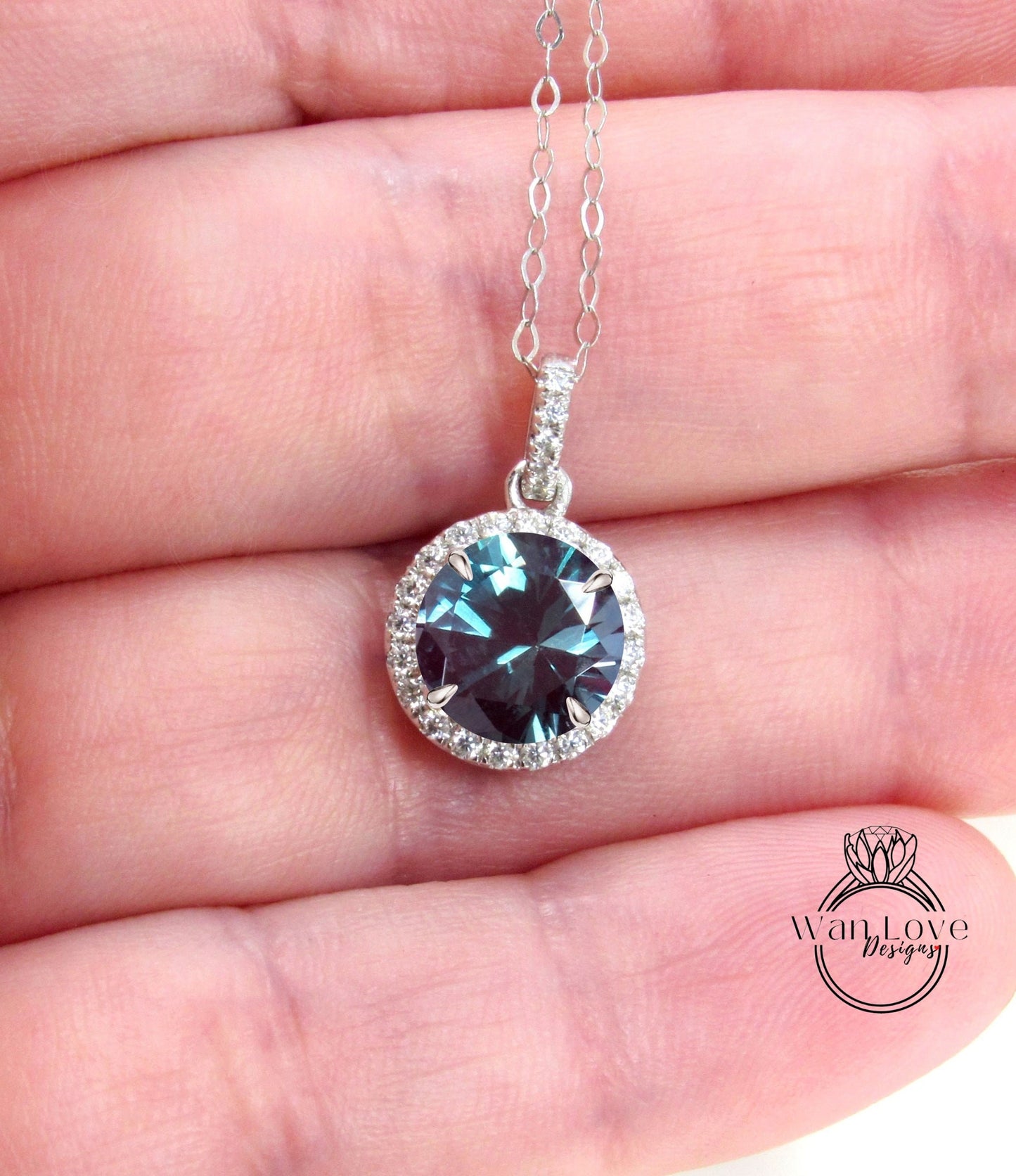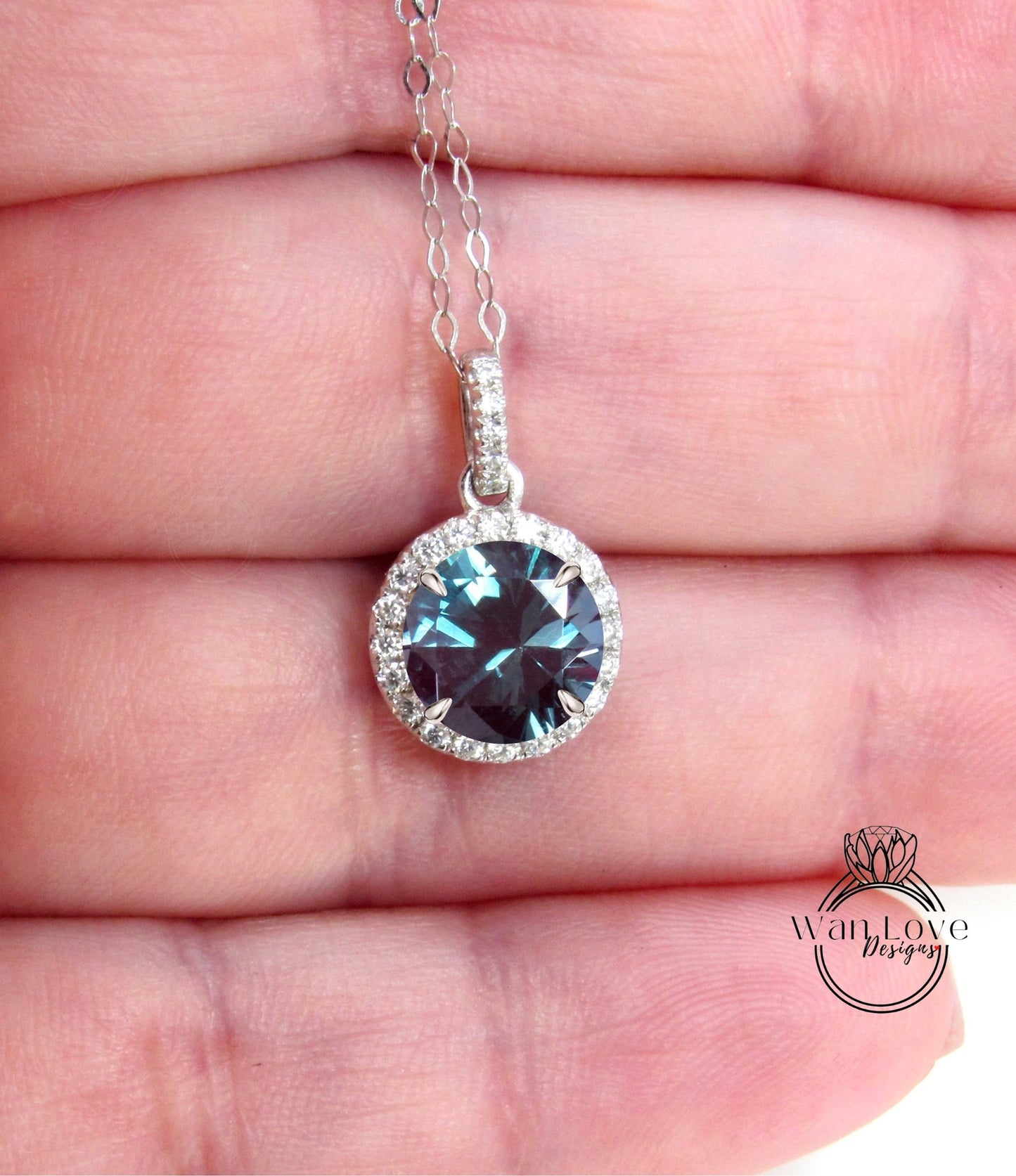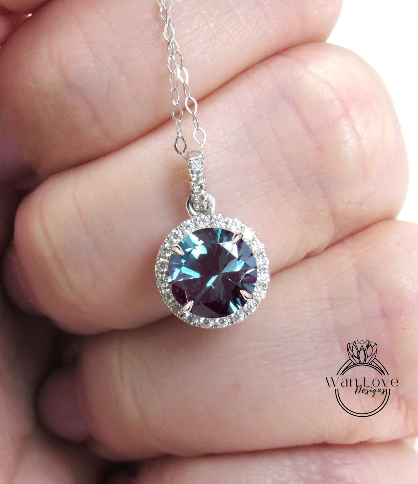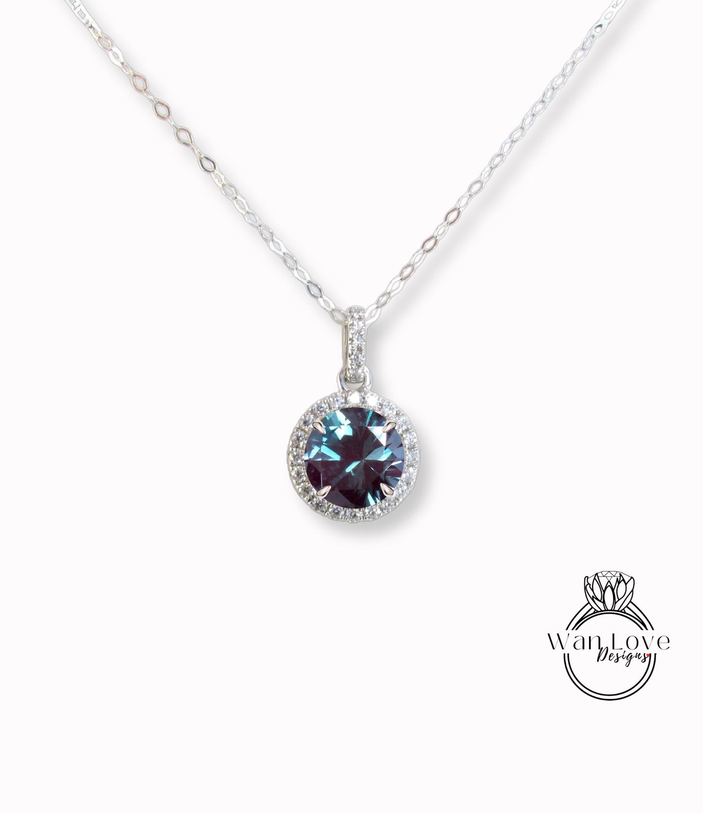 14K White Gold /Round Halo Necklace /Round Alexandrite and Diamond Necklace /Layering Diamond Necklace /Dainty Diamond Necklace/Gift for her