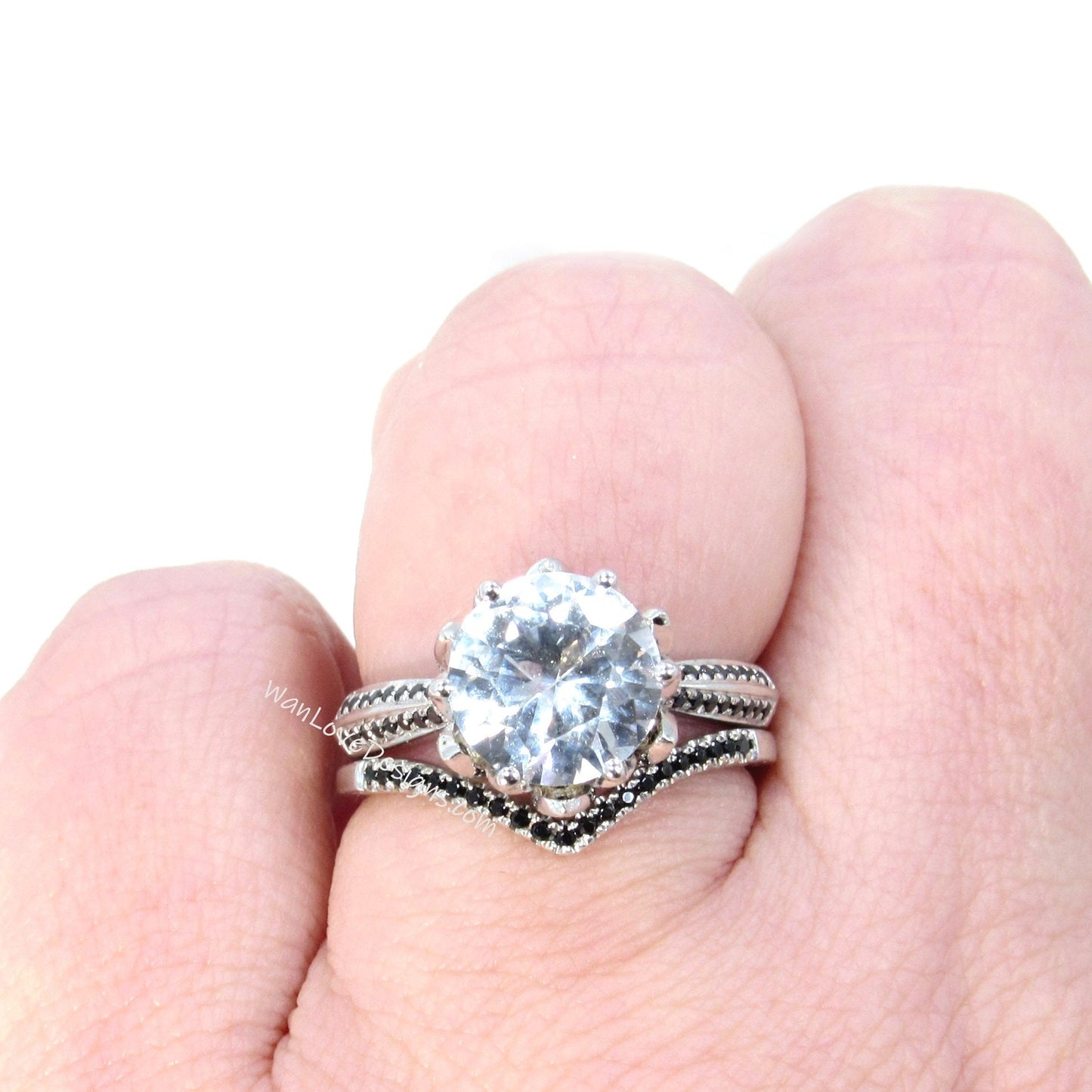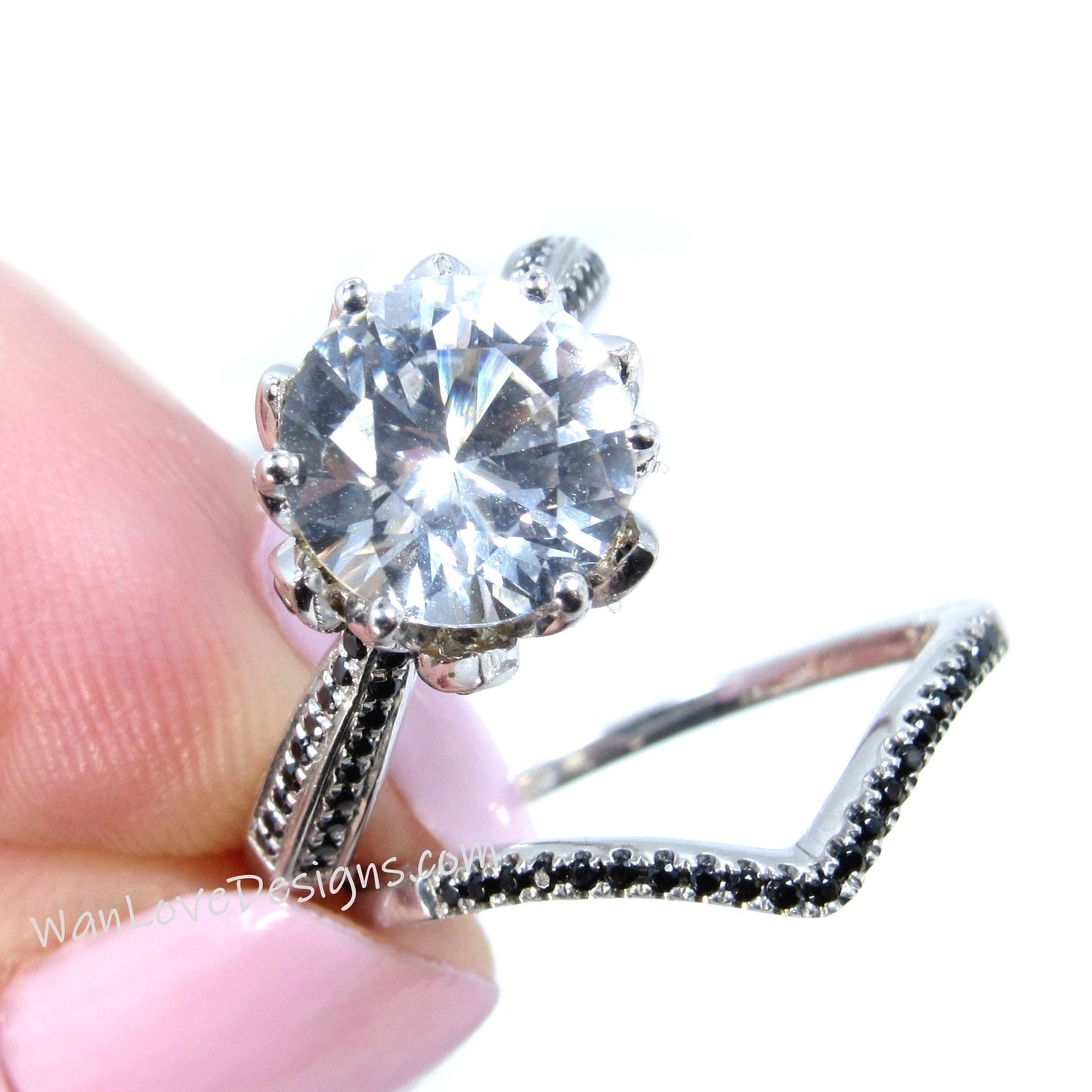 3 Carat White Sapphire Lotus engagement ring-Flower Nature inspired engagement ring-Black Spinel Lotus ring- vintage ring set-Ready to Ship.