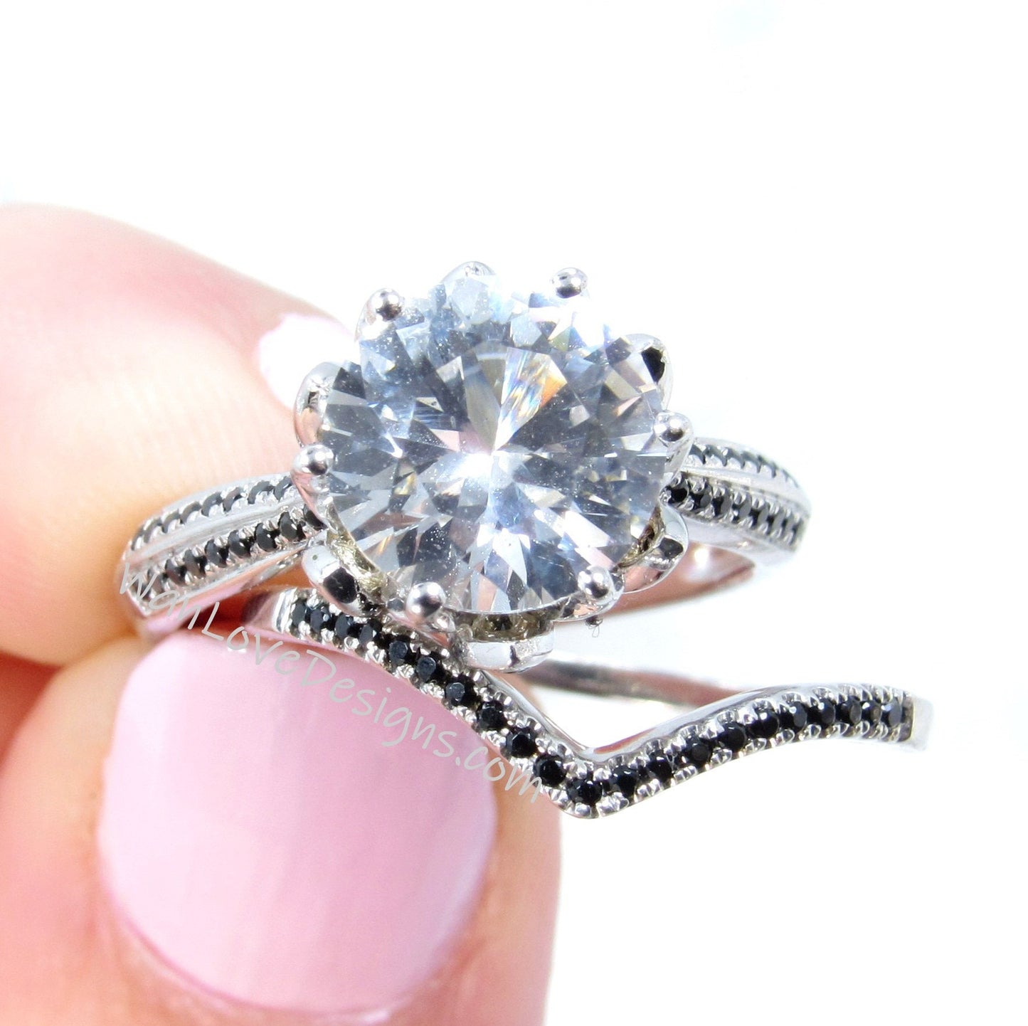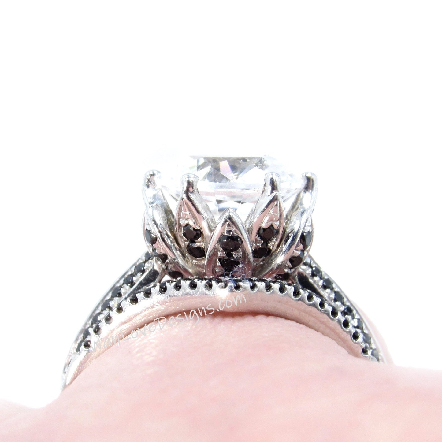 3 Carat White Sapphire Lotus engagement ring-Flower Nature inspired engagement ring-Black Spinel Lotus ring- vintage ring set-Ready to Ship