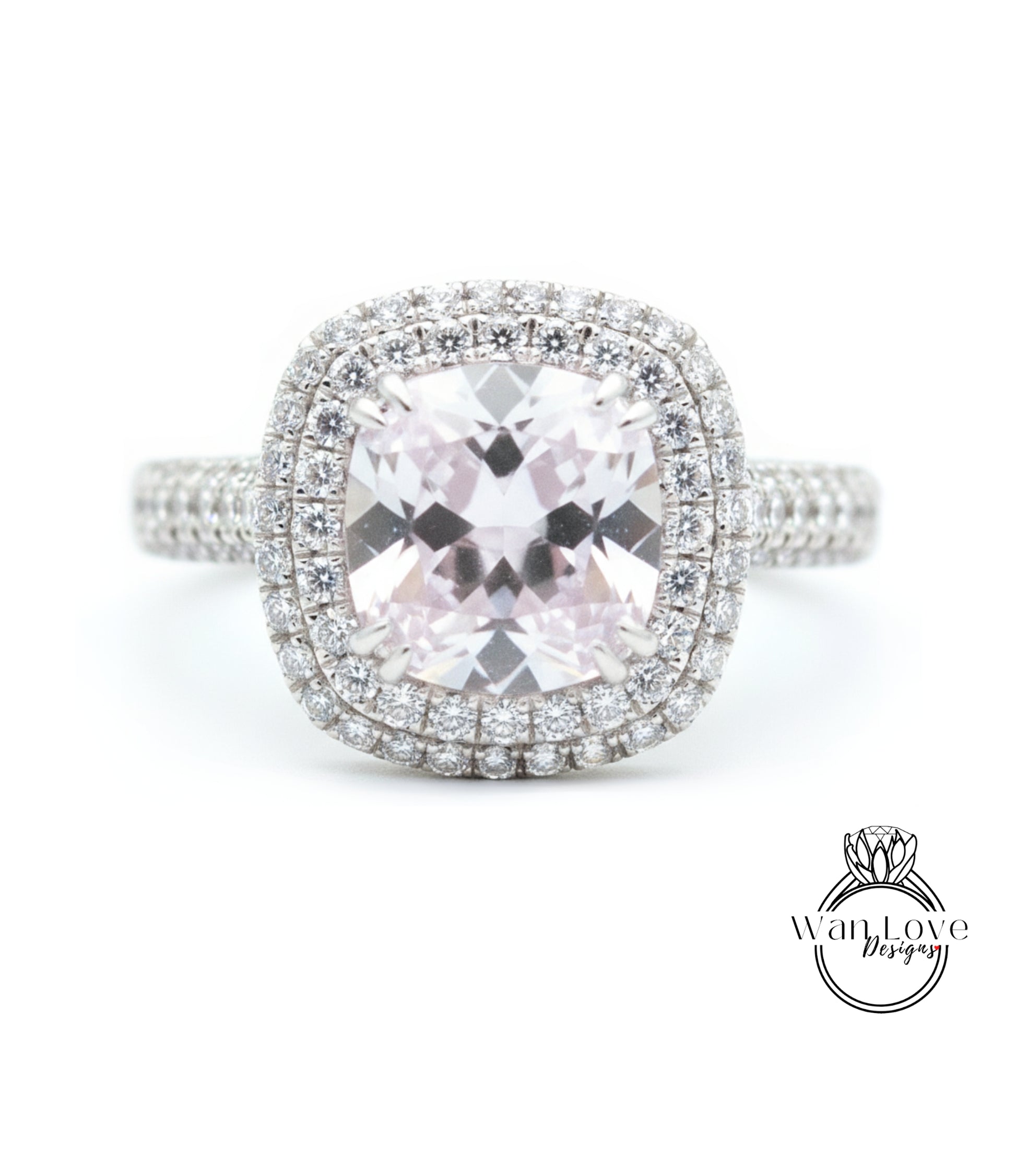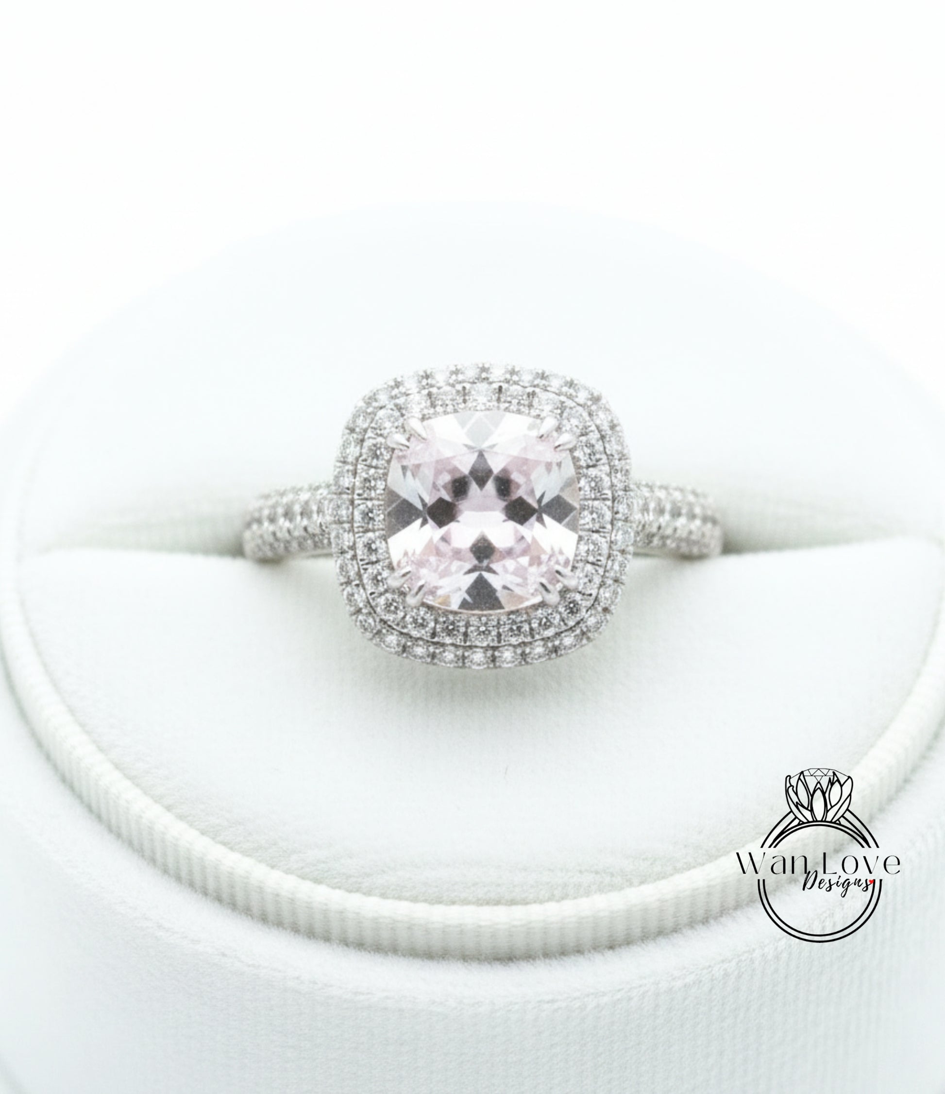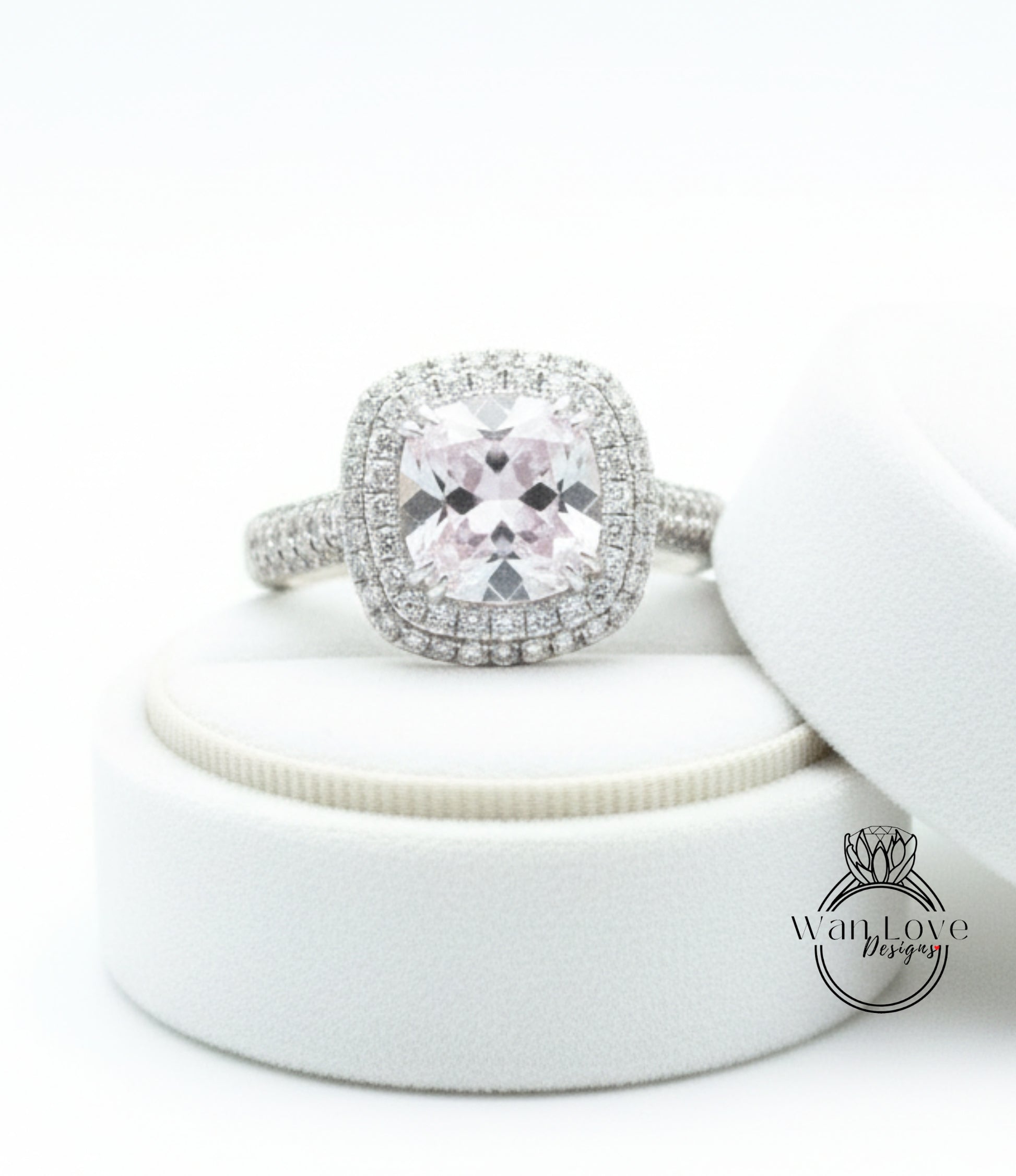 4ct Light Pink & White Sapphire Engagement Ring 3 Row band Pillow Cushion Double Halo sapphire ring unique wedding promise anniversary Gift