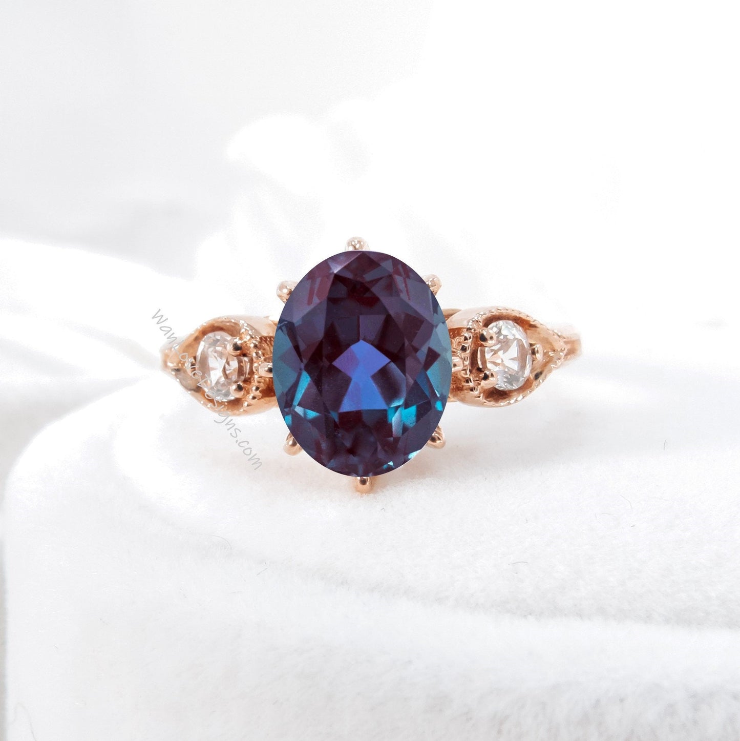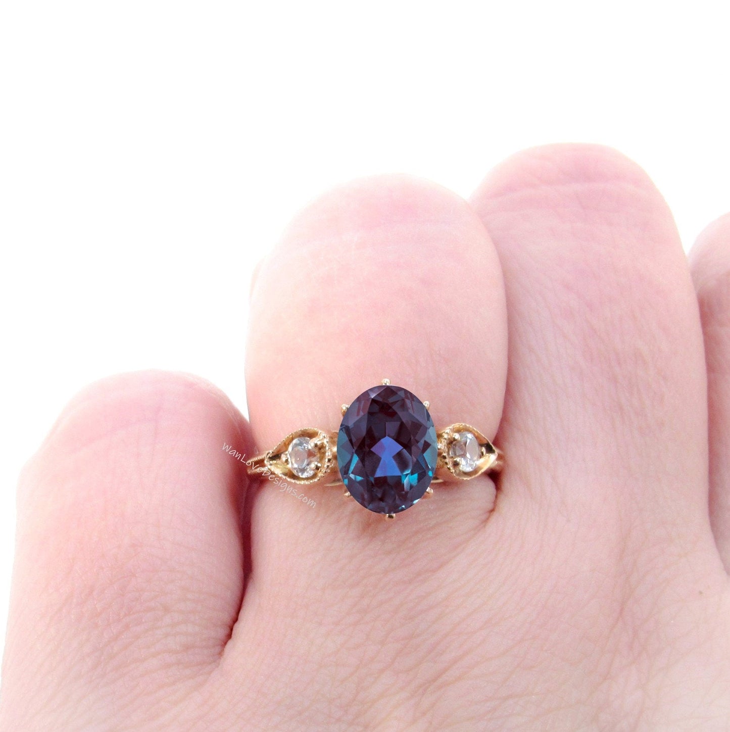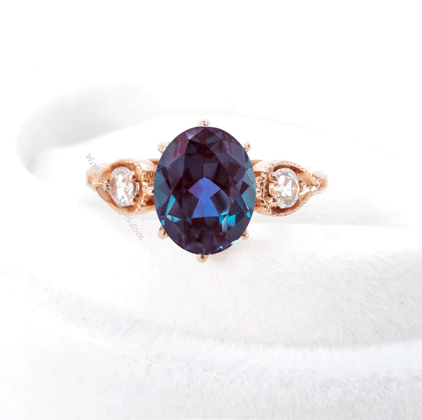 Alexandrite Diamond 3 Gem Oval Round Pear Bezel Milgrain 8 prong Engagement Ring,3ct,9x7mm,3mm,Custom,Wedding,14k 18k White Rose Yelow Gold