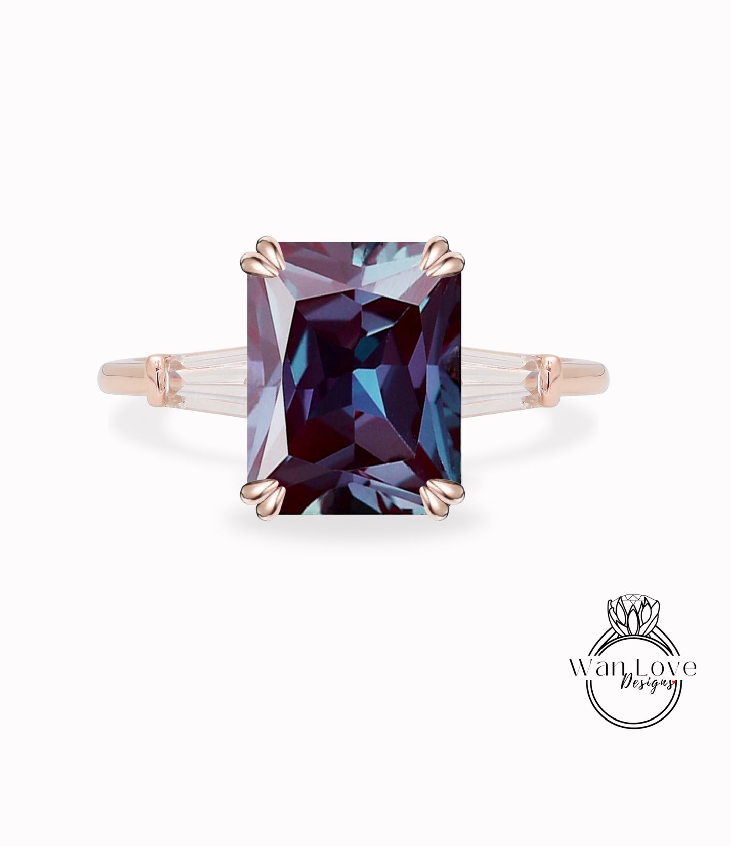 Alexandrite & Diamond 3 gem stone Emerald Cut with Tapered Baguettes Engagement Ring 14k 18k White Yellow Rose Gold-Platinum-Custom-Anniversary Gift
