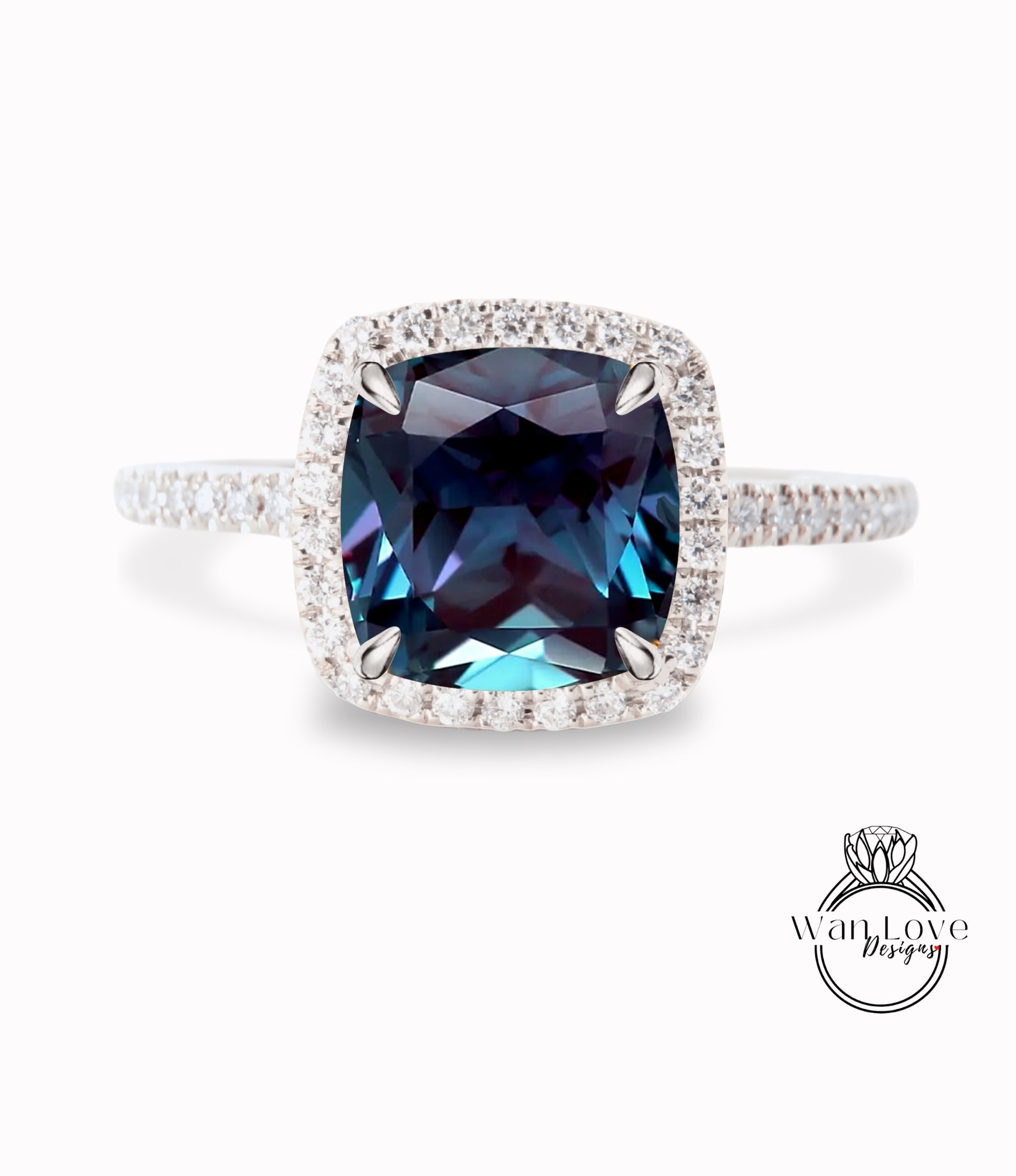 Alexandrite & Diamond Cushion Halo Engagement Ring, Half Eternity Rose White Gold ring Custom, Bridal Wedding ring, Anniversary Gift