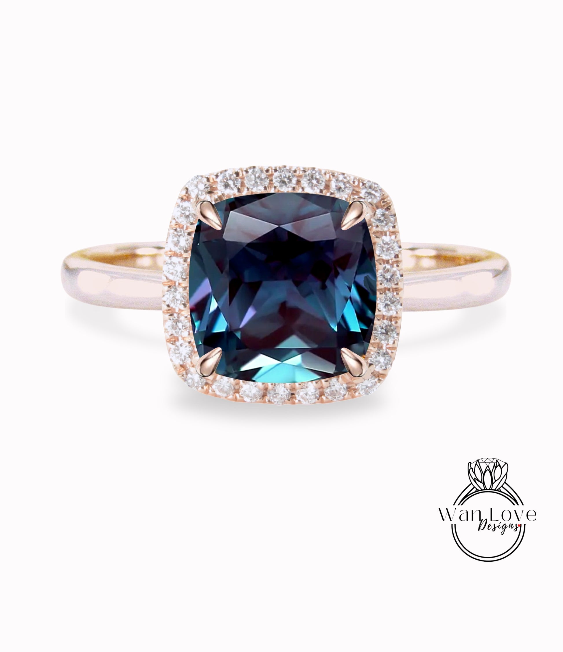 Alexandrite & Diamond Cushion Halo engagement ring rose gold tapered plain thin dainty band art deco anniversary gift