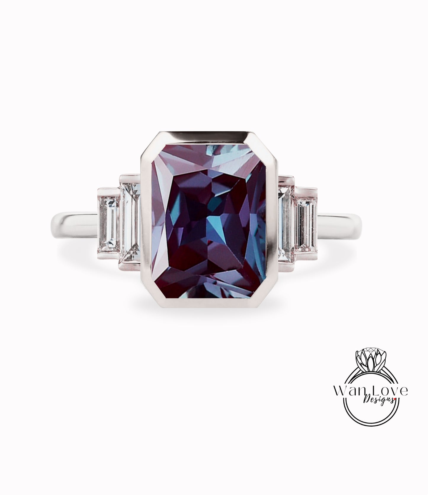 Alexandrite & Diamond Emerald cut Baguette Bezel 5 Gemstone Art Deco Moissanite Diamond Engagement Ring Custom Wedding Anniversary Gift