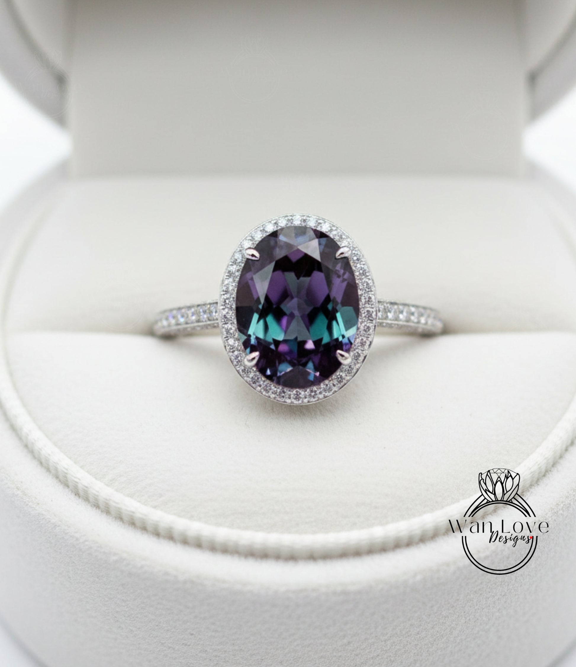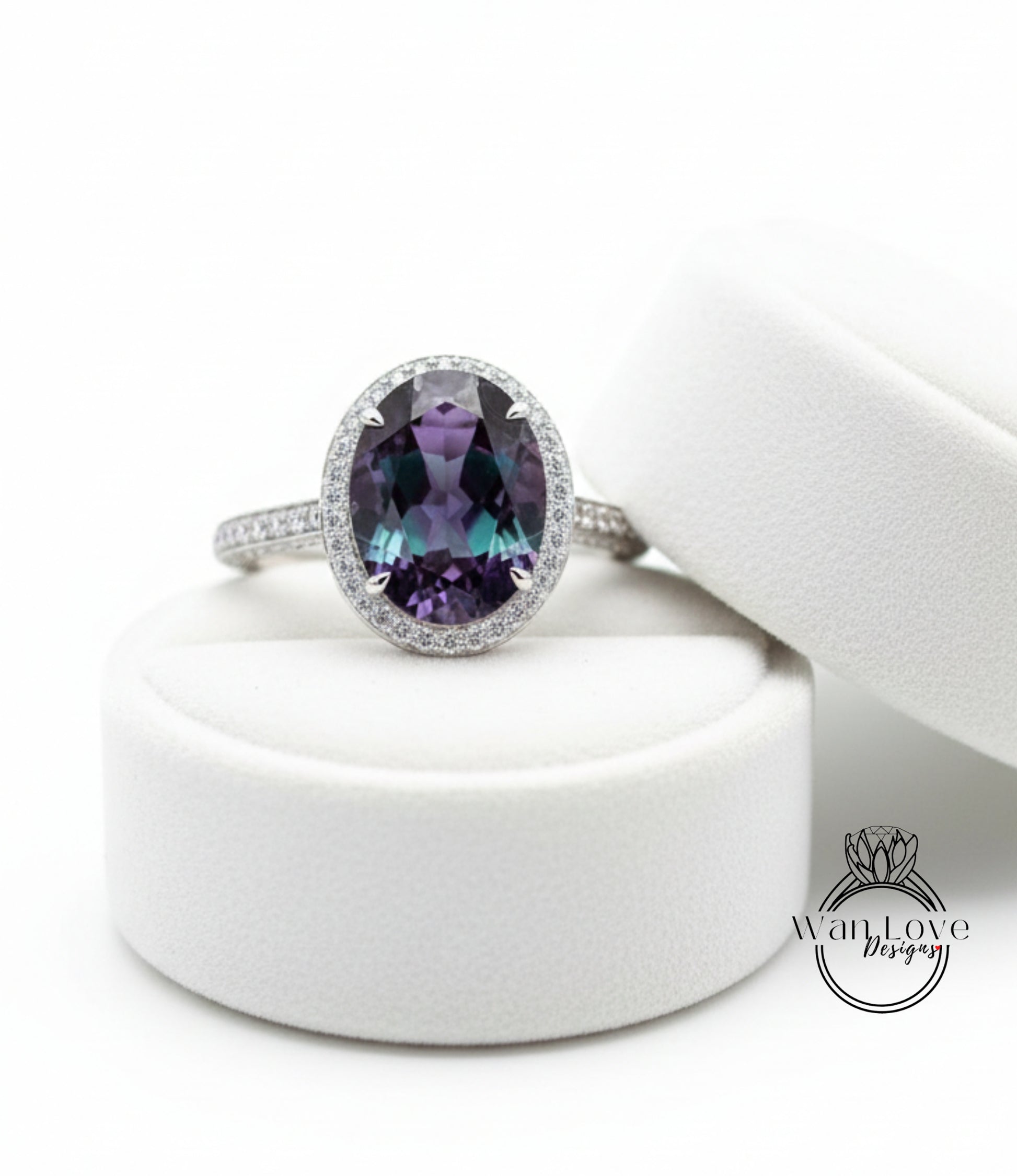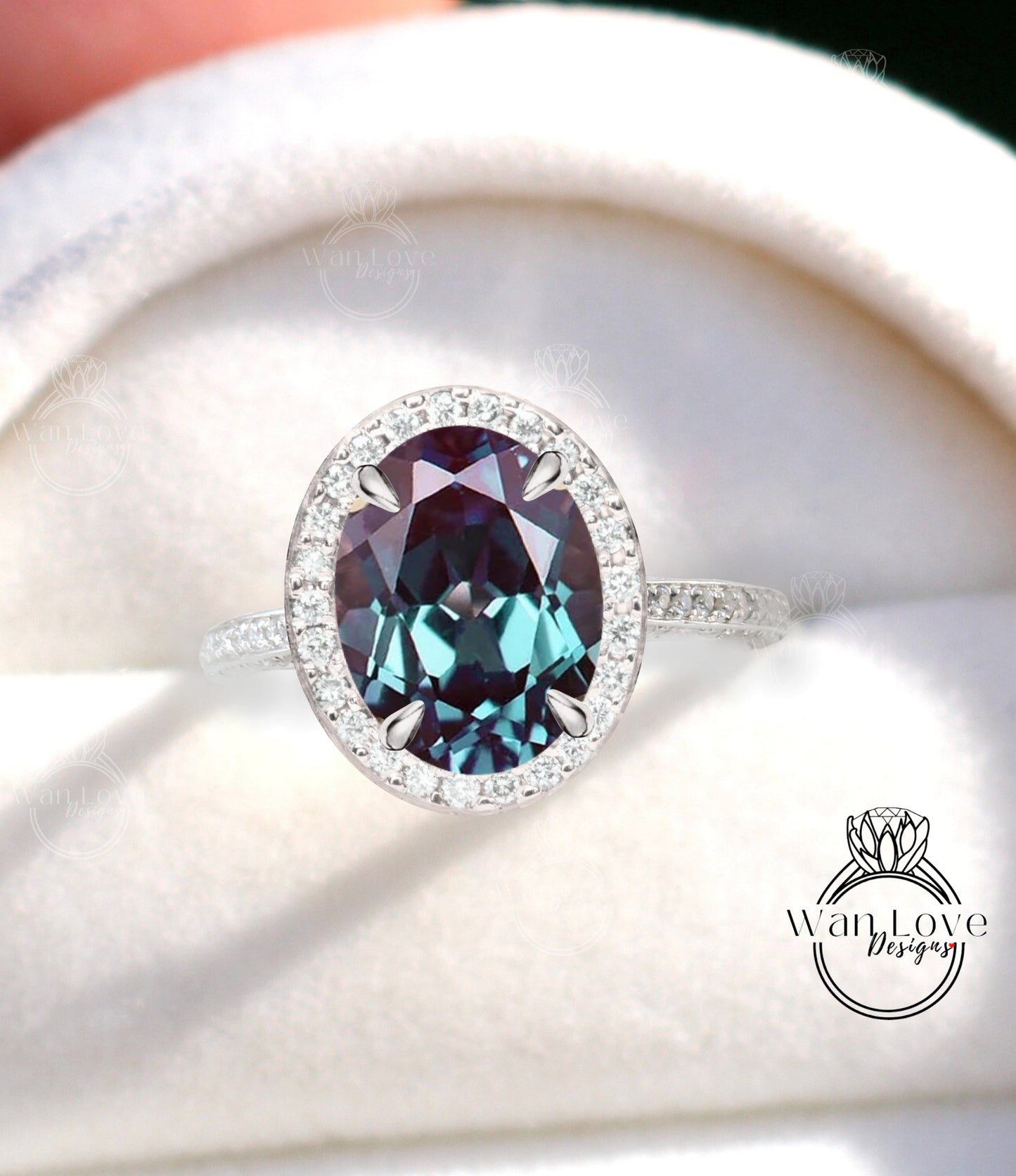 Alexandrite & Diamond Oval Halo 3 sided Engagement Ring, 14k 18k White Yellow Rose Gold, Platinum, Wedding, Anniversary Gift