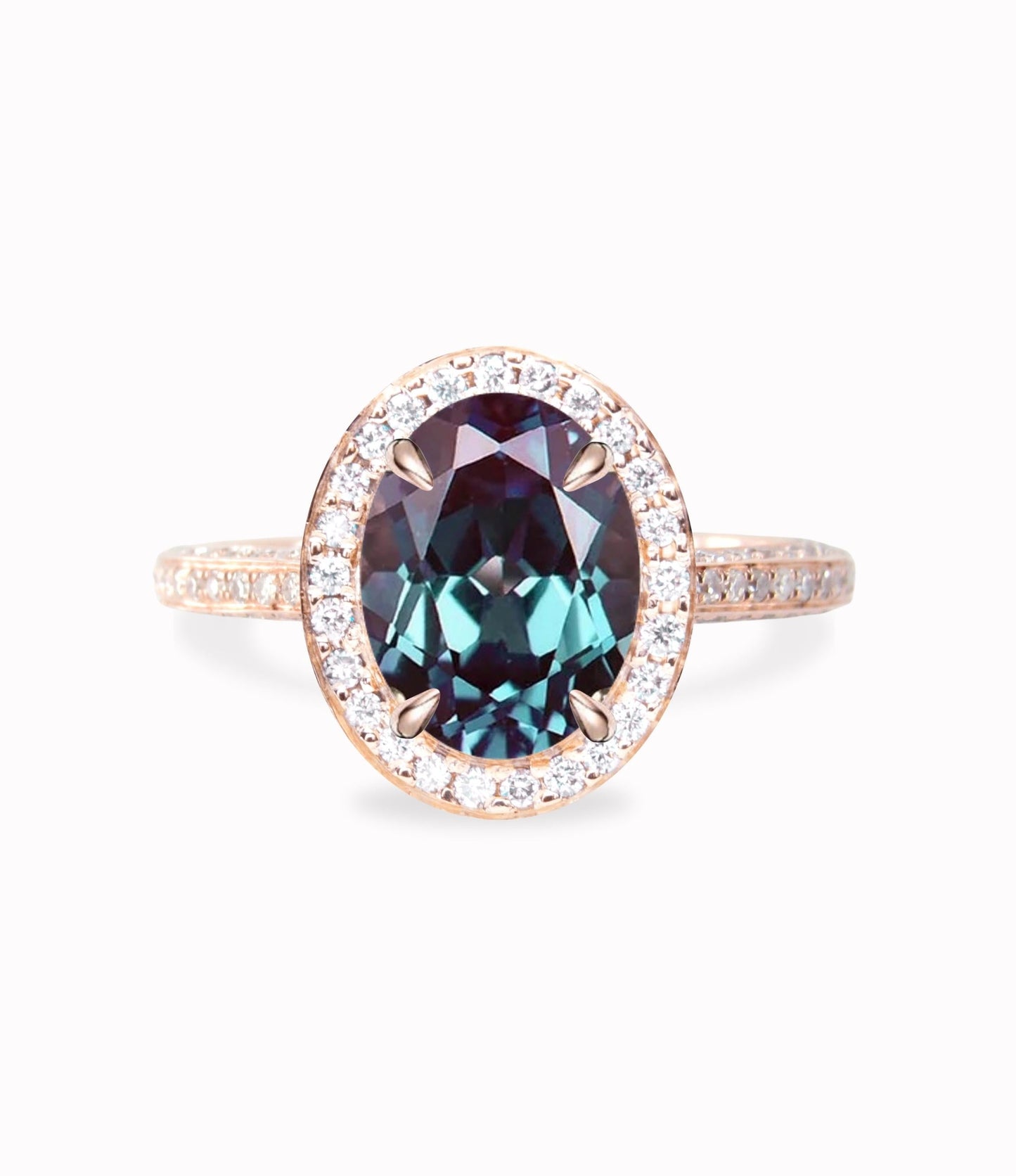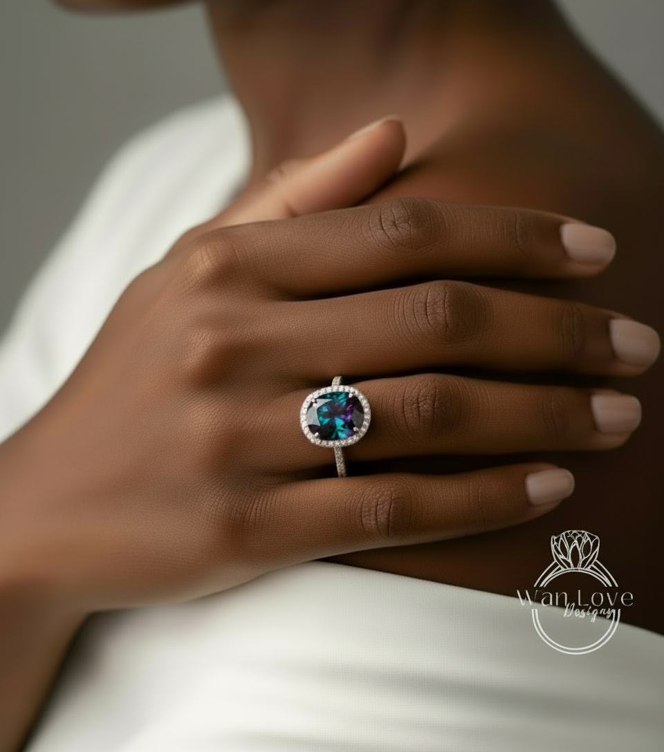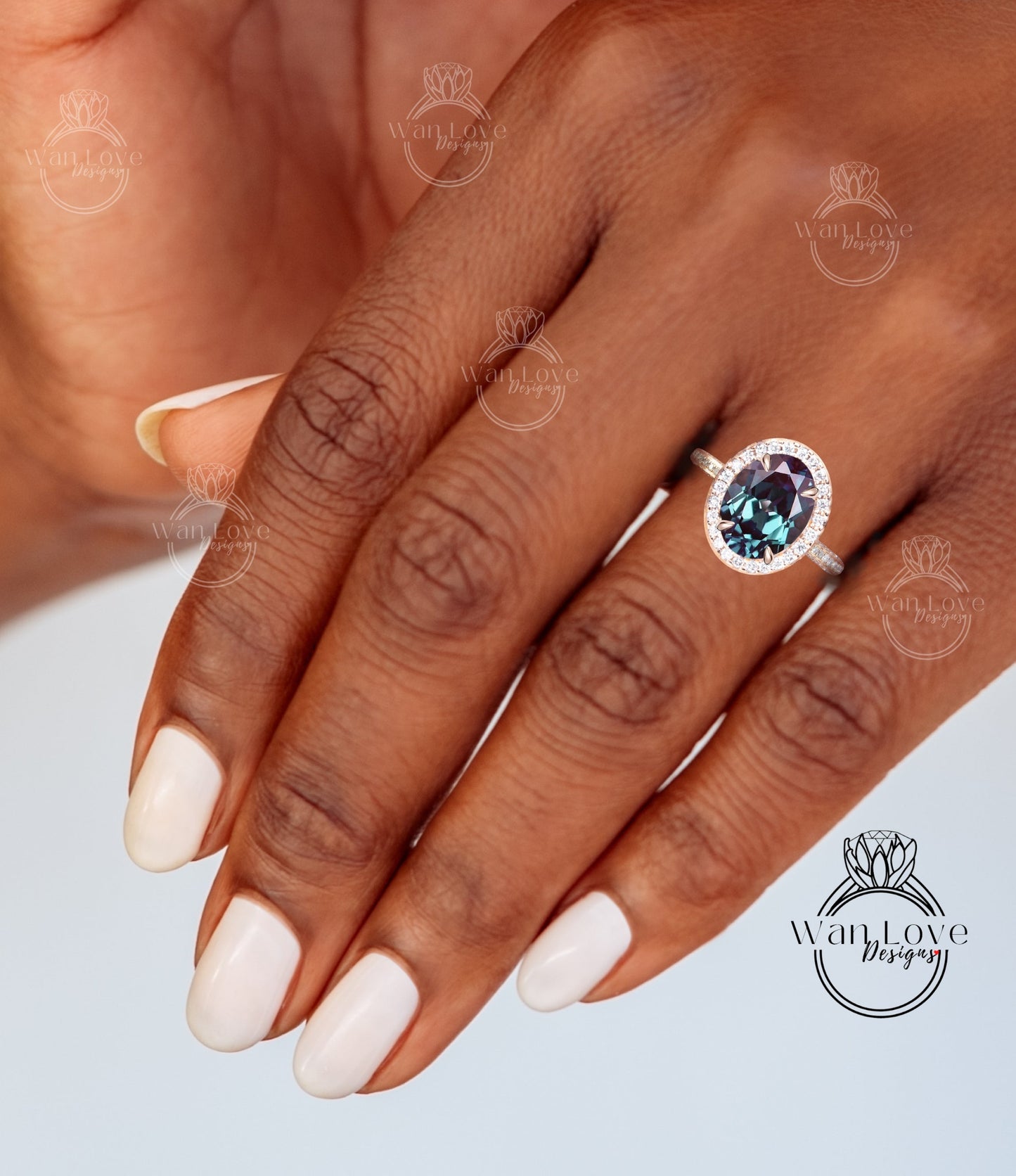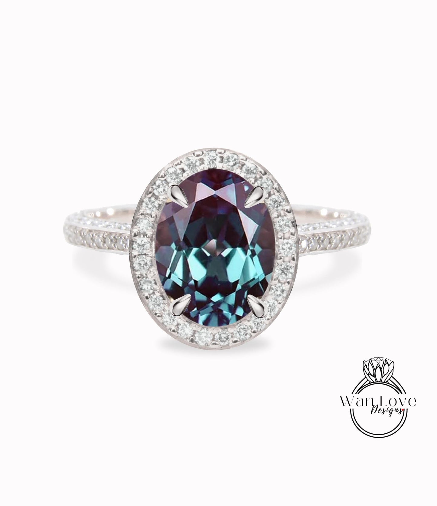 Alexandrite & Diamond Oval Halo 3 sided Engagement Ring, 14k 18k White Yellow Rose Gold, Platinum, Wedding, Anniversary Gift