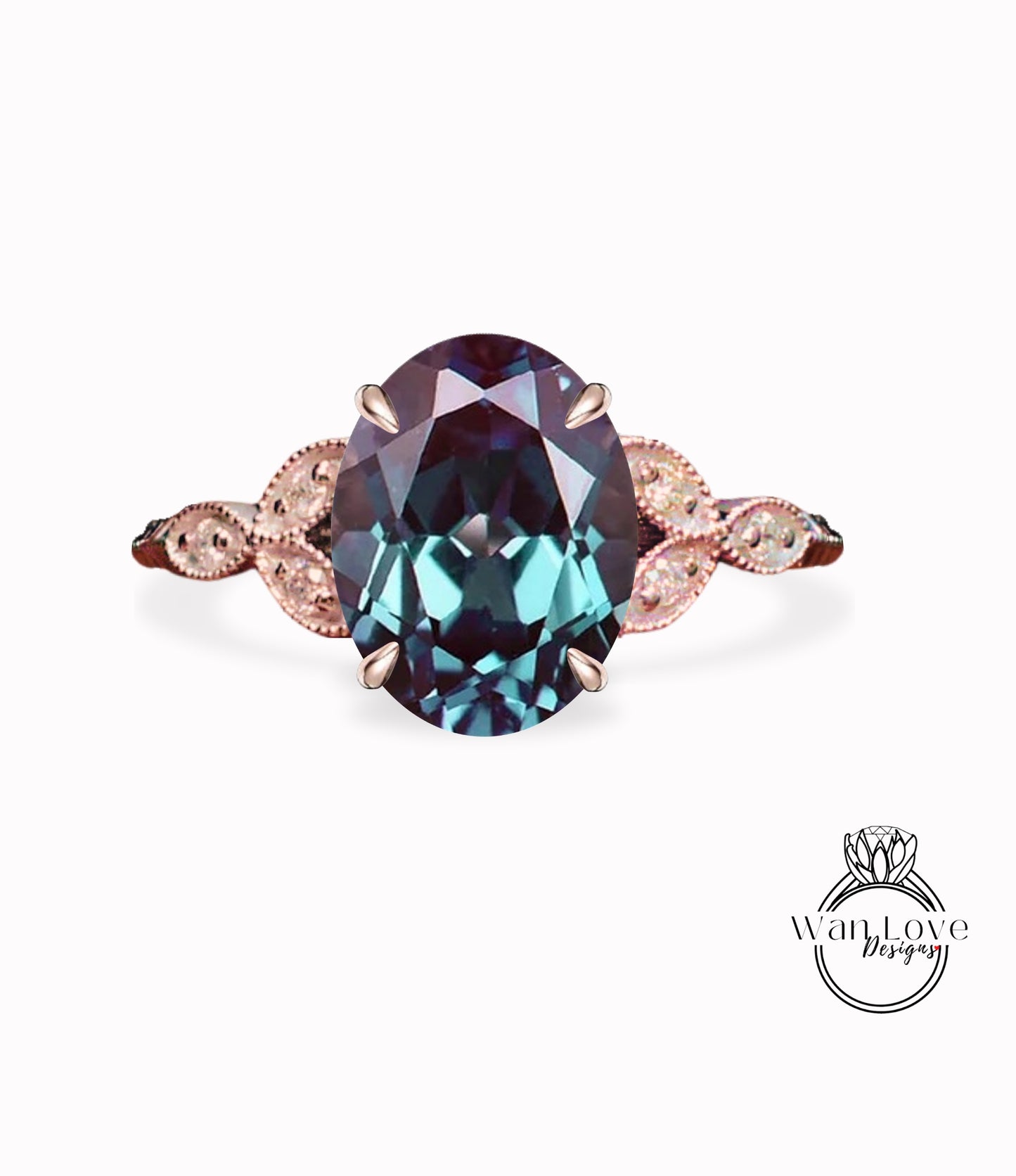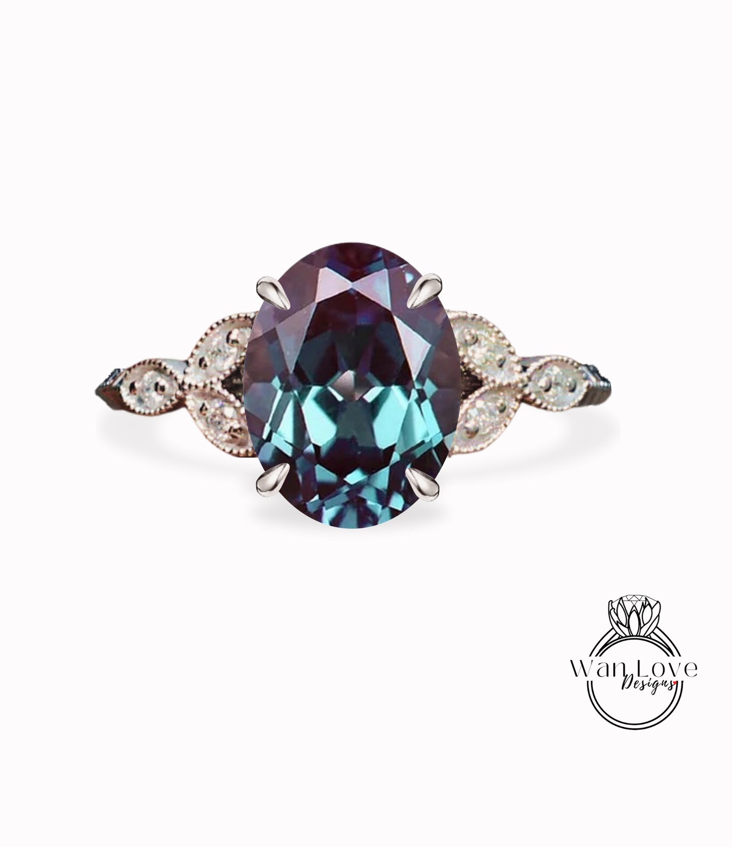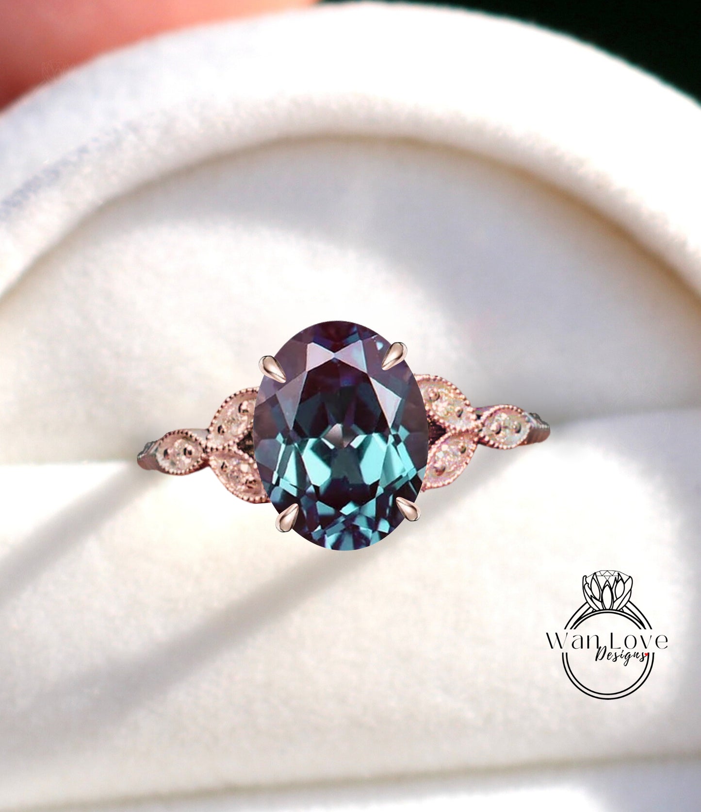 Alexandrite & Diamond Oval Leaf Antique Cluster Engagement Ring Milgrain or Smooth 14kt 18kt Solid Gold Platinum Custom Wedding Anniversary