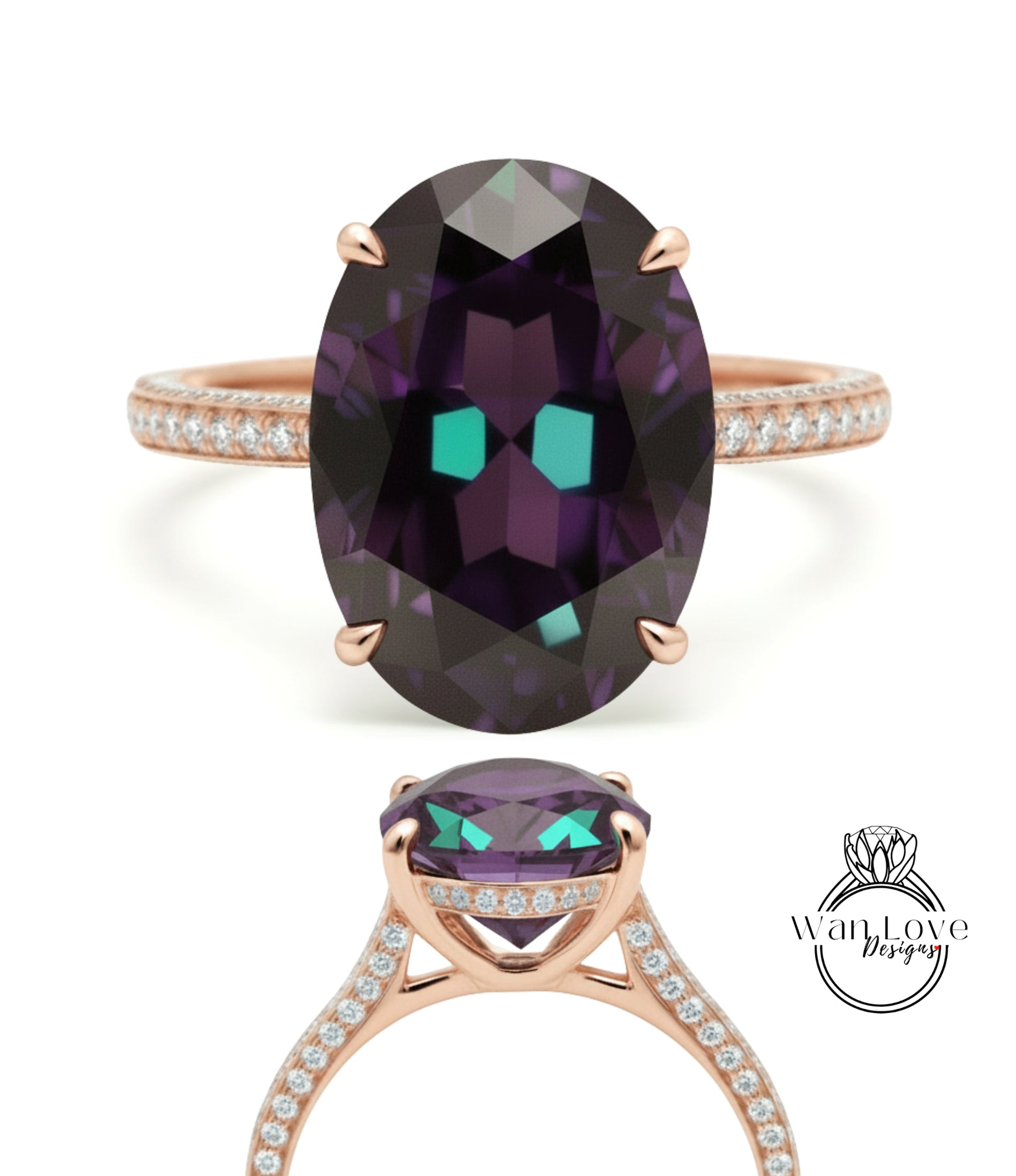 Alexandrite & Diamond Oval side halo 3 sided Almost eternity shank band Engagement Ring 14k/18k Rose White Gold, Celebrity Elongated Oval Bridal wedding Ring, Anniversary Gift