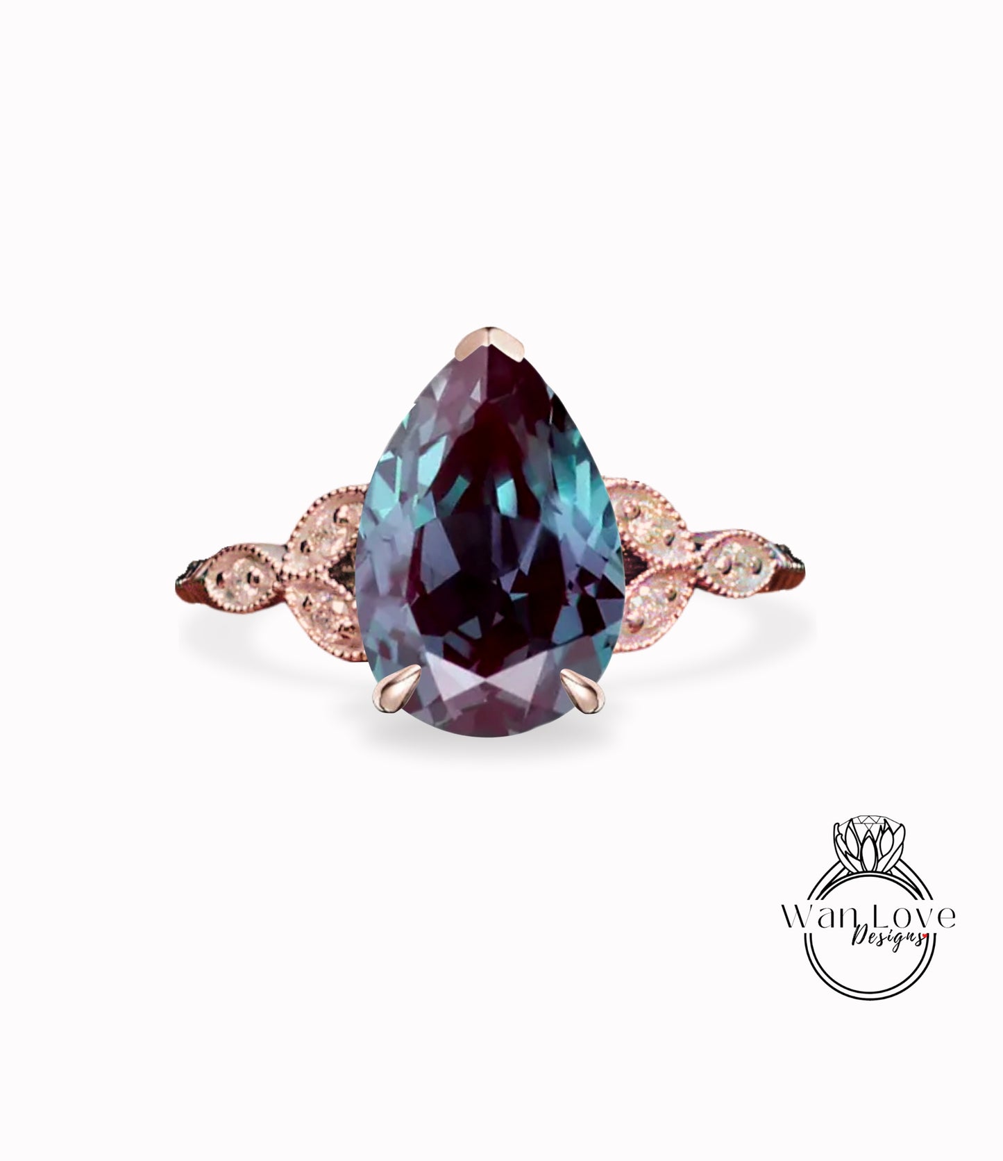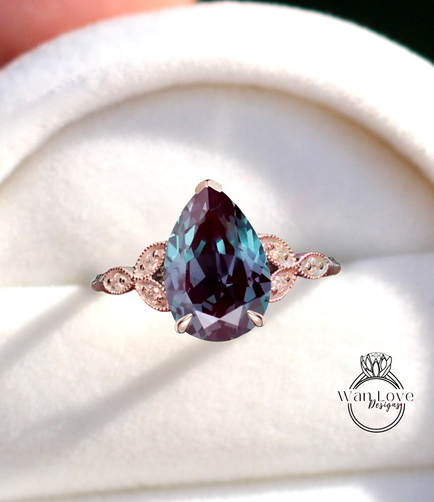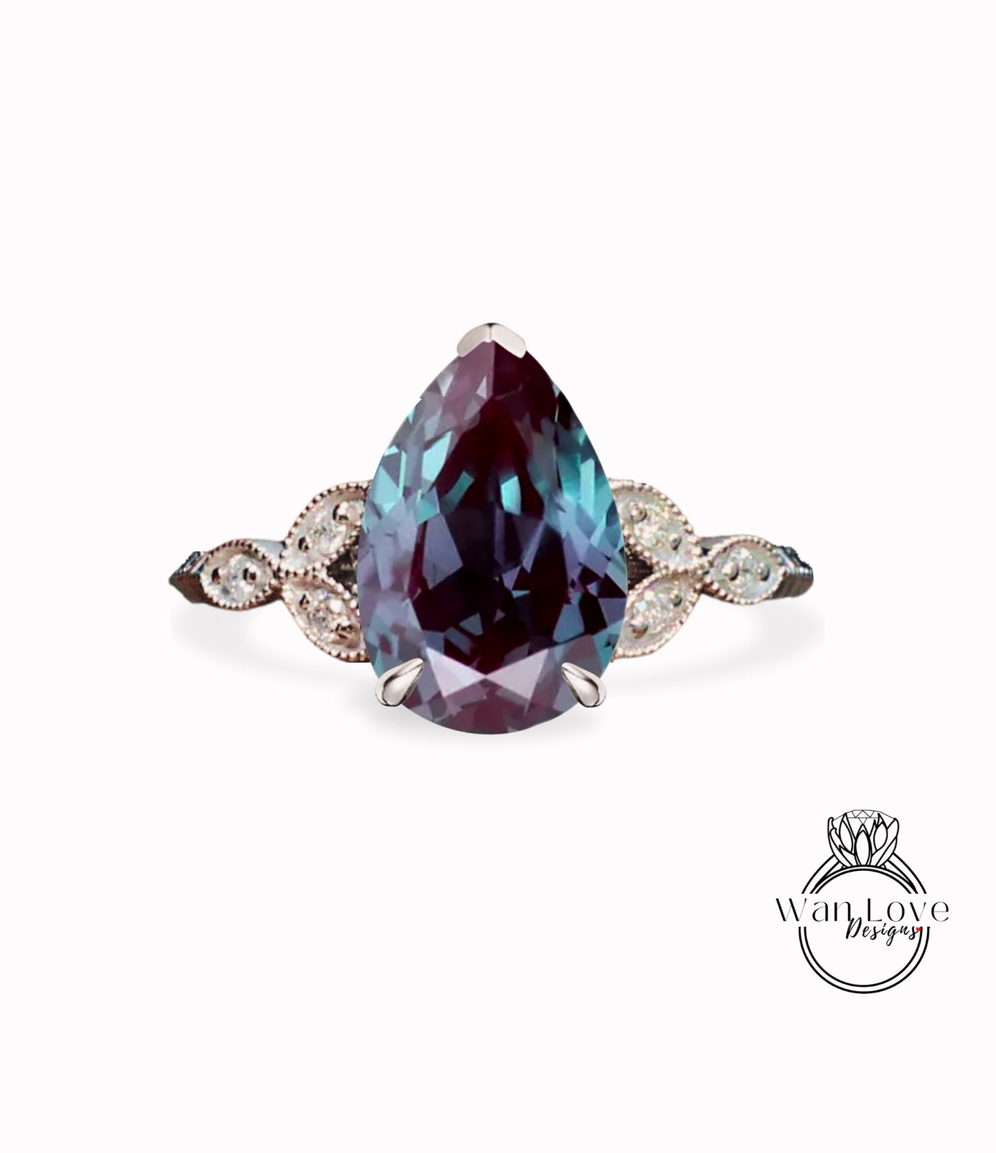 Alexandrite Diamond Pear Leaf Antique Cluster Engagement Ring Engraved Milgrain or Smooth 14kt 18kt Gold Platinum Custom Wedding