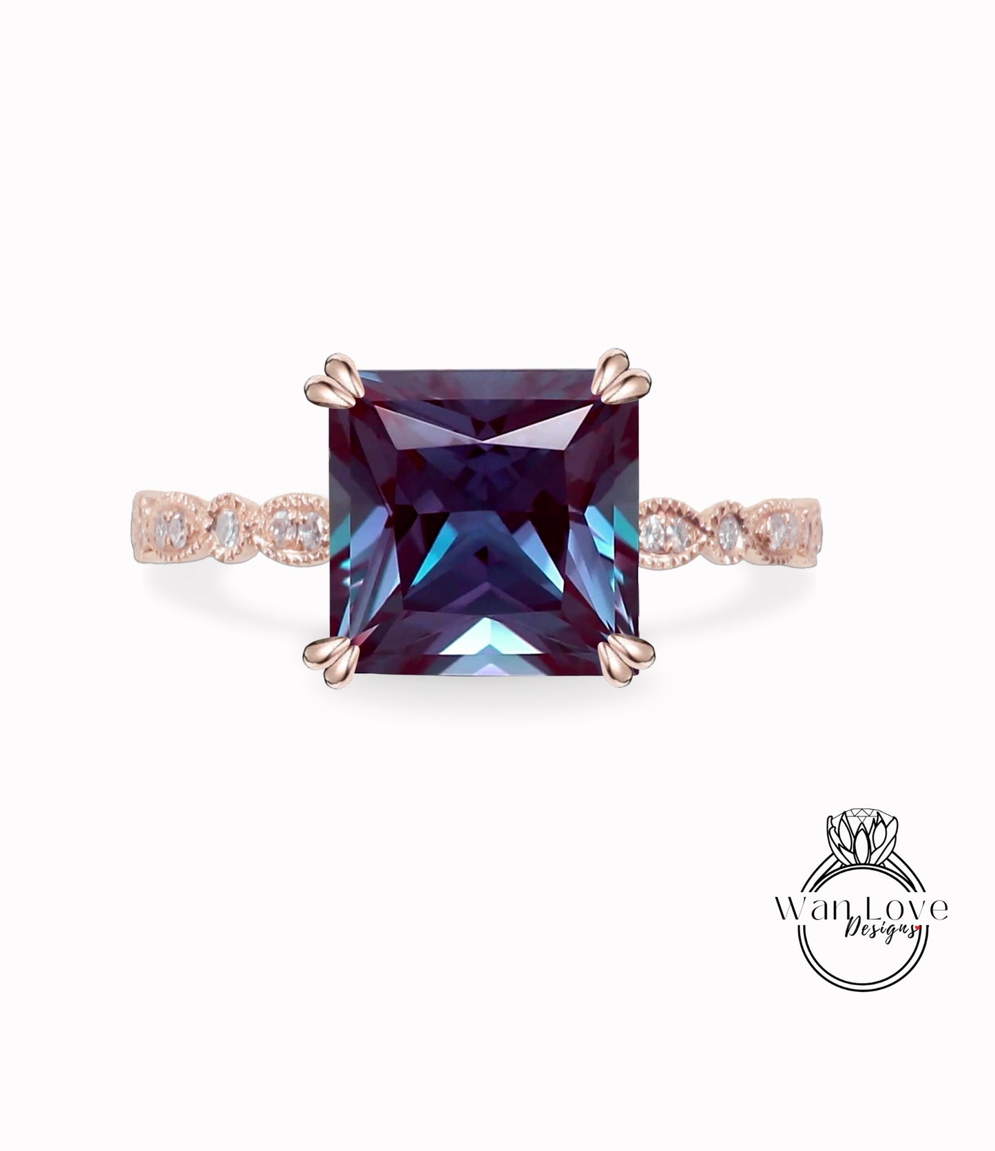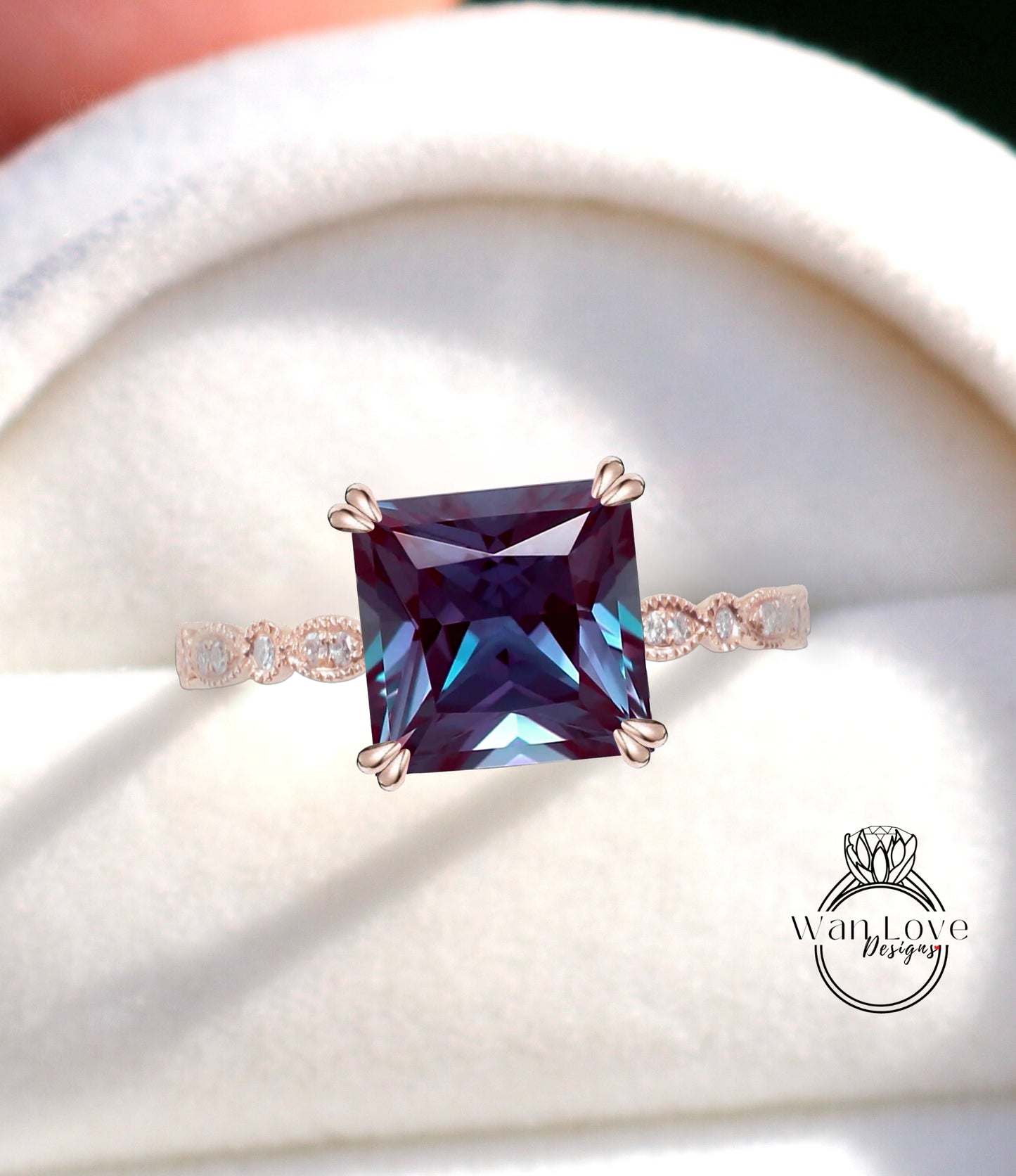Alexandrite & Diamond Scalloped Princess Engagement Ring-Square-Cathedral Custom-14k 18k Gold-Platinum, Bridal Wedding ring-Anniversary gift